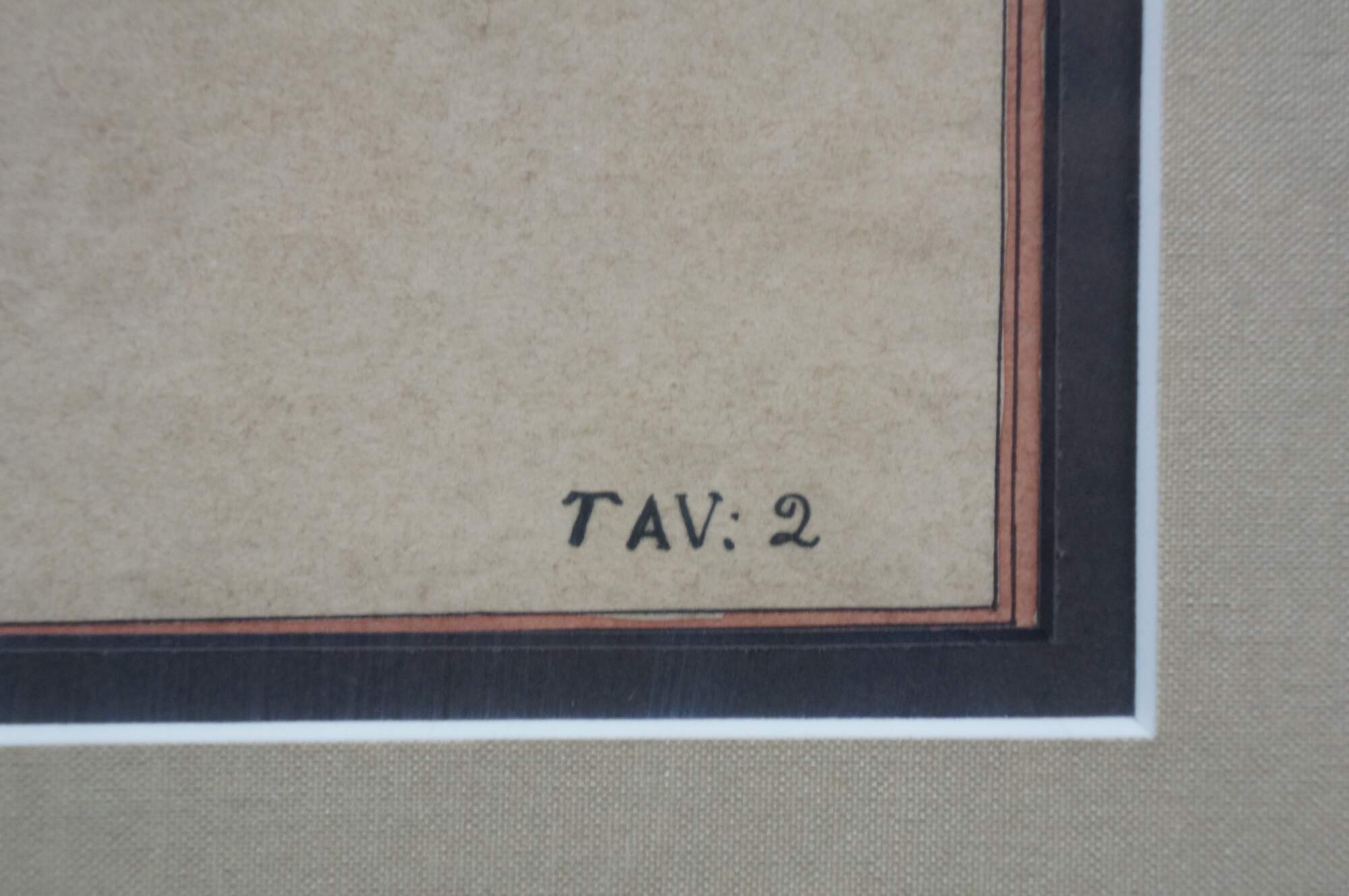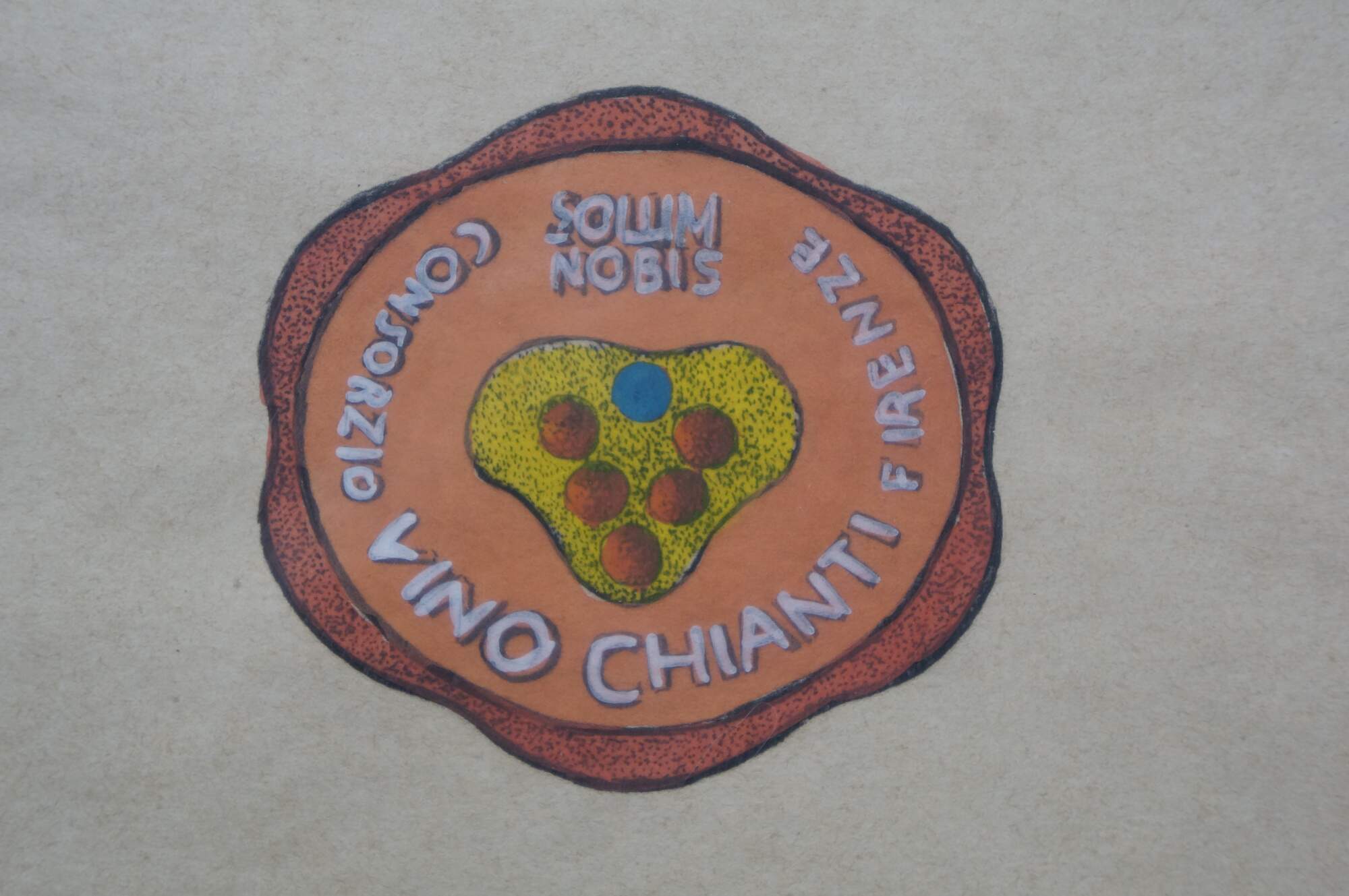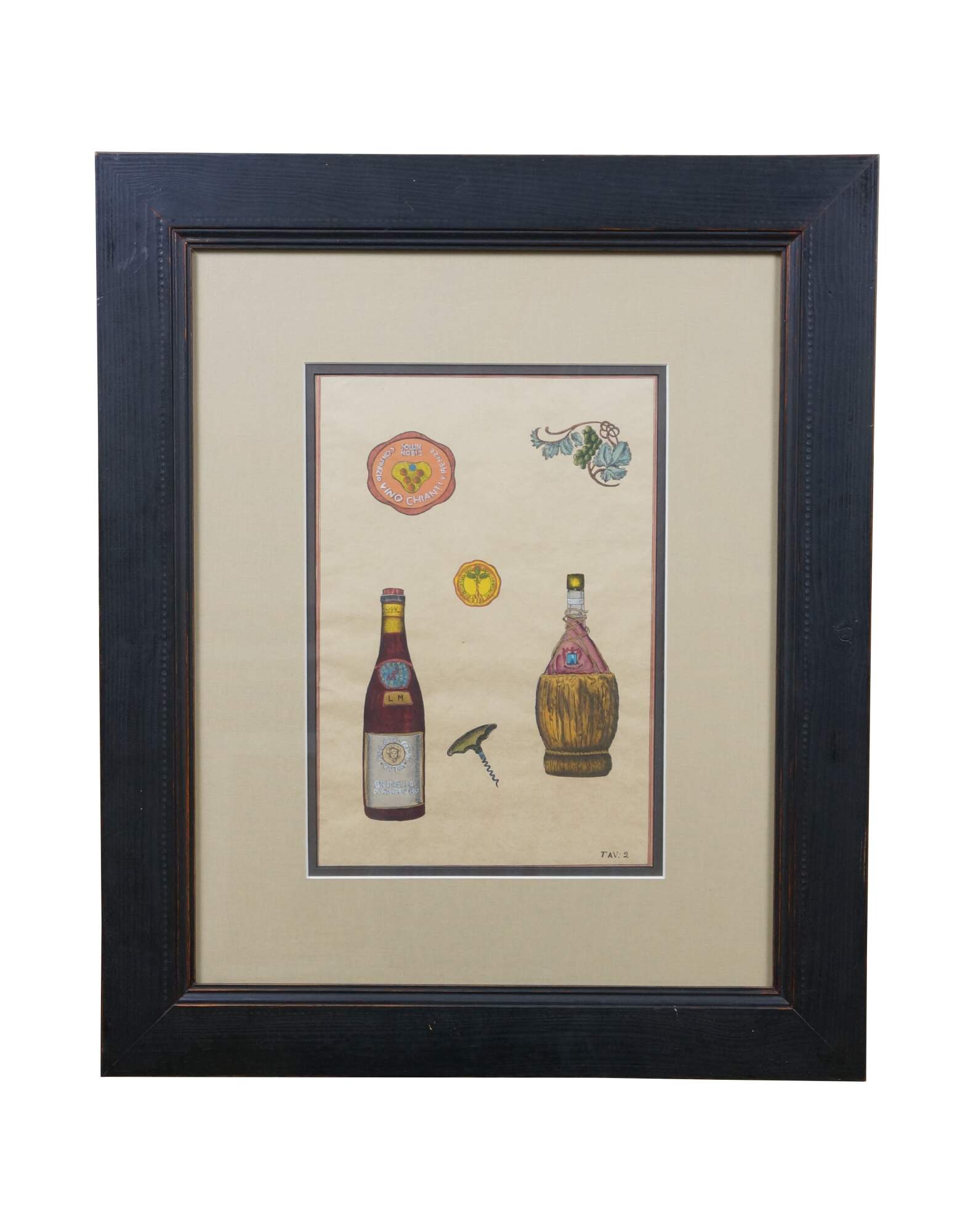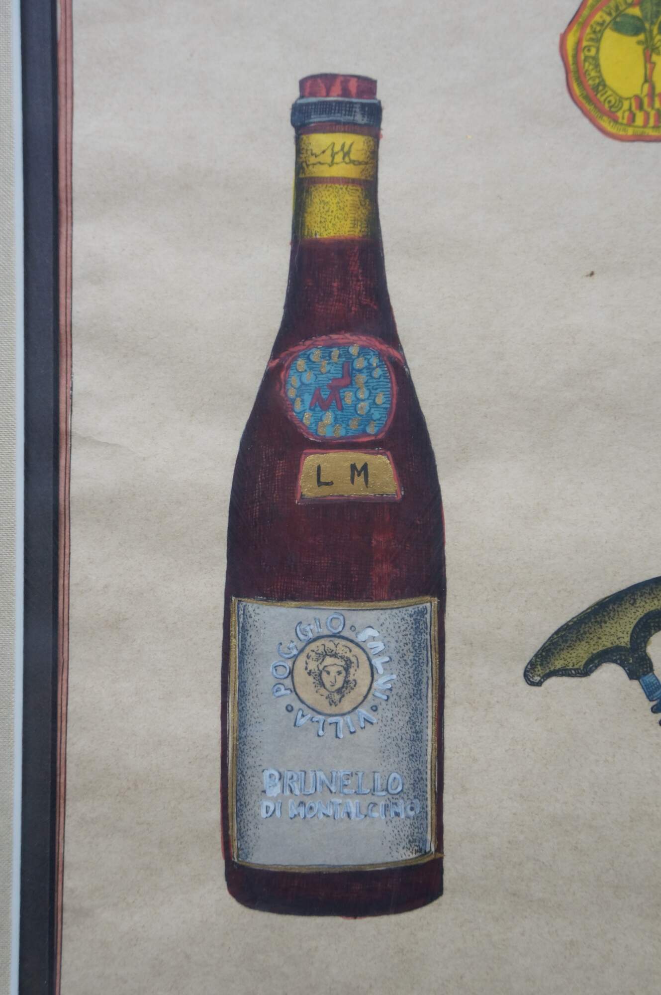 Early 21st century Italian hand colored print depicting an array of wine bottles, grapes / grapevines, corkscrew and labels. Black painted wood frame; black and beige linen layered mat. Brunello Di Montalcino, Chianti. Original engraving from 1900 created by Maestro Virgilio Naldini