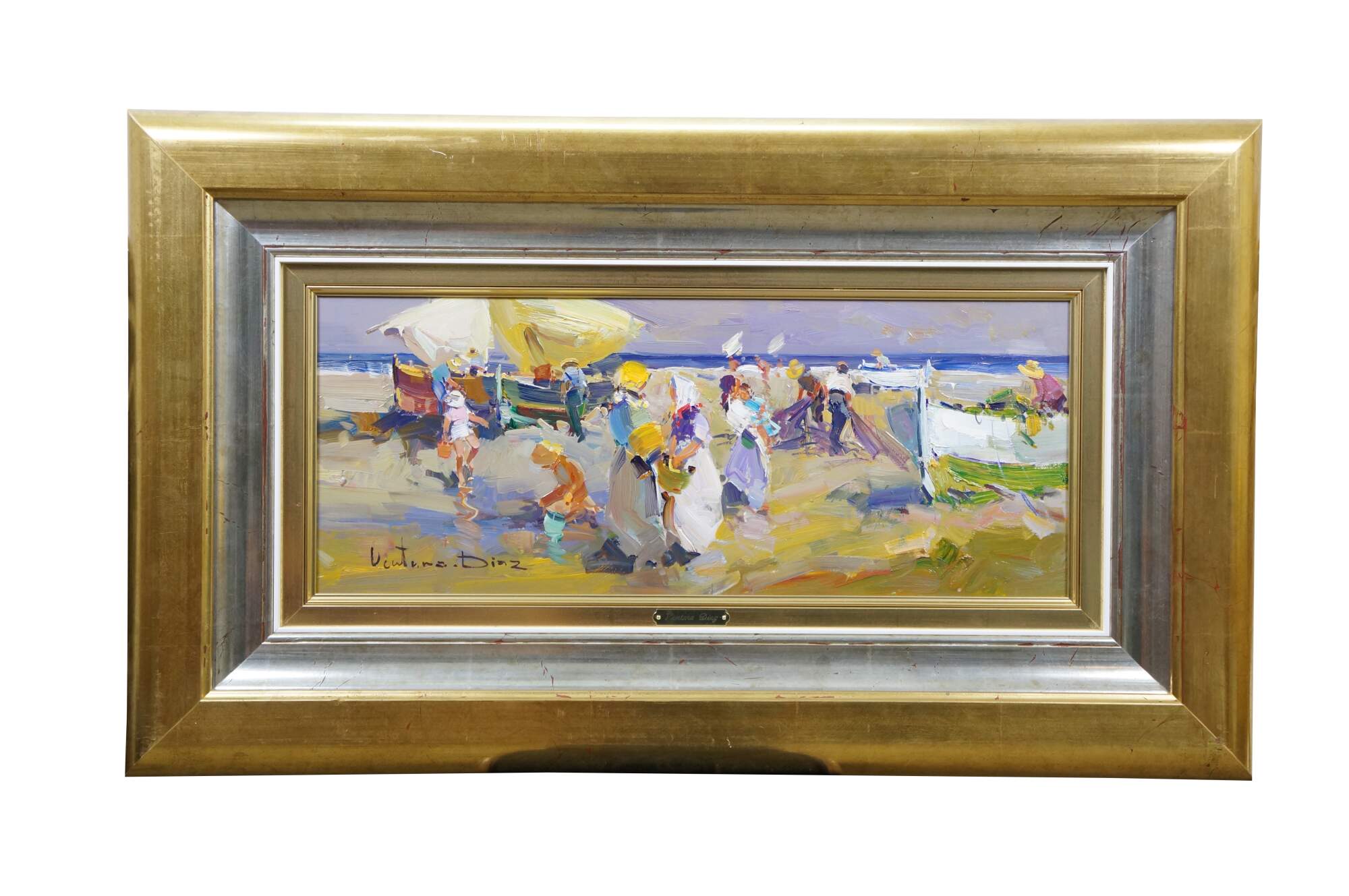 Late 20th century oil on canvas impressionist painting titled "Fisherman" by Ventura Diaz. Depicts a beach landscape filled with figures and boats. Signed, lower left. Silver and gold giltwood frame; brass plaque with artist's name at center.