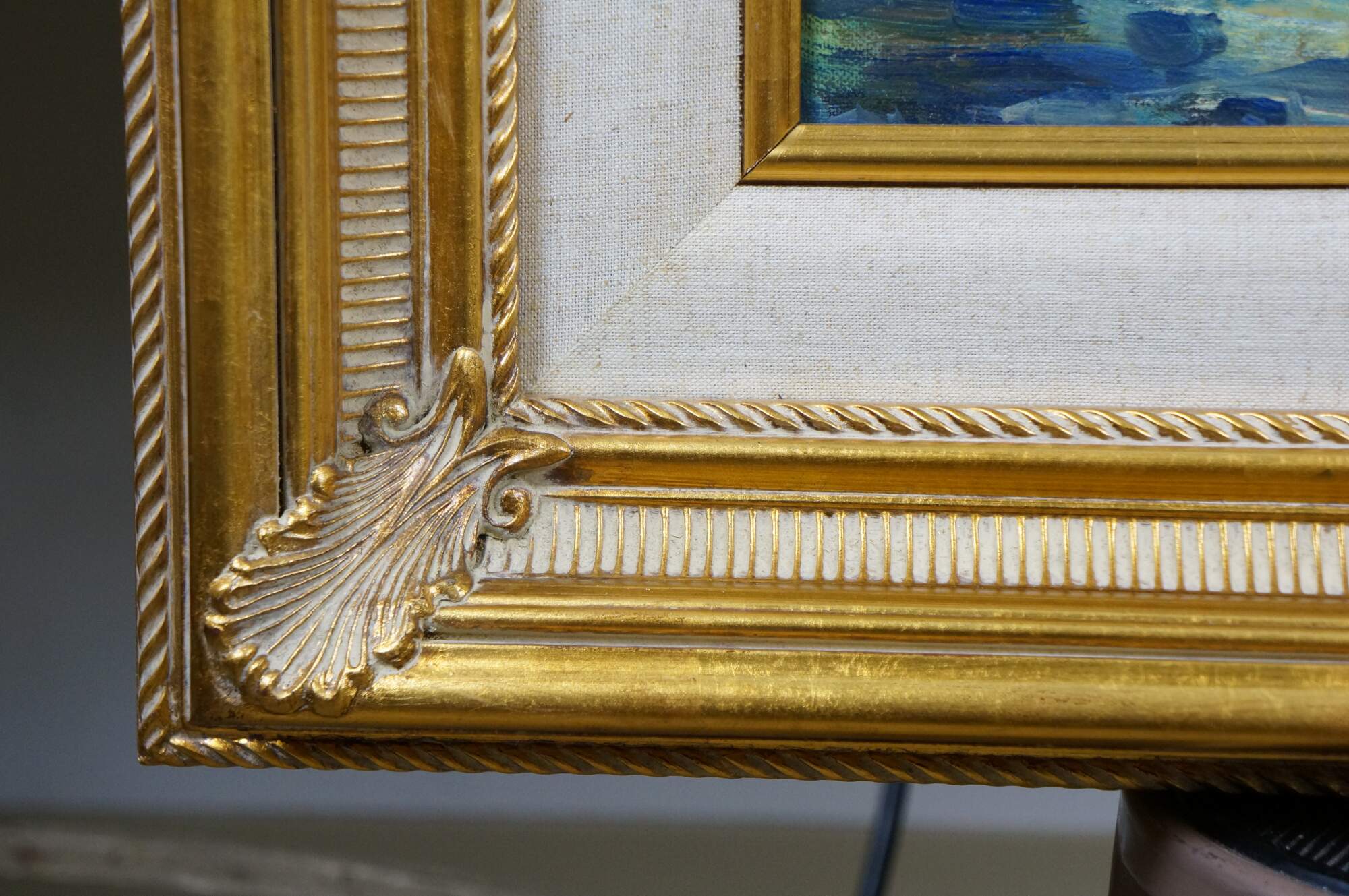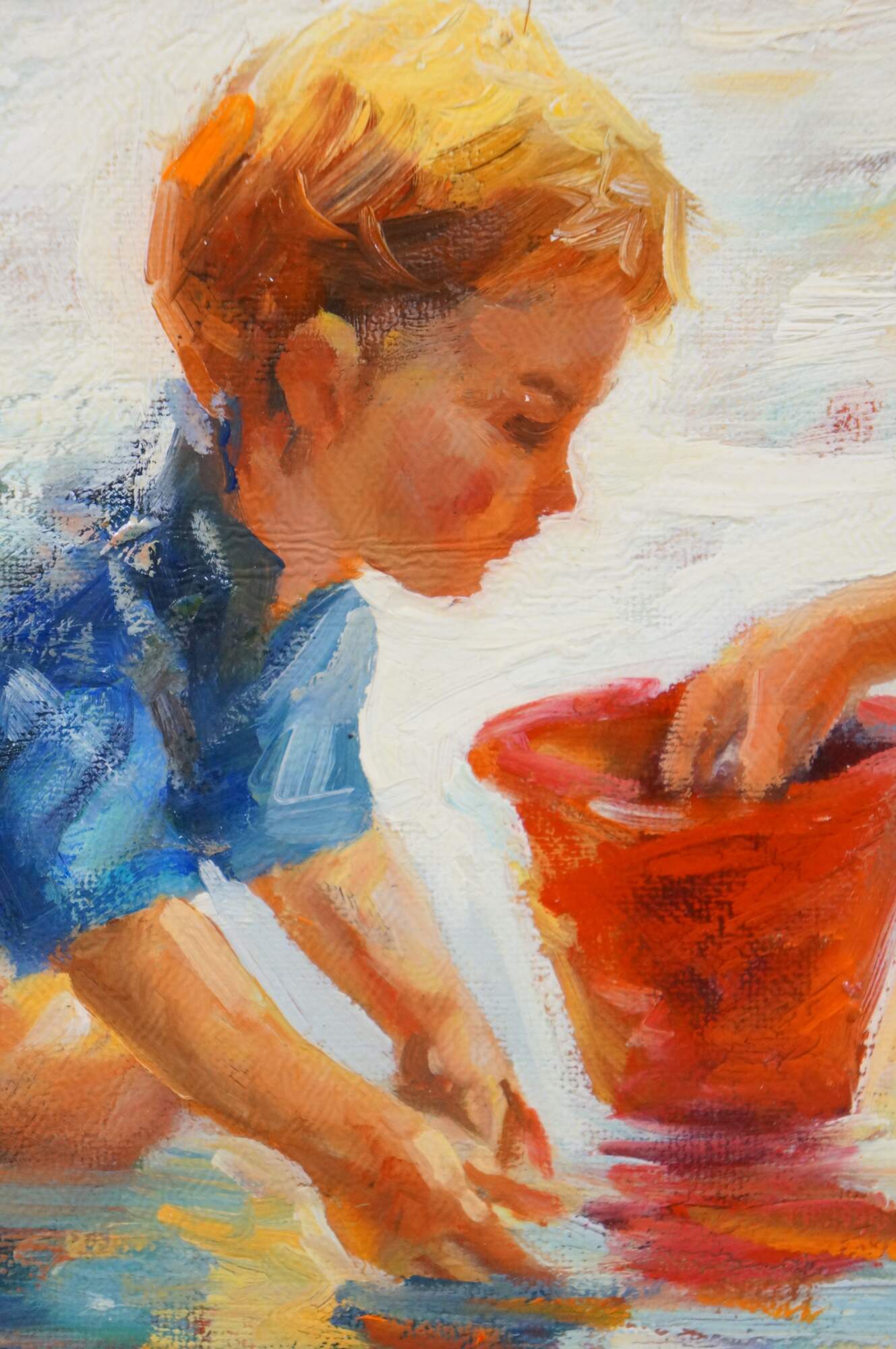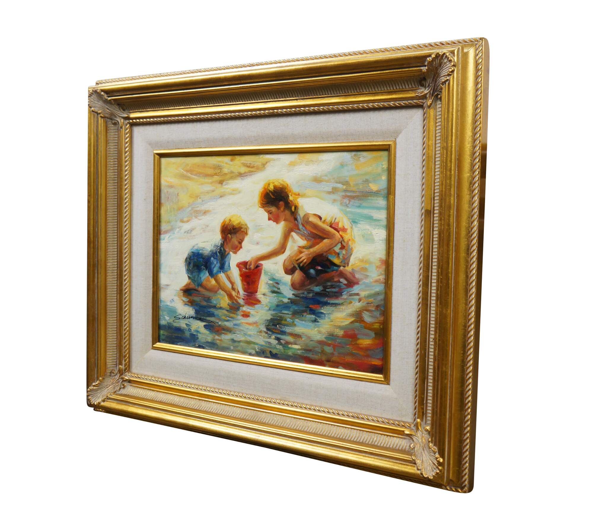 Late 20th century oil on canvas impressionist style seascape painting depicting a pair of children digging for shells on the beach. Produced for Timeless Treasures. Signed, lower left. Gilt wood & gesso frame with linen border. Certificate of Authenticity Number AFD157765.