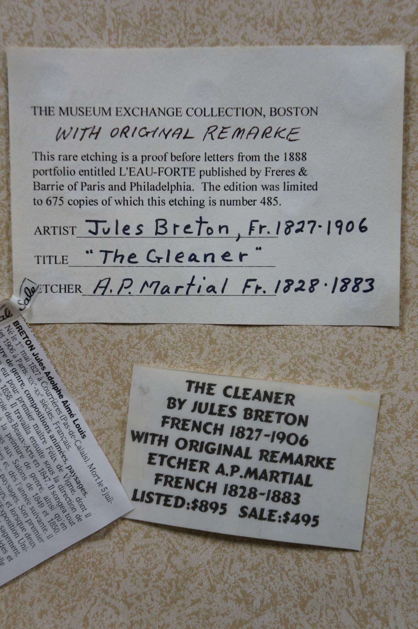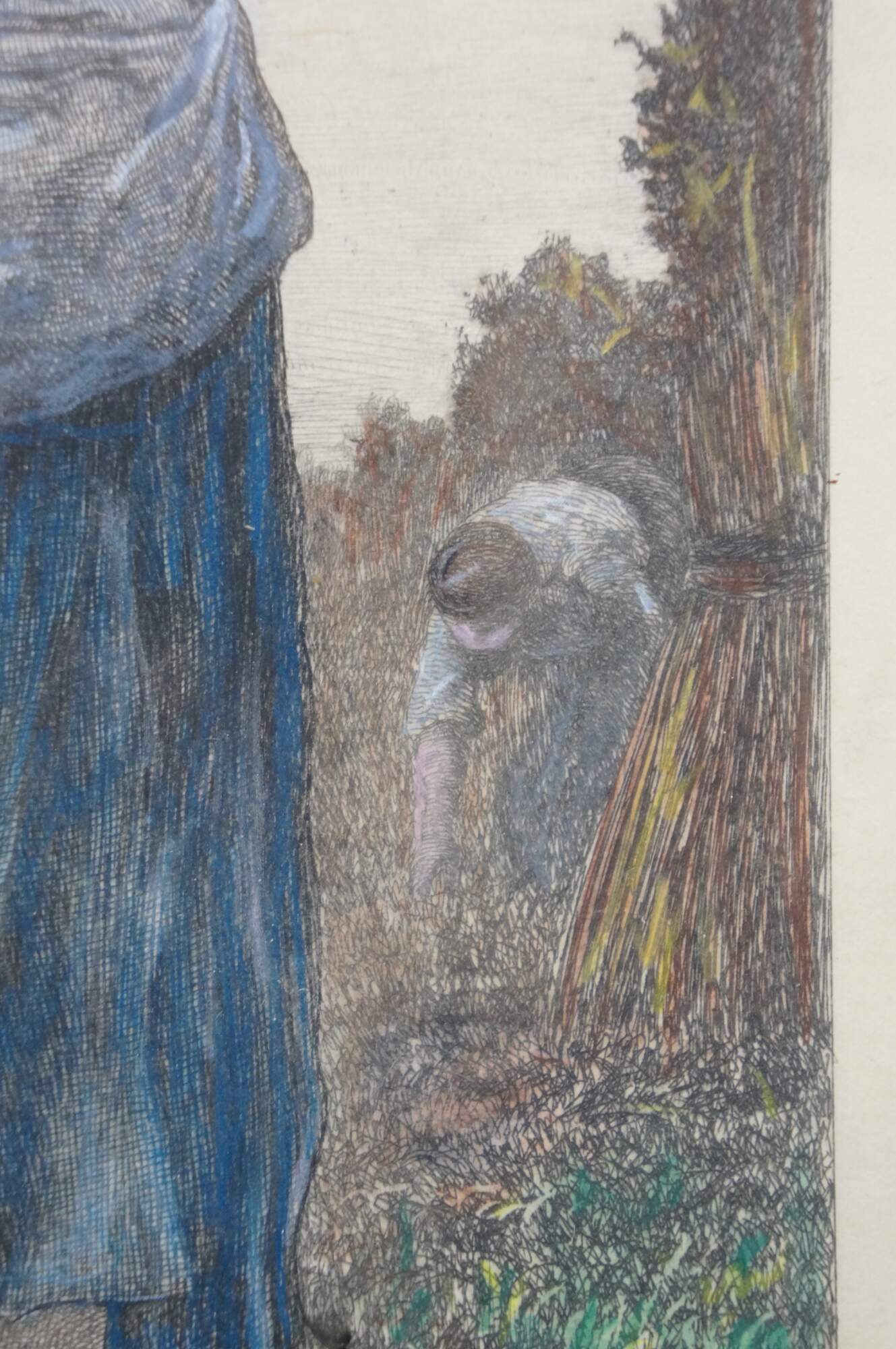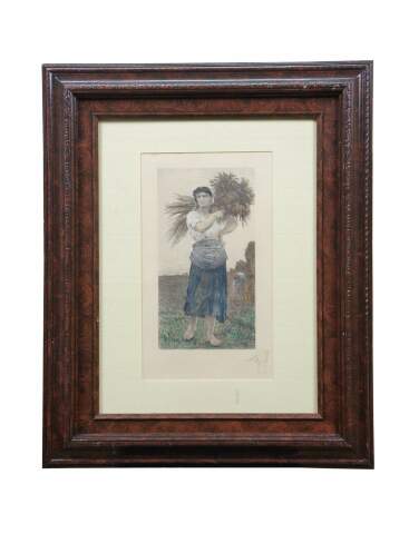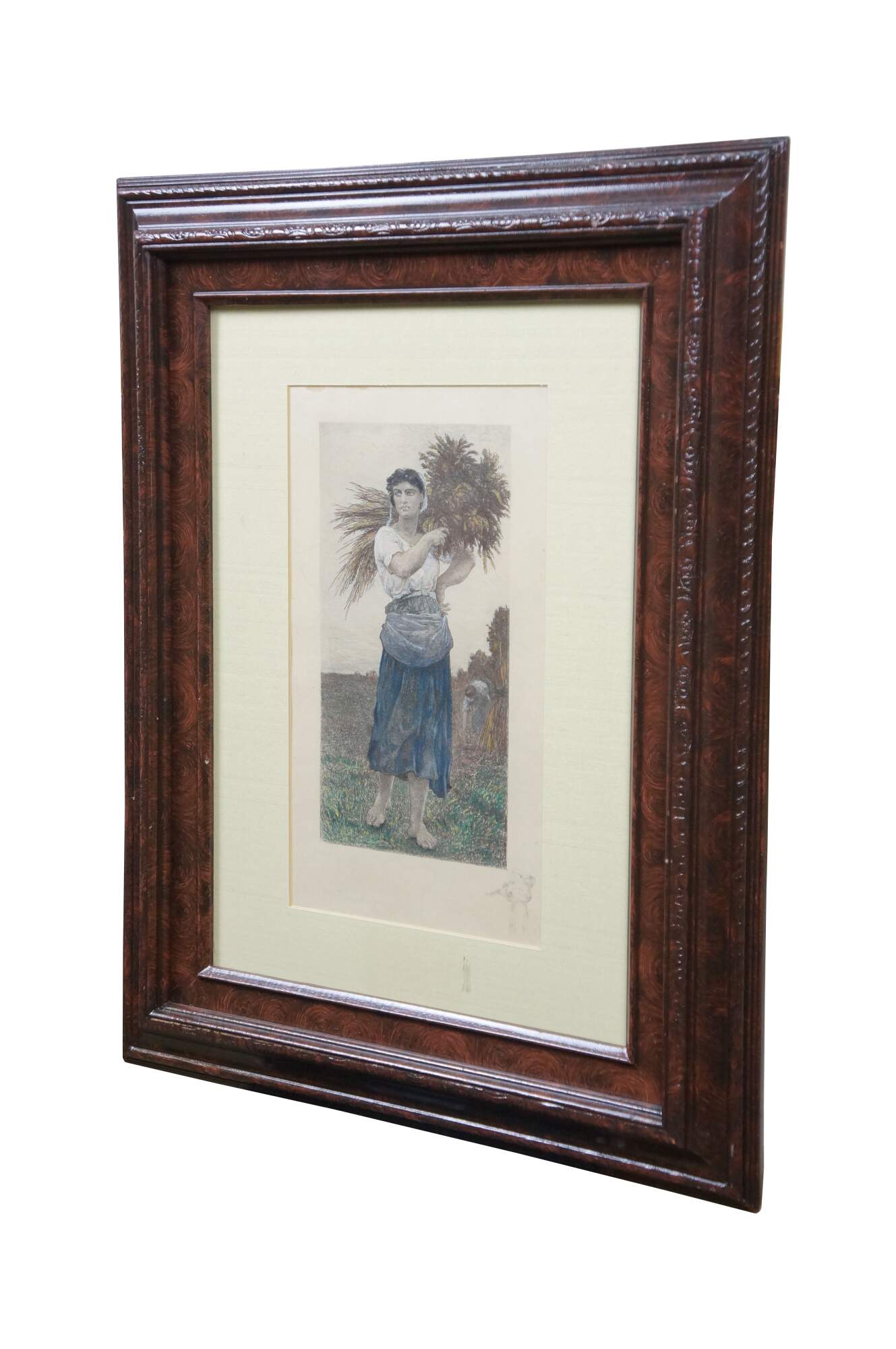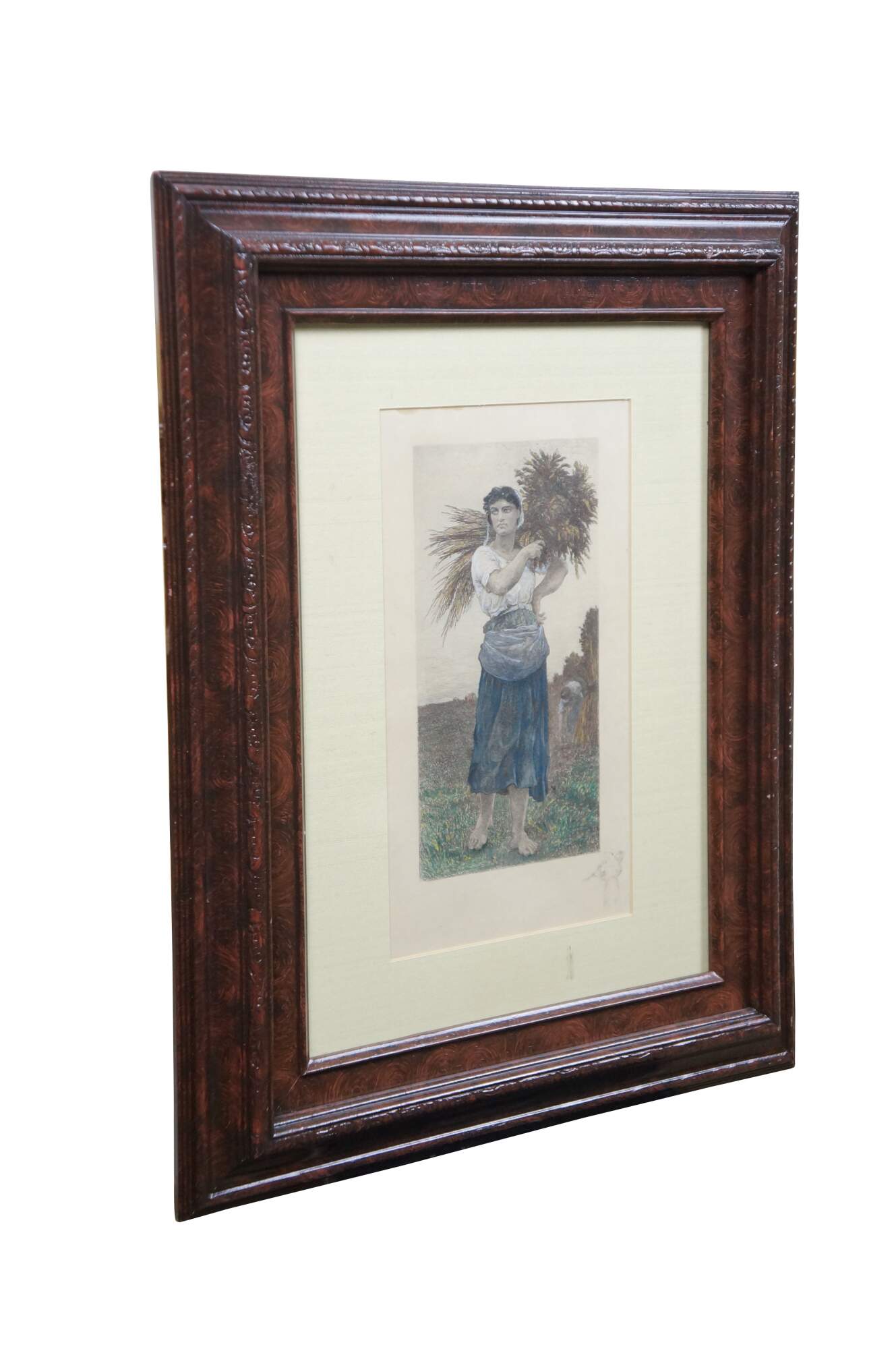Late 19th century hand colored etching titled "The Gleaner" by Jules Breton. One of many works by Breton featuring gleaners, this etching shows a woman in bare feet and blue skirts, carrying a bundle of grain on her shoulder. Etcher A.P. Martial. From "L'eau-Forte Japan Edition - Limited to 675 Copies - No. 485." Published by Barrie Freres / George Barrie 1888. Remarke of a woman putting on a jacket (pose identical to "The Tired Gleaner"), lower right. Wood frame with raised bevel and painted wood grain; white mat.