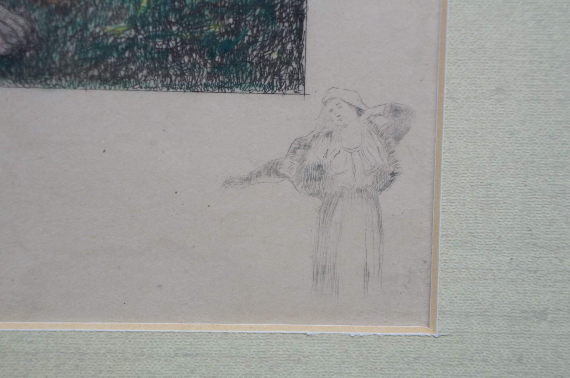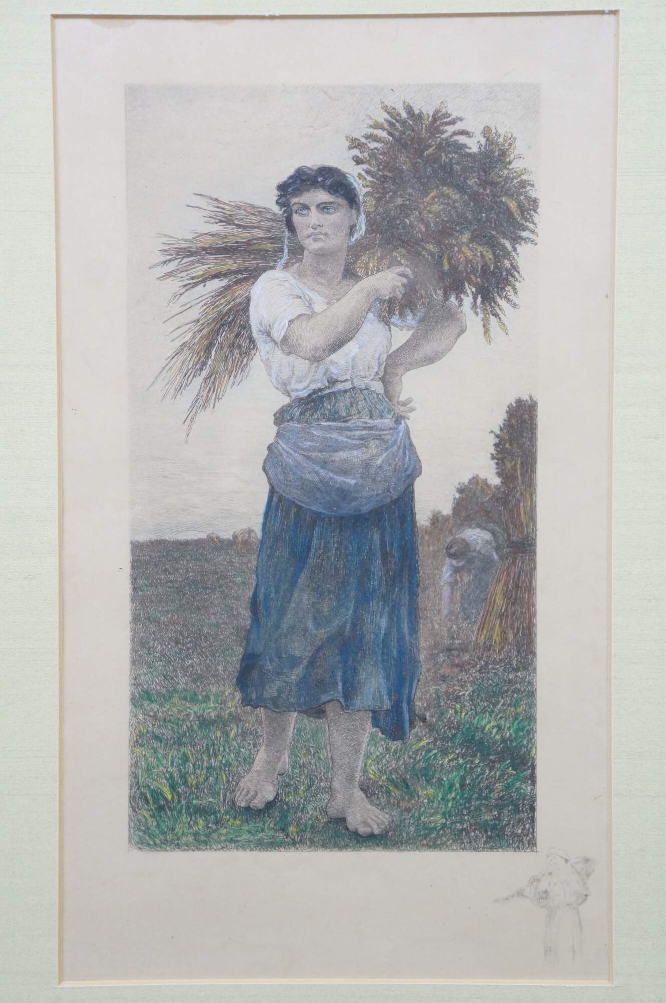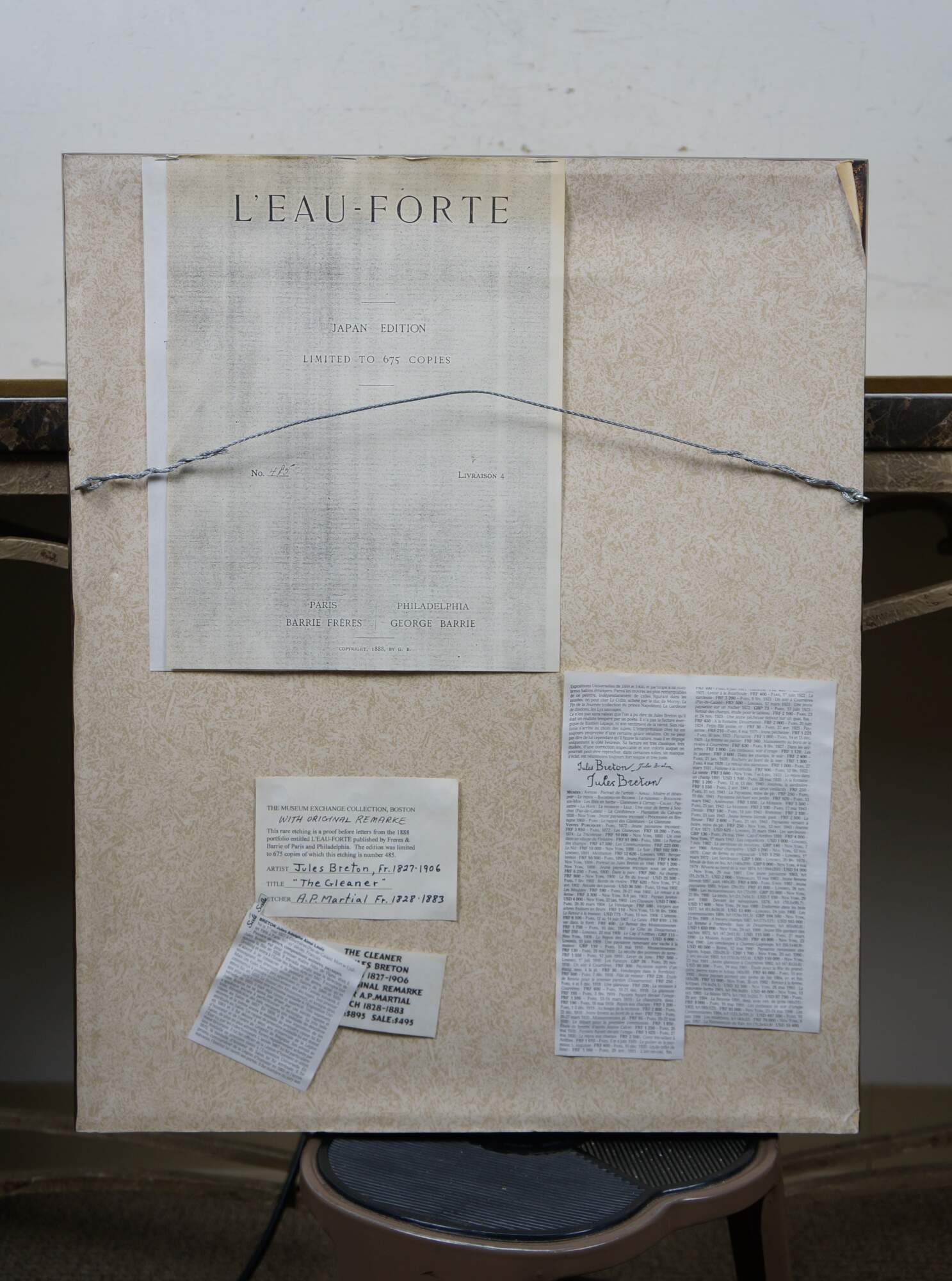 Late 19th century hand colored etching titled "The Gleaner" by Jules Breton. One of many works by Breton featuring gleaners, this etching shows a woman in bare feet and blue skirts, carrying a bundle of grain on her shoulder. Etcher A.P. Martial. From "L'eau-Forte Japan Edition - Limited to 675 Copies - No. 485." Published by Barrie Freres / George Barrie 1888. Remarke of a woman putting on a jacket (pose identical to "The Tired Gleaner"), lower right. Wood frame with raised bevel and painted wood grain; white mat.