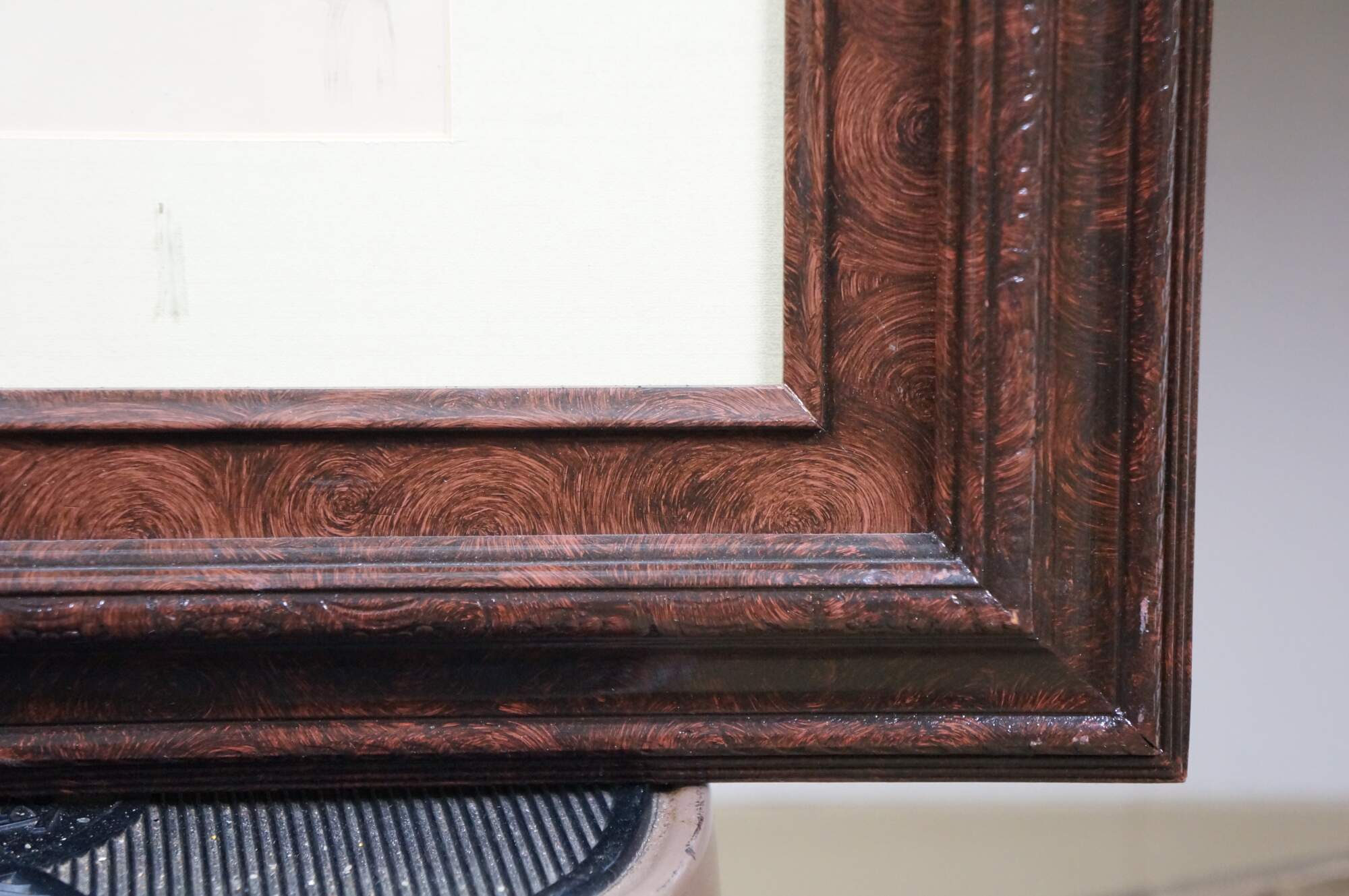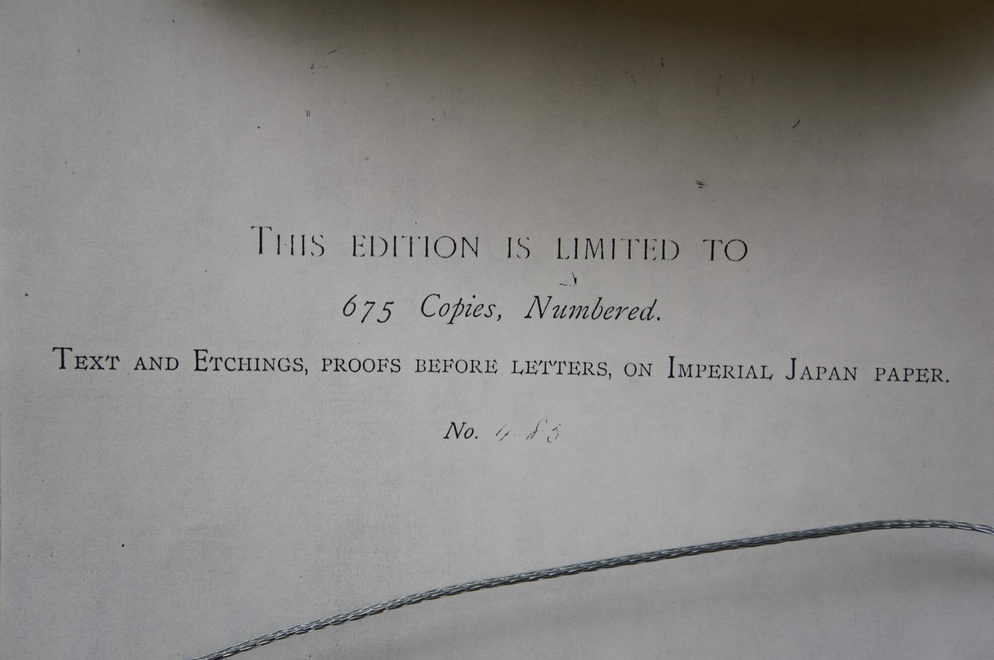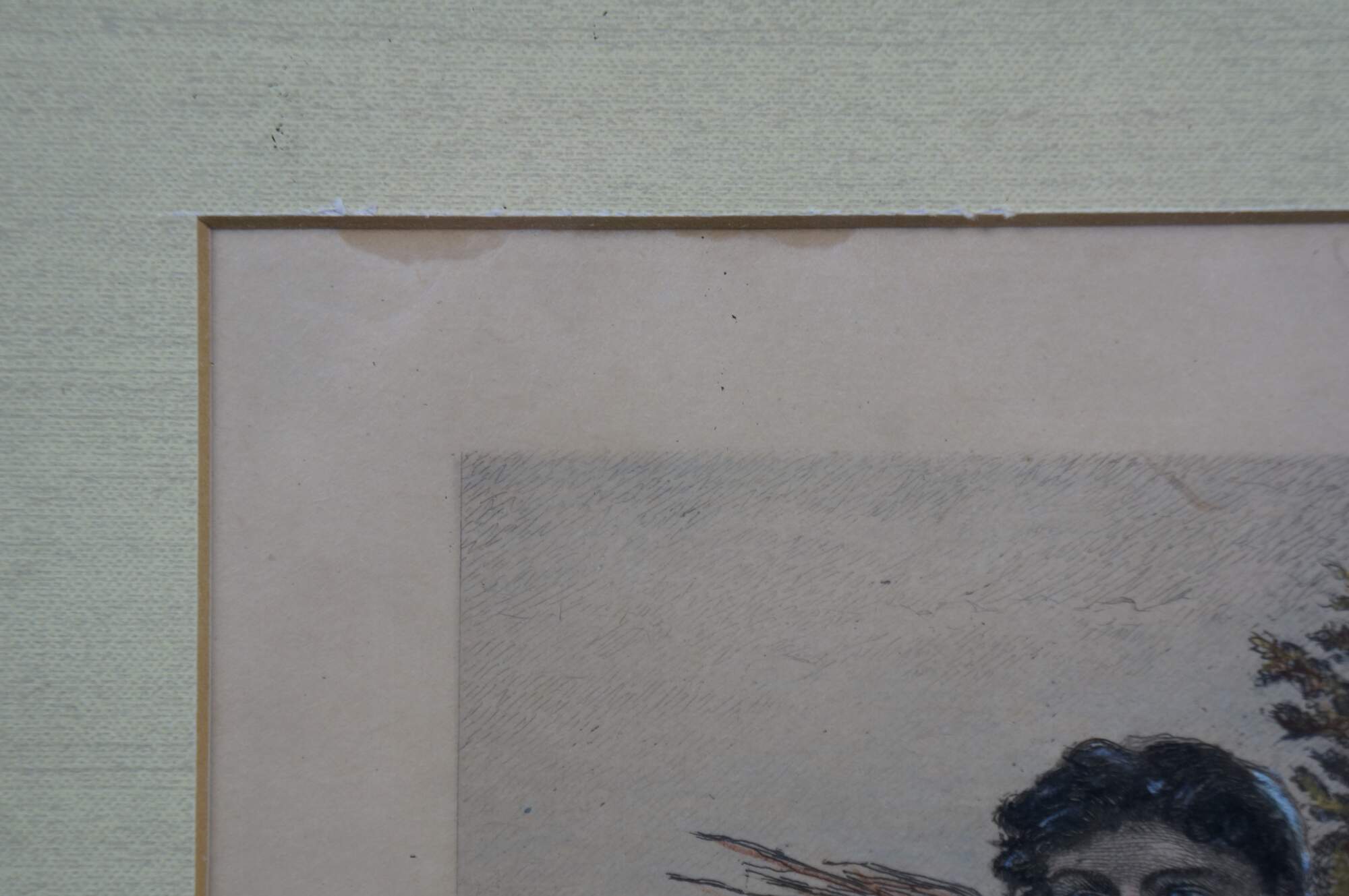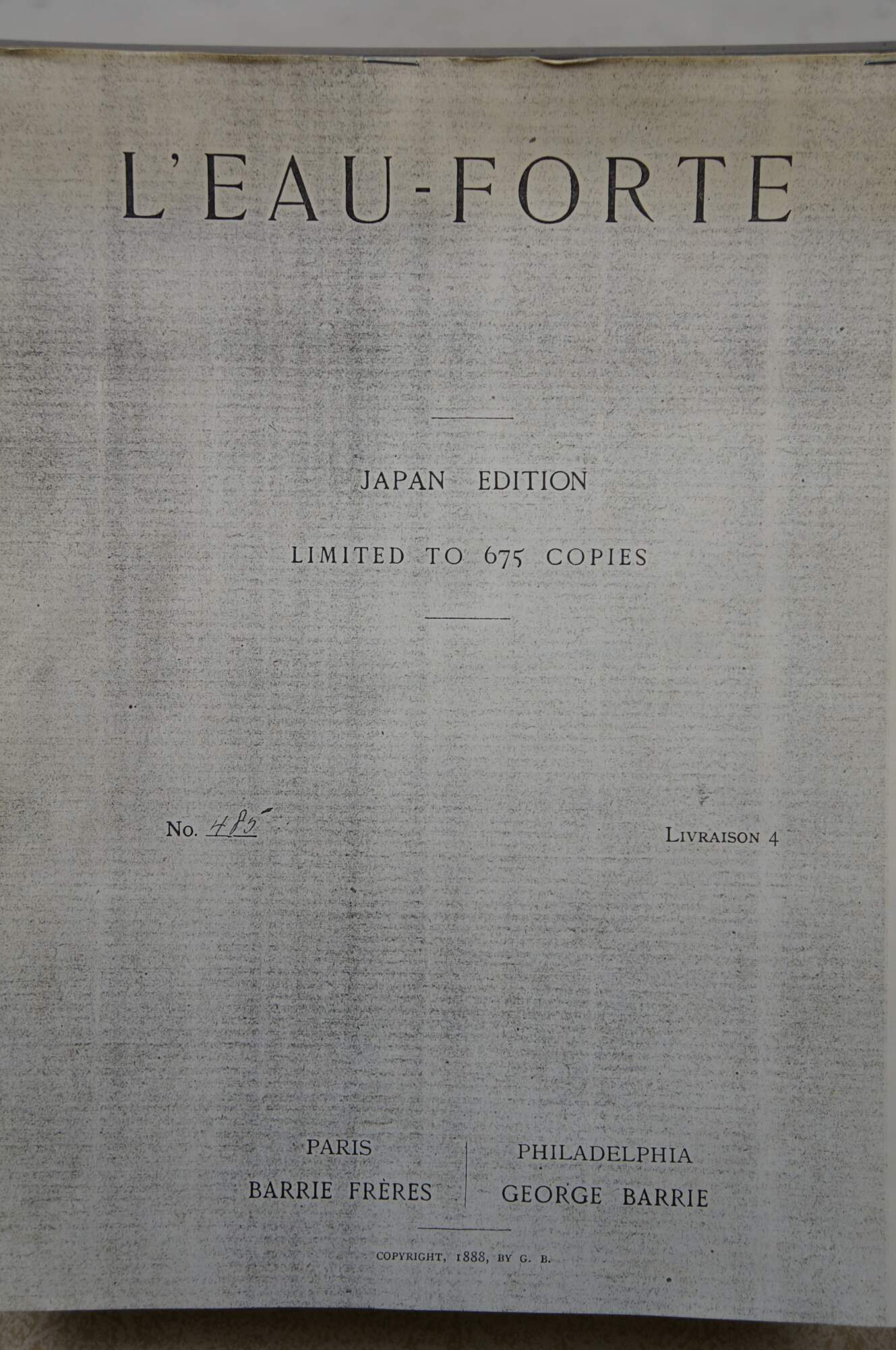 Late 19th century hand colored etching titled "The Gleaner" by Jules Breton. One of many works by Breton featuring gleaners, this etching shows a woman in bare feet and blue skirts, carrying a bundle of grain on her shoulder. Etcher A.P. Martial. From "L'eau-Forte Japan Edition - Limited to 675 Copies - No. 485." Published by Barrie Freres / George Barrie 1888. Remarke of a woman putting on a jacket (pose identical to "The Tired Gleaner"), lower right. Wood frame with raised bevel and painted wood grain; white mat.