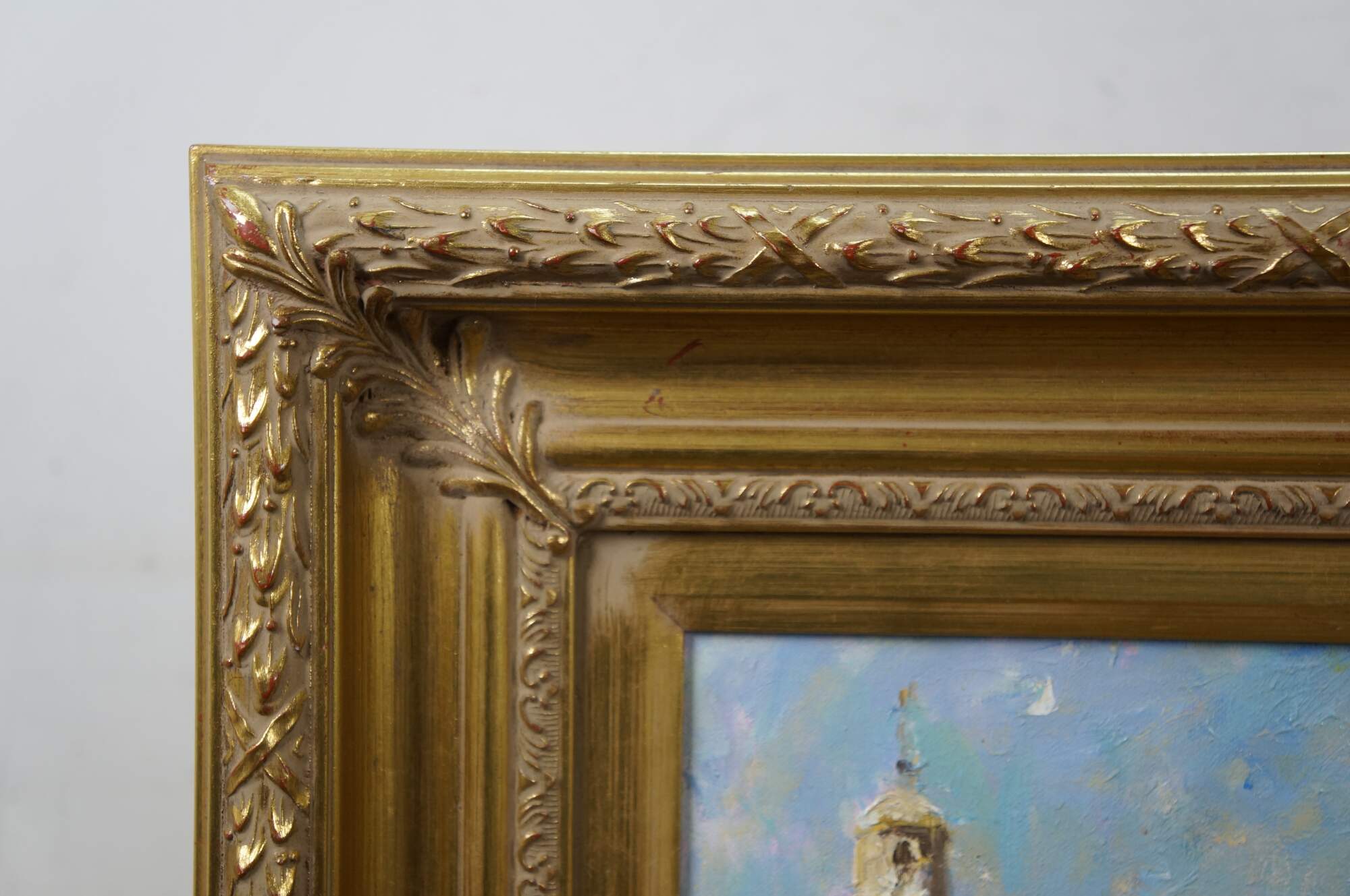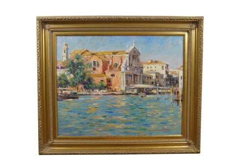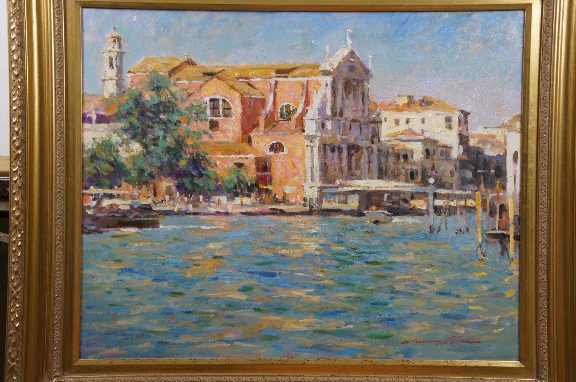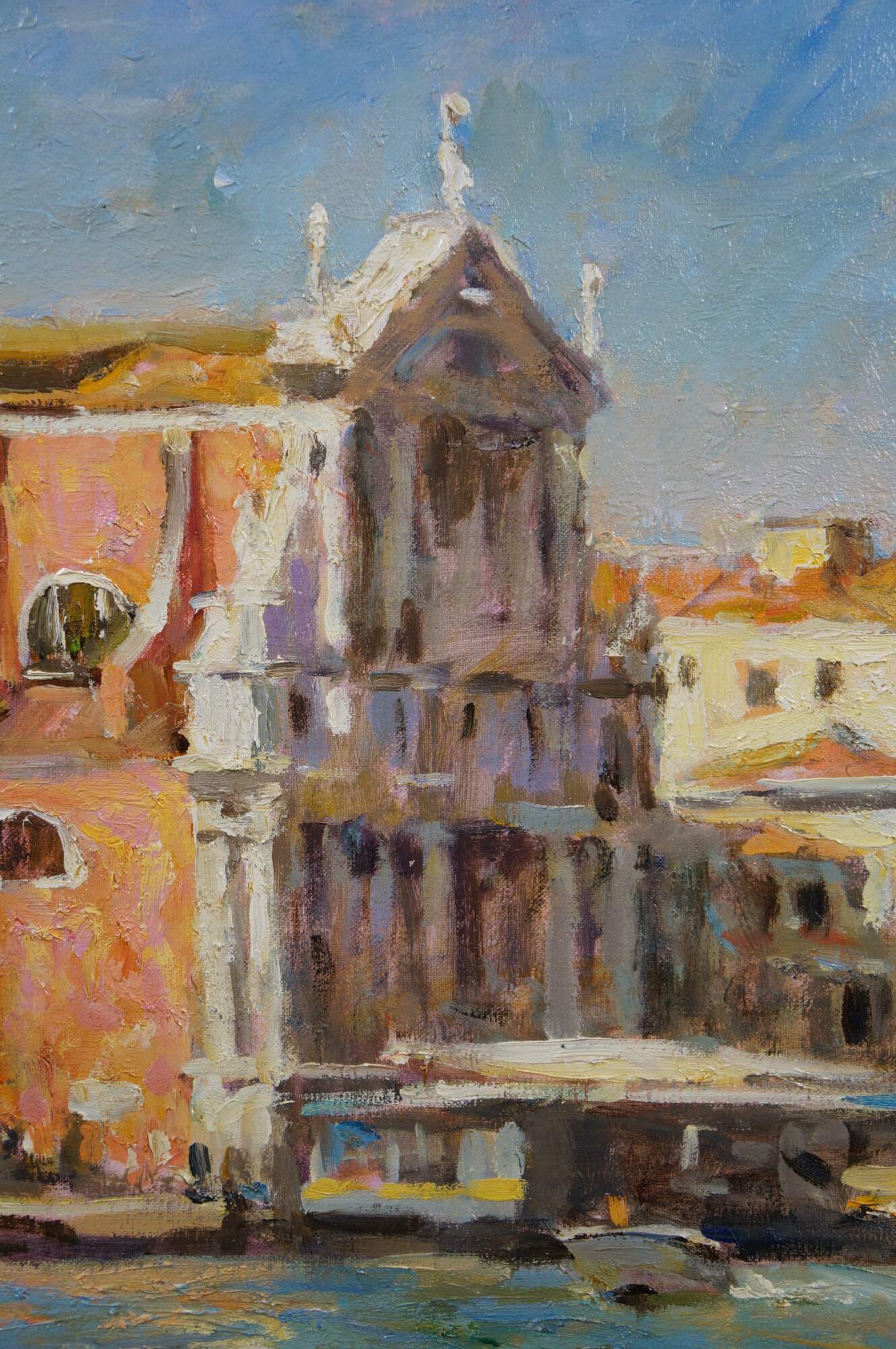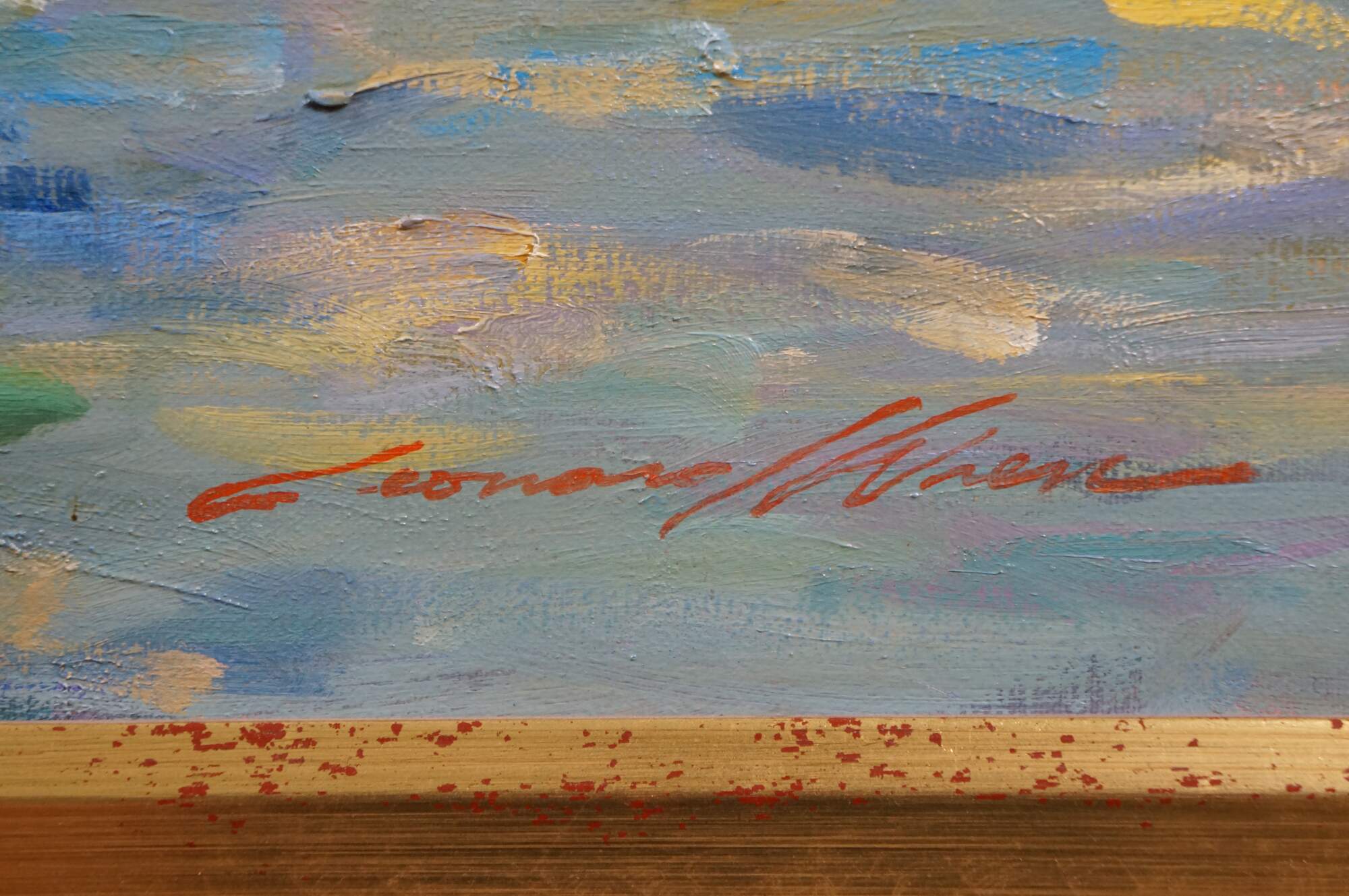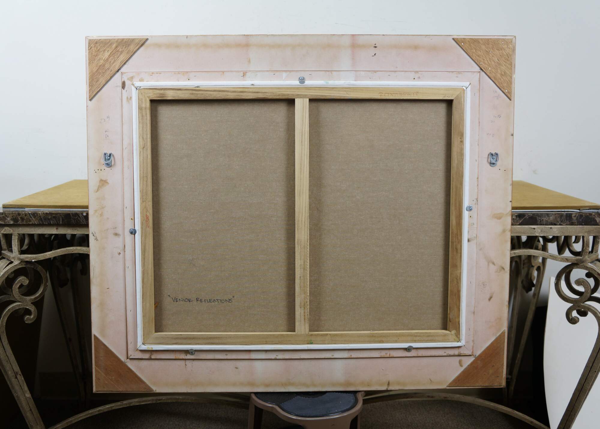 Late 20th century oil on canvas painting titled "Venice Reflections" by Leonard Wren. Impressionist cityscape showing a view of San Stae from the water of the Grand Canal in Venice, Italy. Signed, lower right. Titled on reverse. wood & gesso
