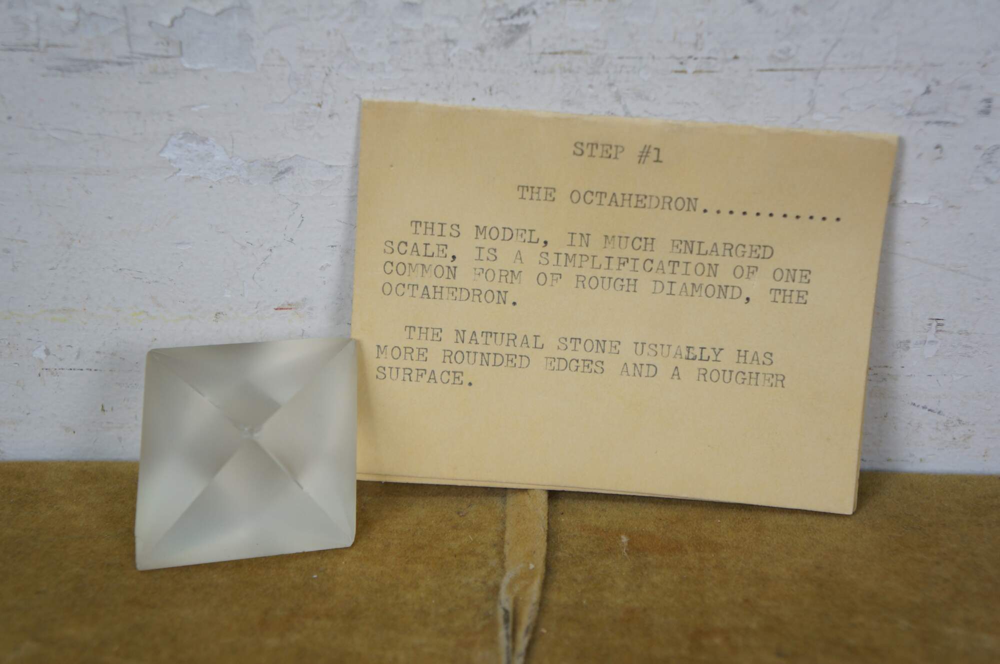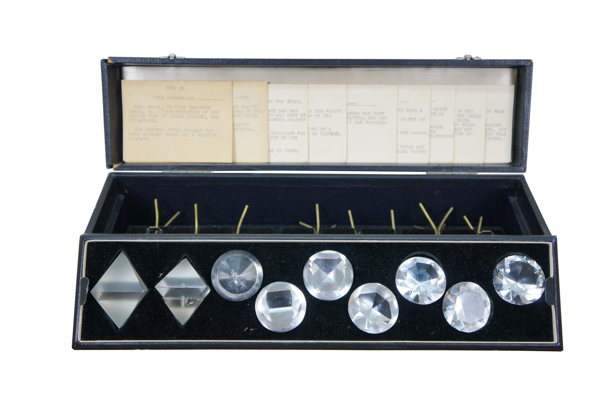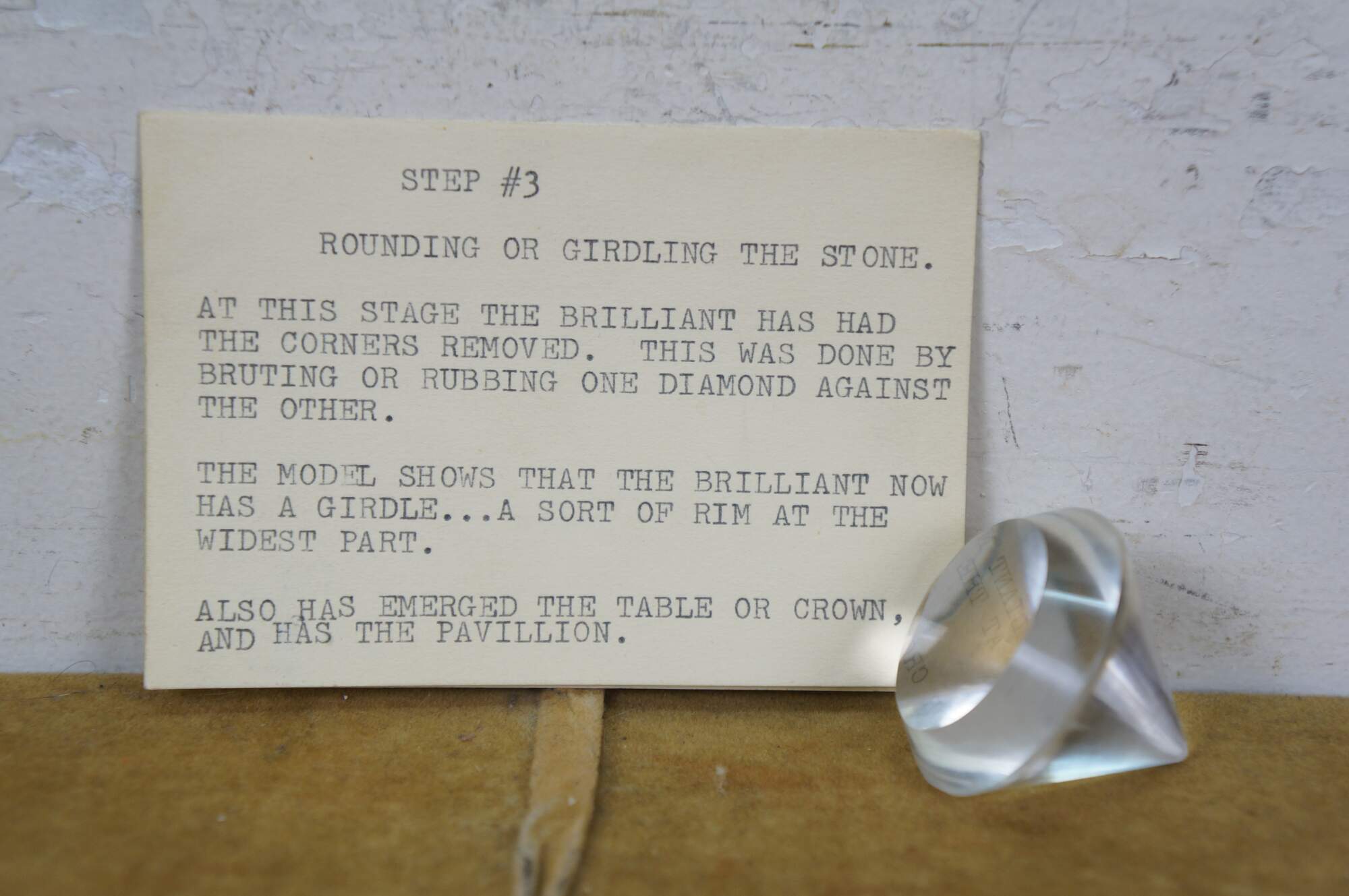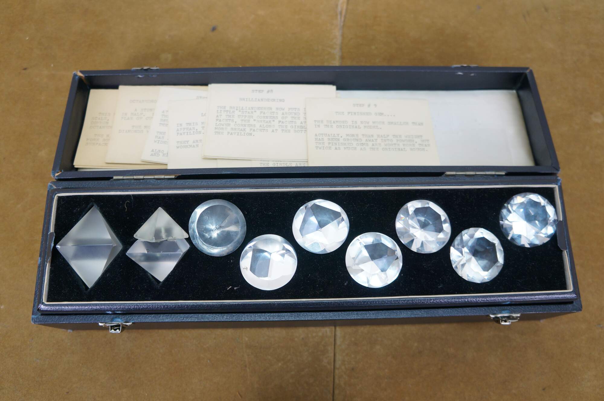 Late 20th century set of glass gemstones / prisms. 'THE NINE STAGES OF CUTTING A DIAMOND' AND 'HISTORICAL DIAMONDS' illustrating the process of cutting a diamond into shape from rough to complete. Includes brass pedestals (one missing) and cards describing each step in the process. Black bonded leather storage case.