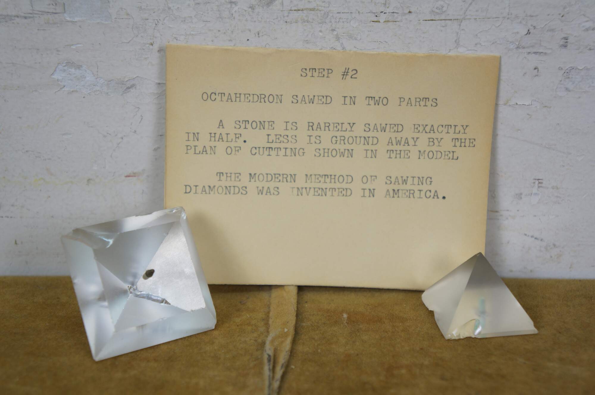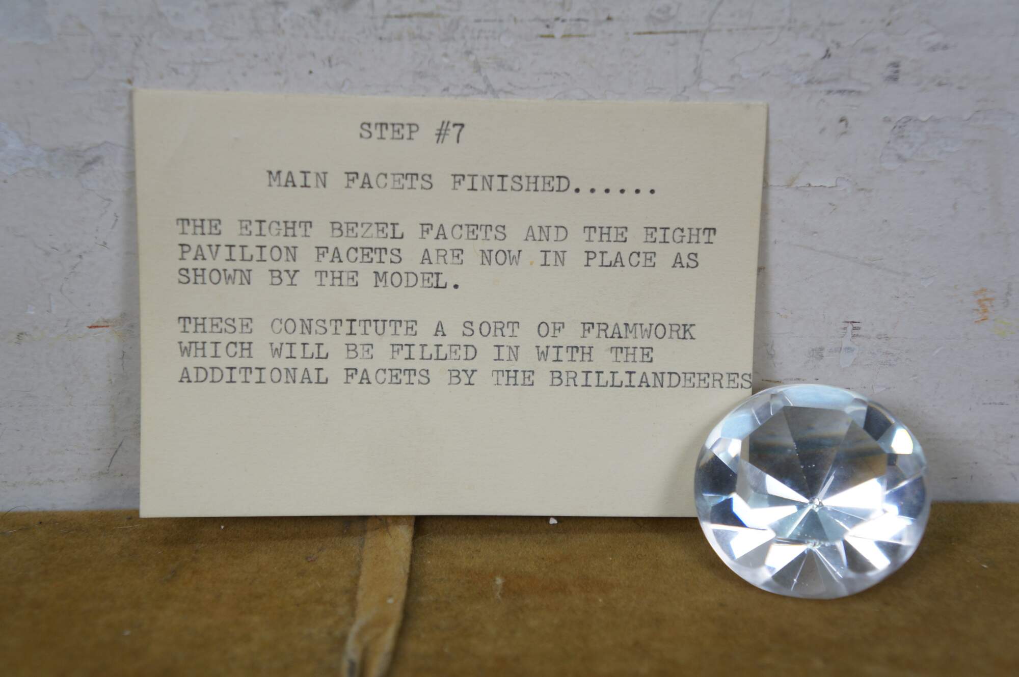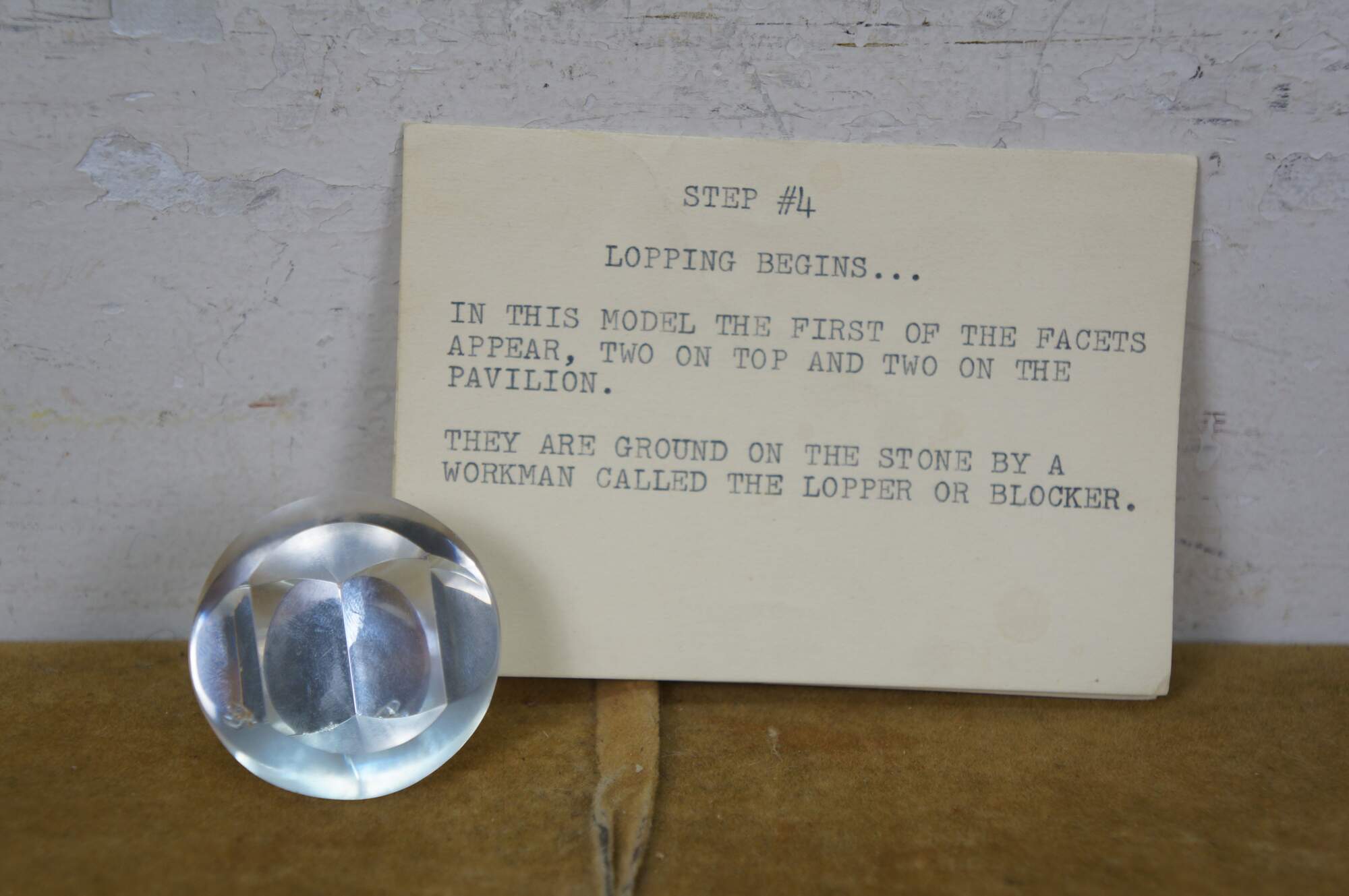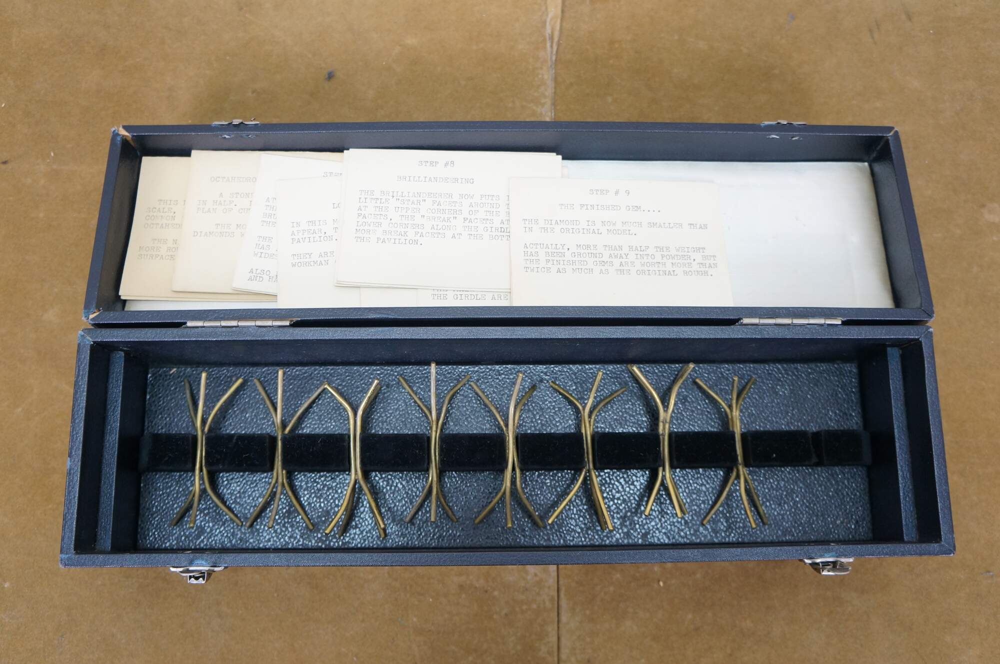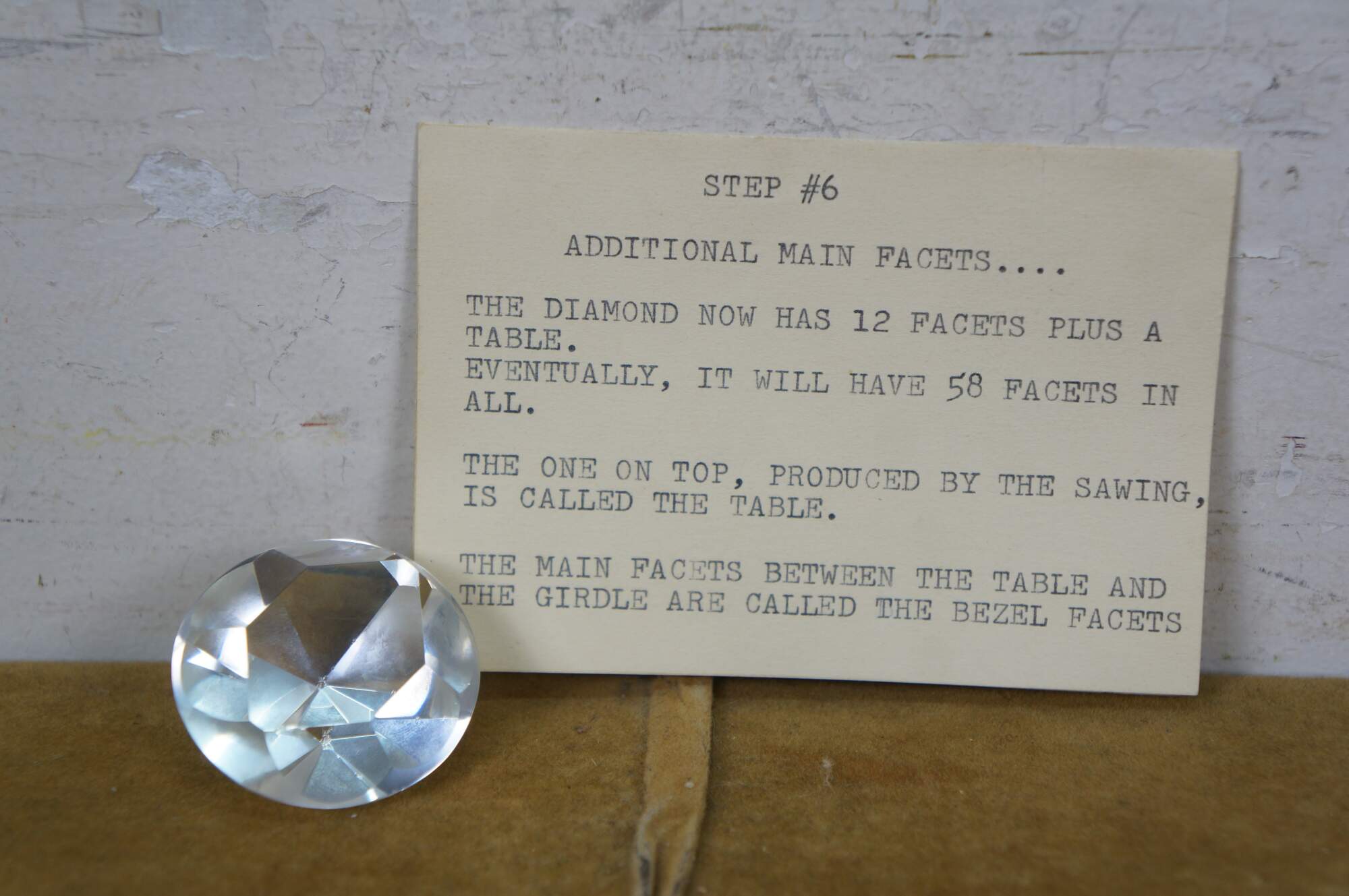 Late 20th century set of glass gemstones / prisms. 'THE NINE STAGES OF CUTTING A DIAMOND' AND 'HISTORICAL DIAMONDS' illustrating the process of cutting a diamond into shape from rough to complete. Includes brass pedestals (one missing) and cards describing each step in the process. Black bonded leather storage case.