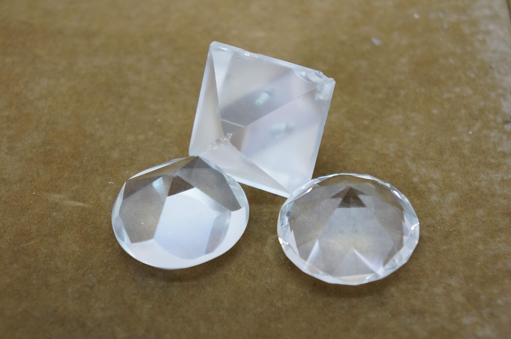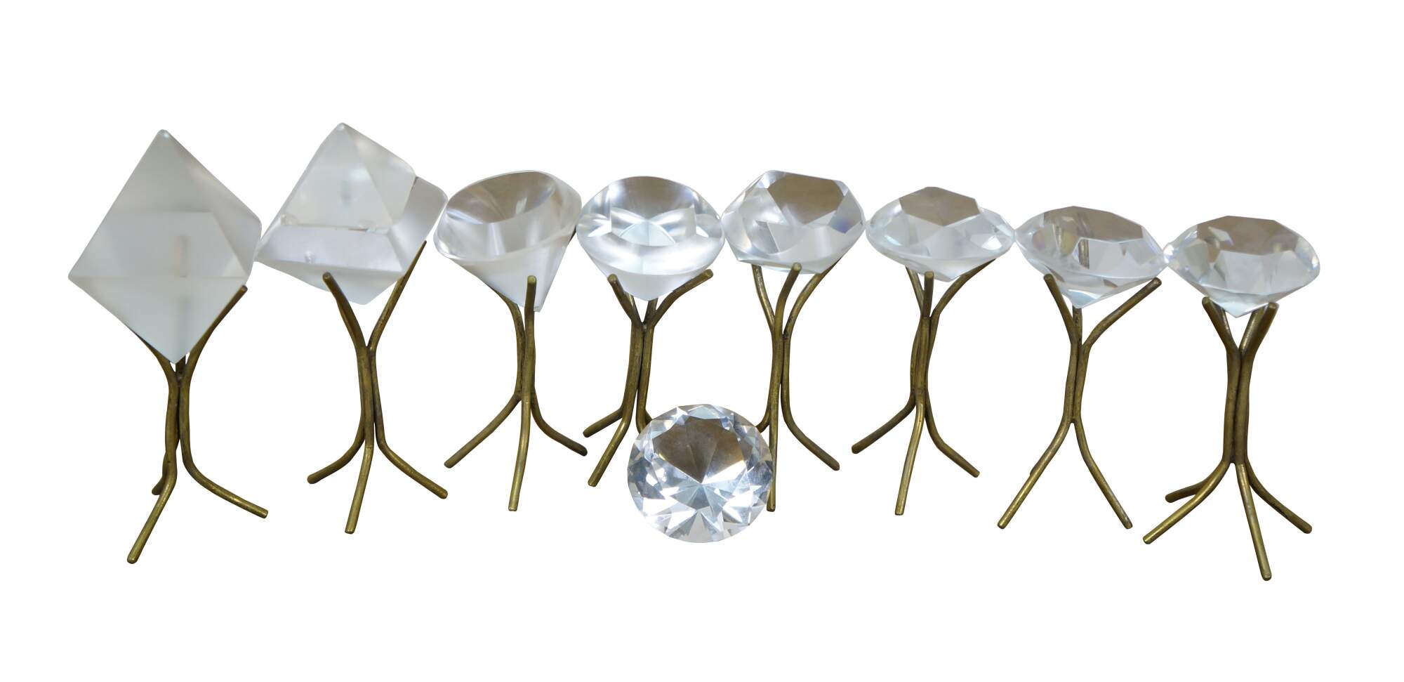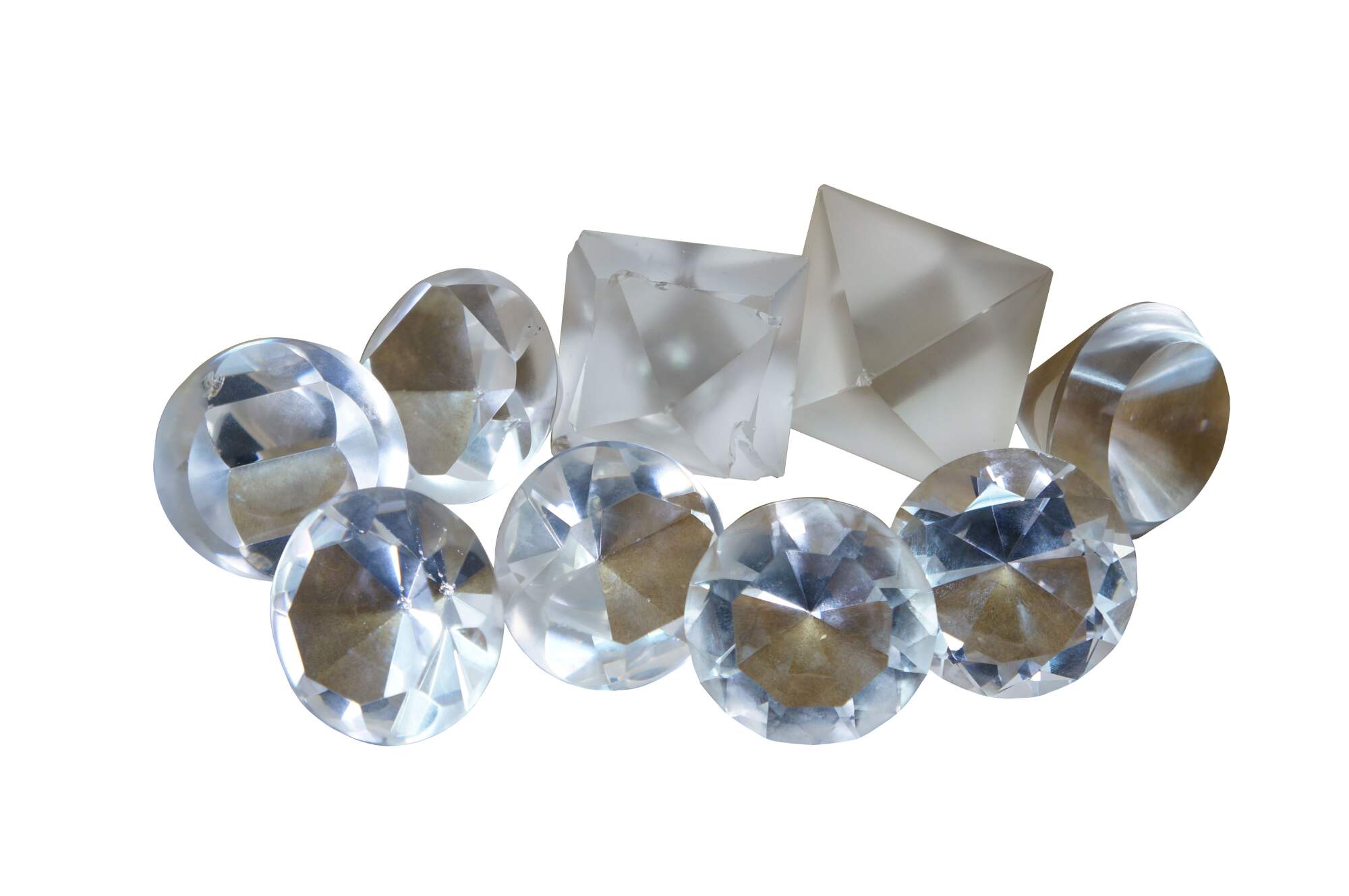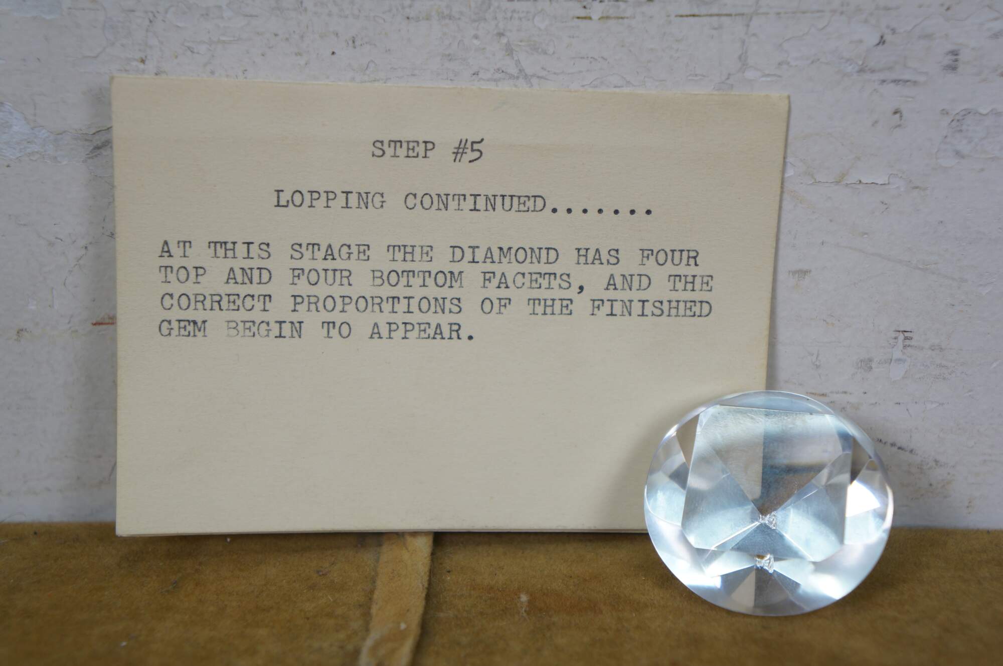 Late 20th century set of glass gemstones / prisms. 'THE NINE STAGES OF CUTTING A DIAMOND' AND 'HISTORICAL DIAMONDS' illustrating the process of cutting a diamond into shape from rough to complete. Includes brass pedestals (one missing) and cards describing each step in the process. Black bonded leather storage case.