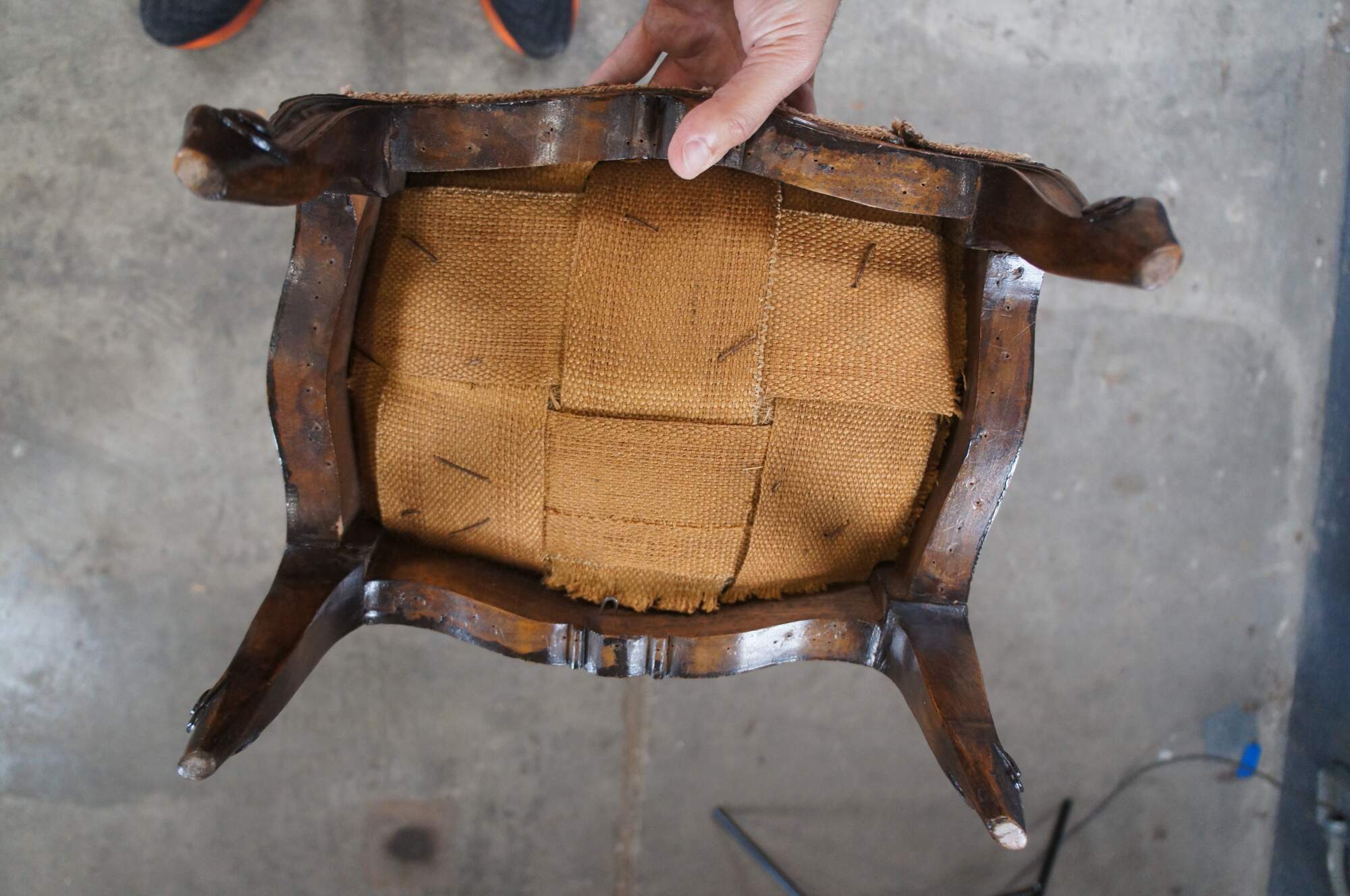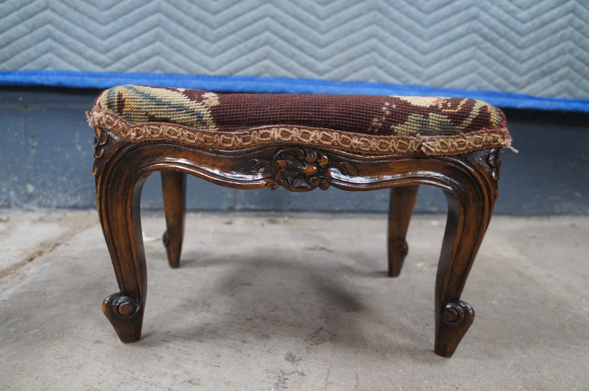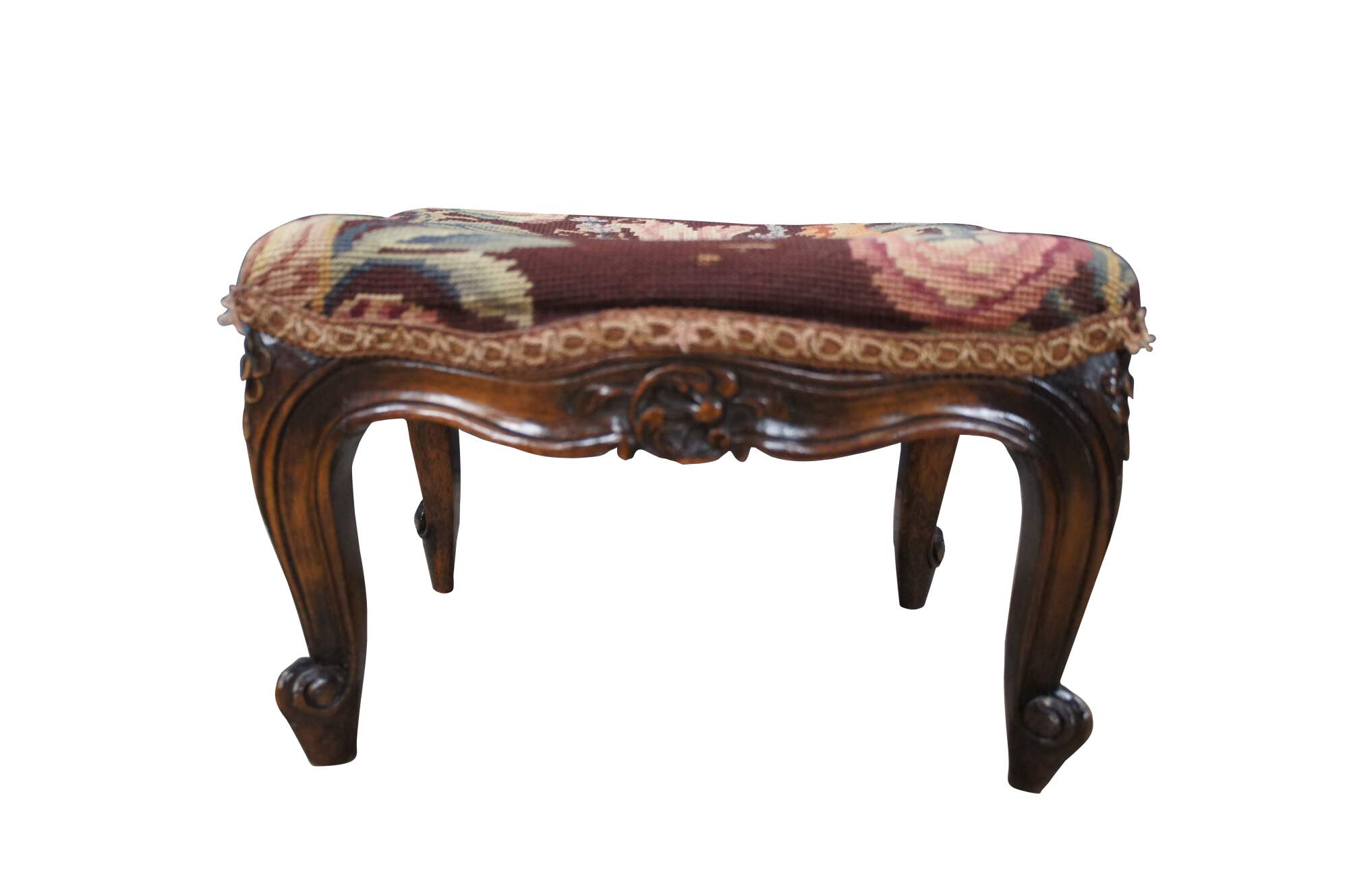 Antique French Louis XV stool, foot rest or ottoman. Made of walnut featuring serpentine form with carved floral, scalloped, and acanthus accents, and a Neoclassical floral rose and ribbon needlepoint upholstery..