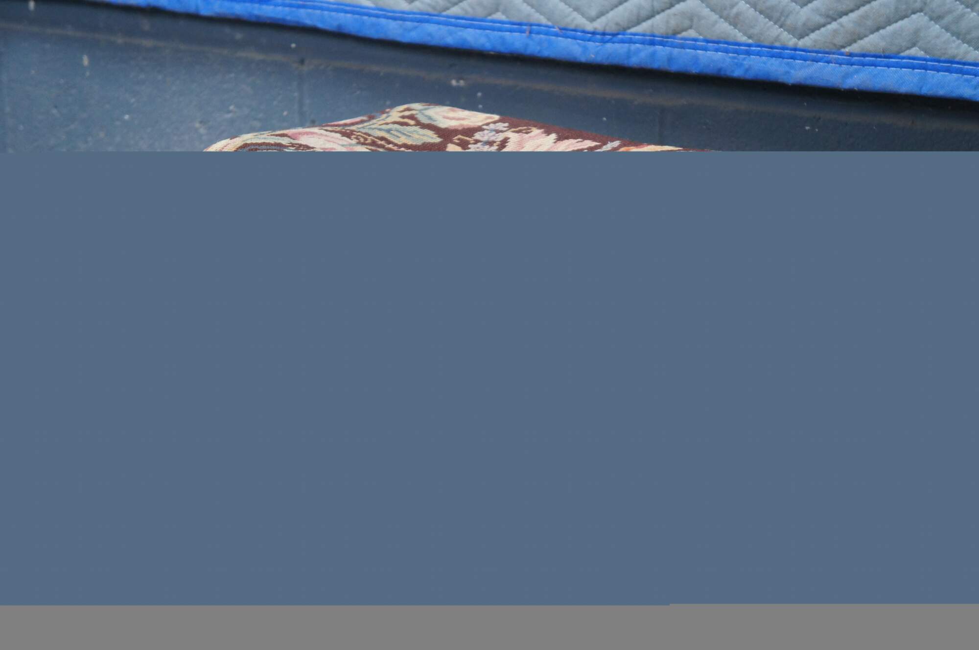 Wear from age and use, some fraying / fabric loss, sagging to seat, tac holes on underside.