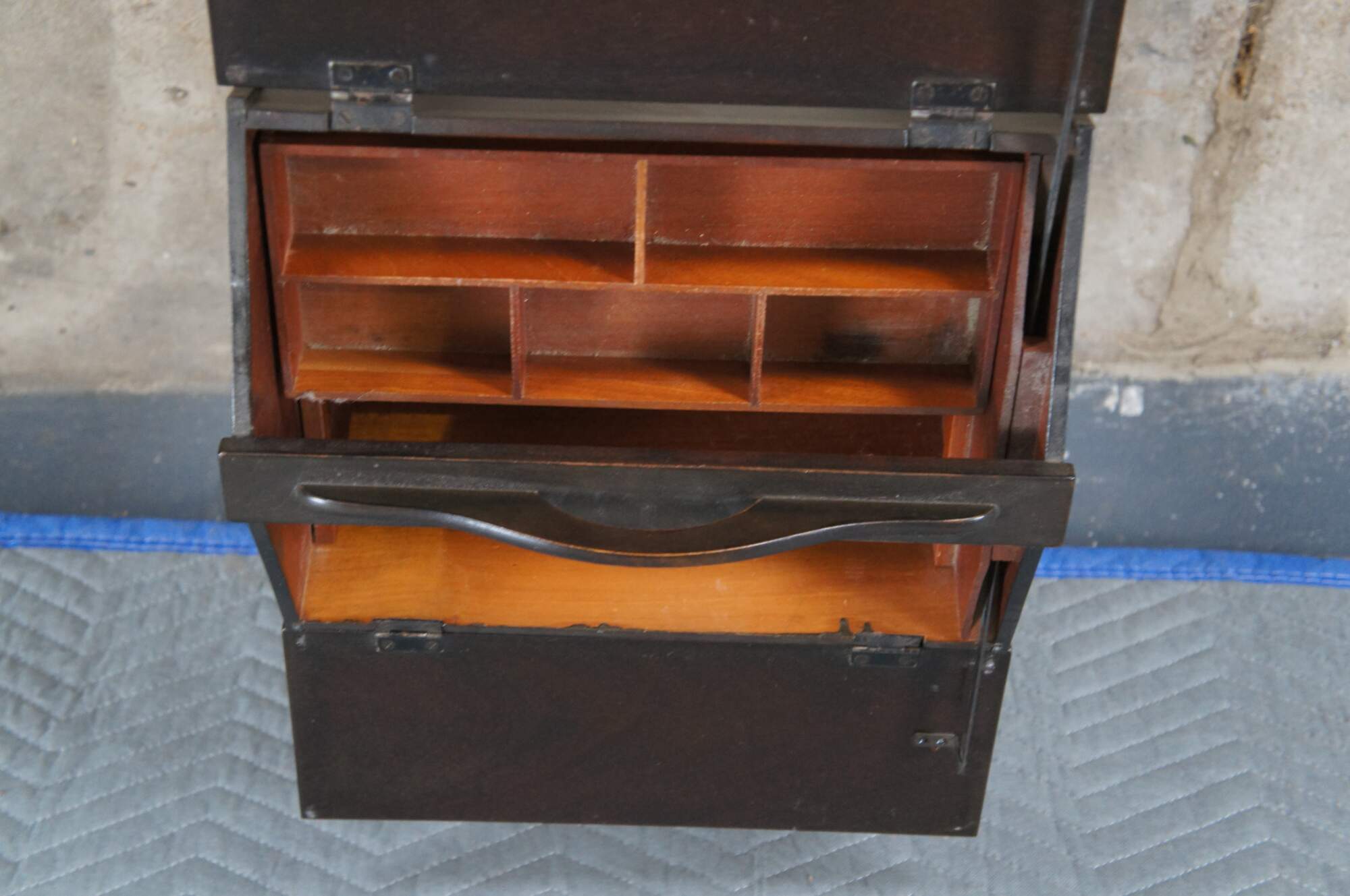 Structurally solid, marking, scuffing, split in top lid, finish loss.