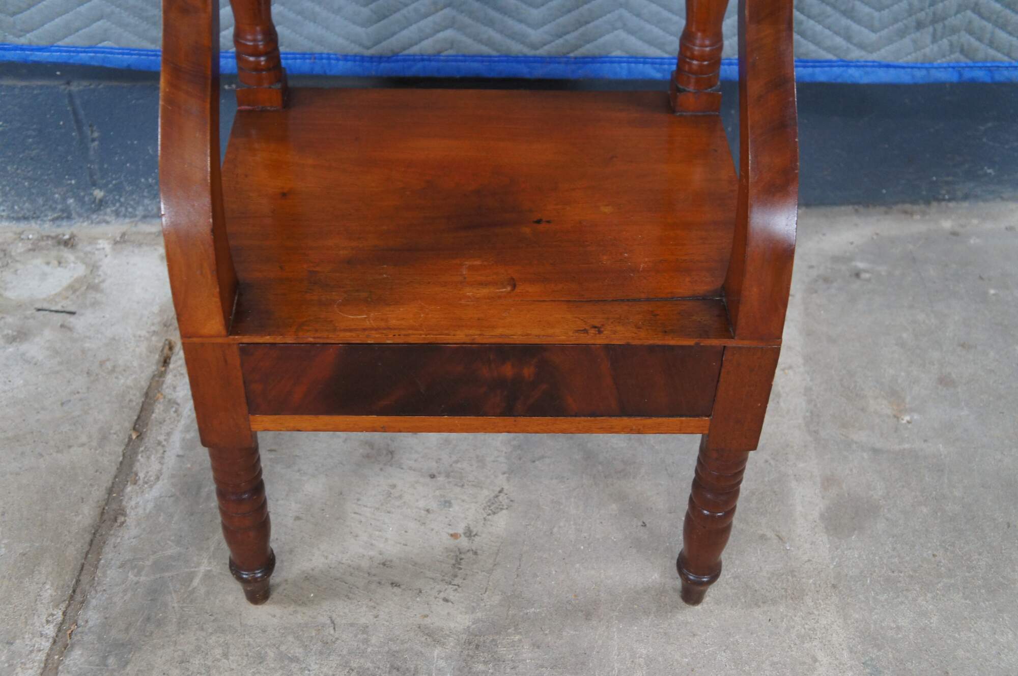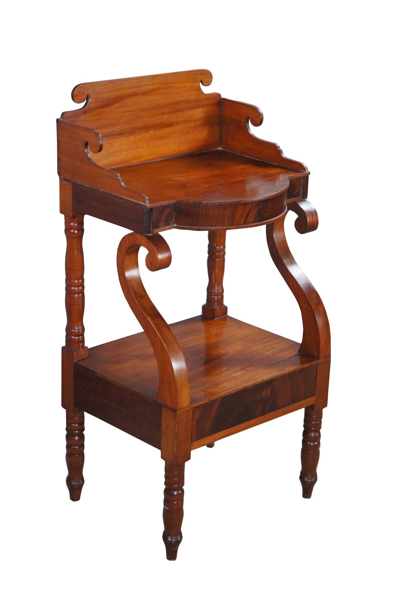 Antique two tier wash stand / parlor side table / nightstand. Made of flame mahogany featuring American Empire styling with large upper gallery surrounding a bowfront shelf, supported by scrolled and turned legs. Includes one lower drawer.