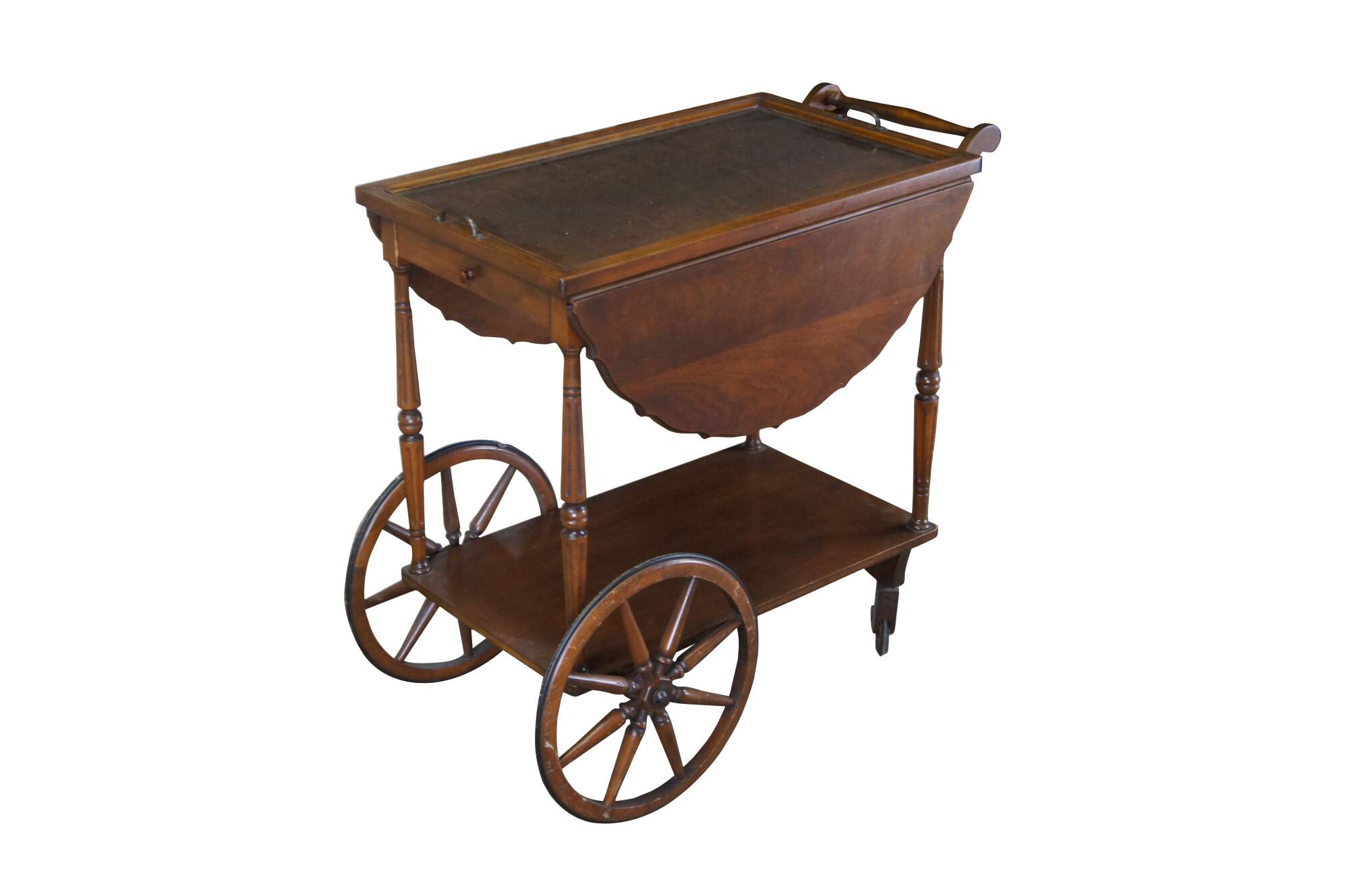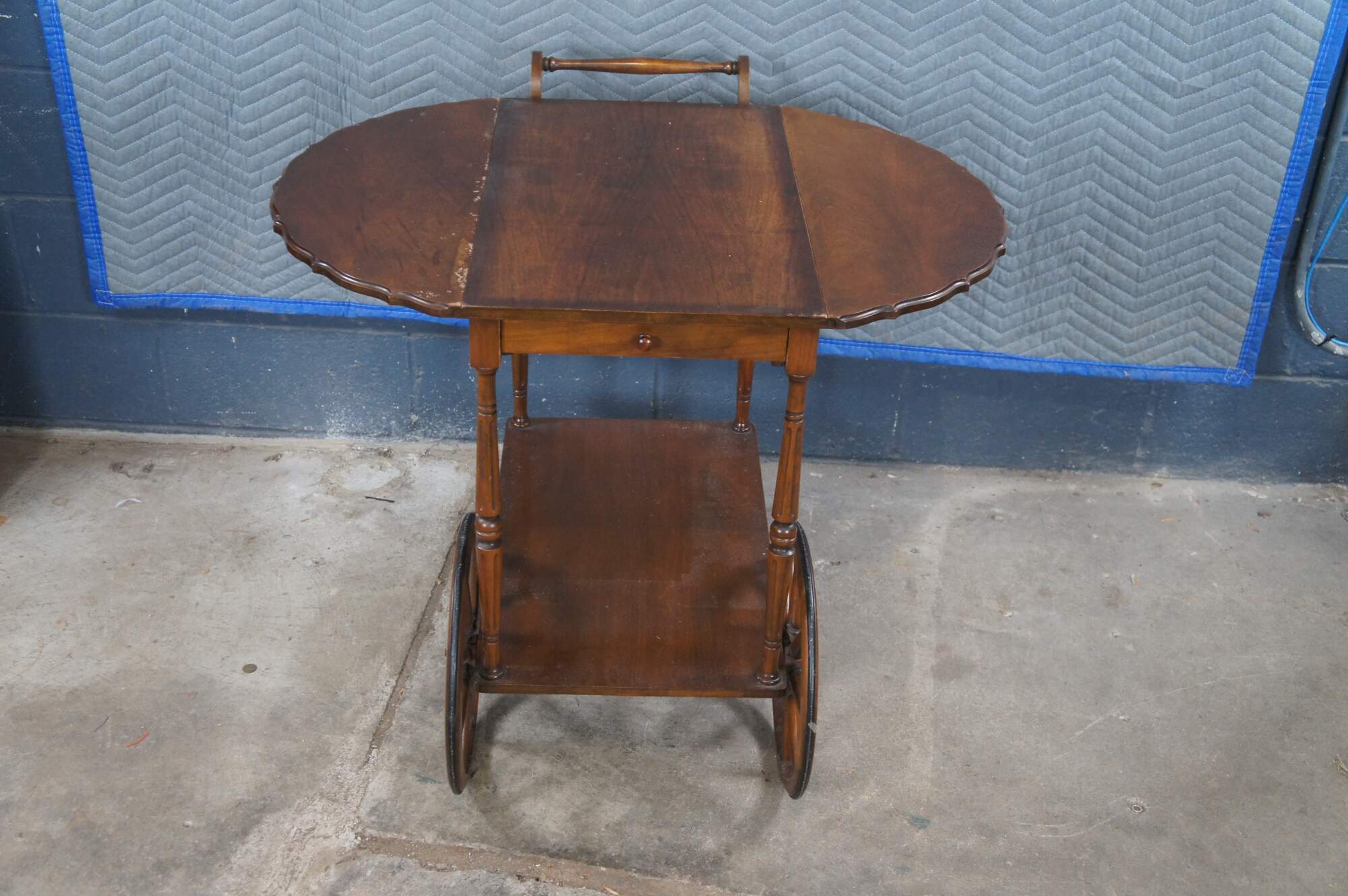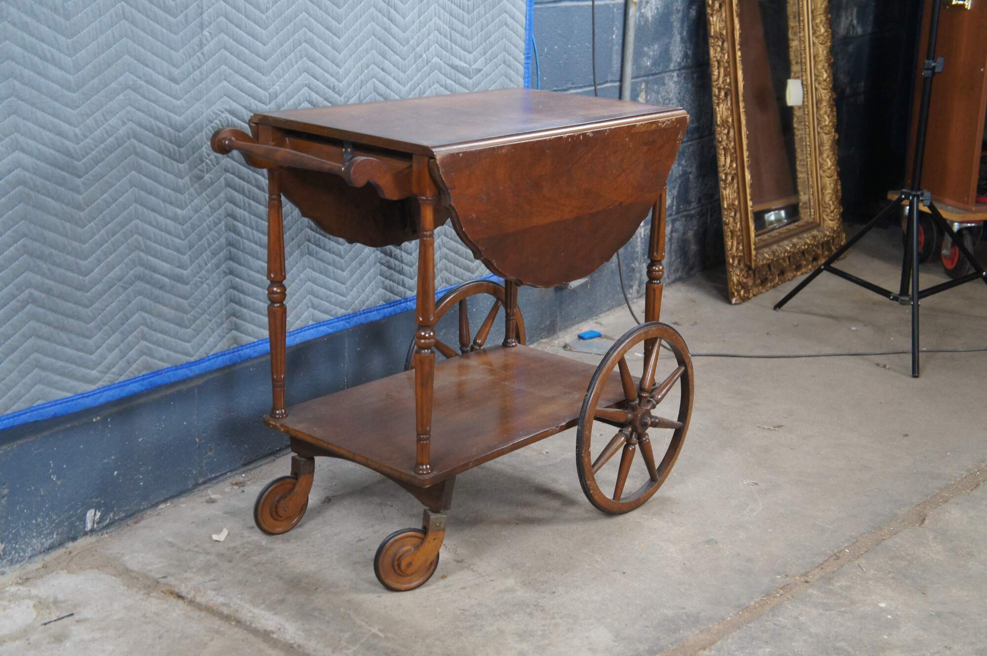 Antique Robert Mitchell tea / bar / serving cart. Made of walnut featuring a two tier design with scalloped drop leaves and removable glass tray table with handles. Includes one drawer, large wagon style wheels and rolling castors.