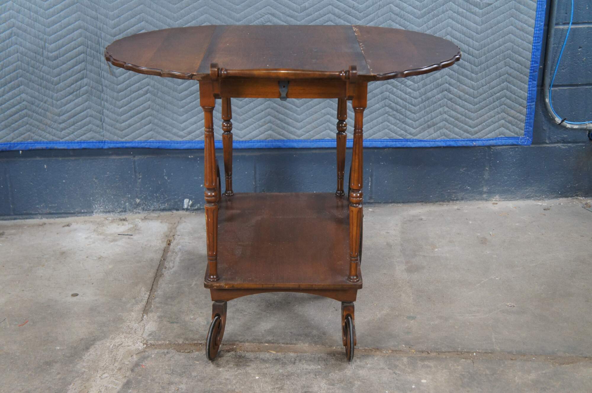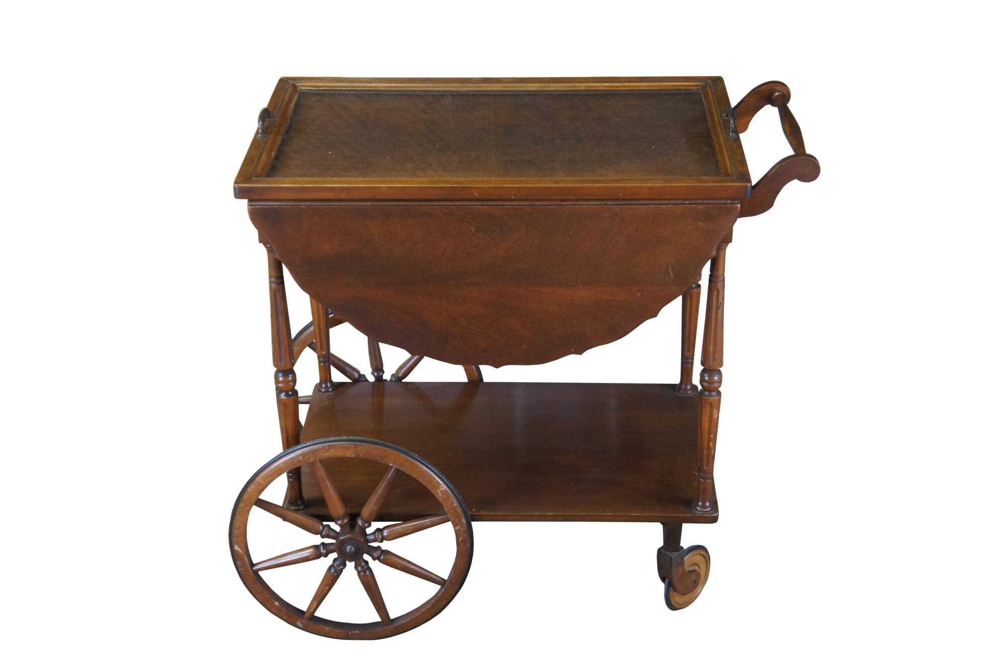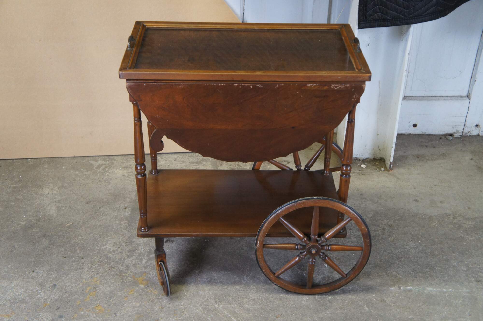 Antique Robert Mitchell tea / bar / serving cart. Made of walnut featuring a two tier design with scalloped drop leaves and removable glass tray table with handles. Includes one drawer, large wagon style wheels and rolling castors.