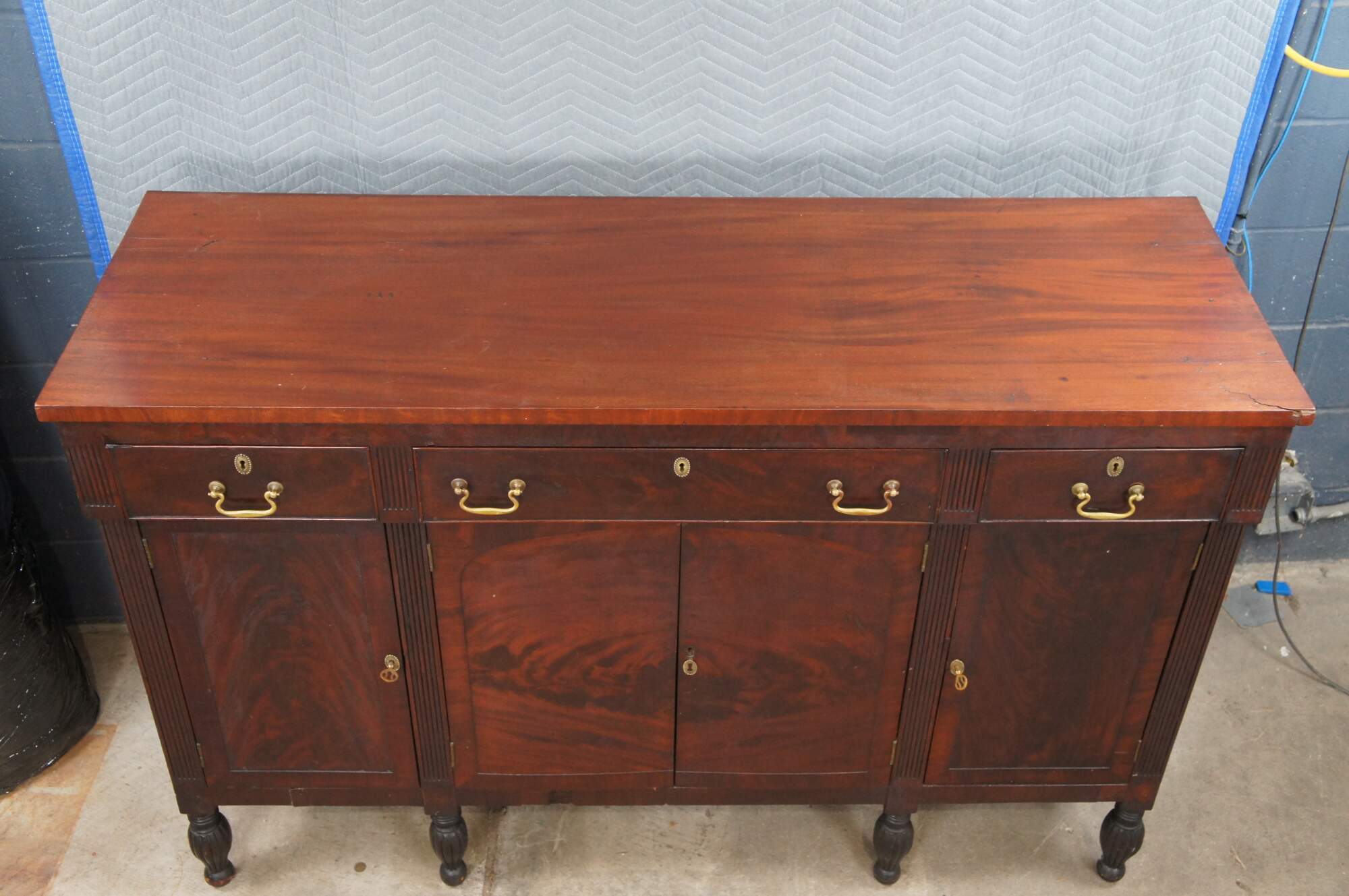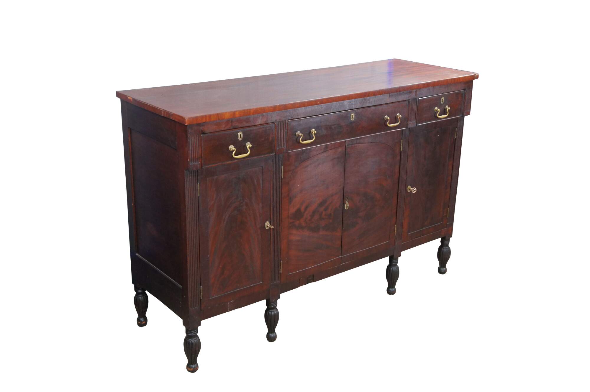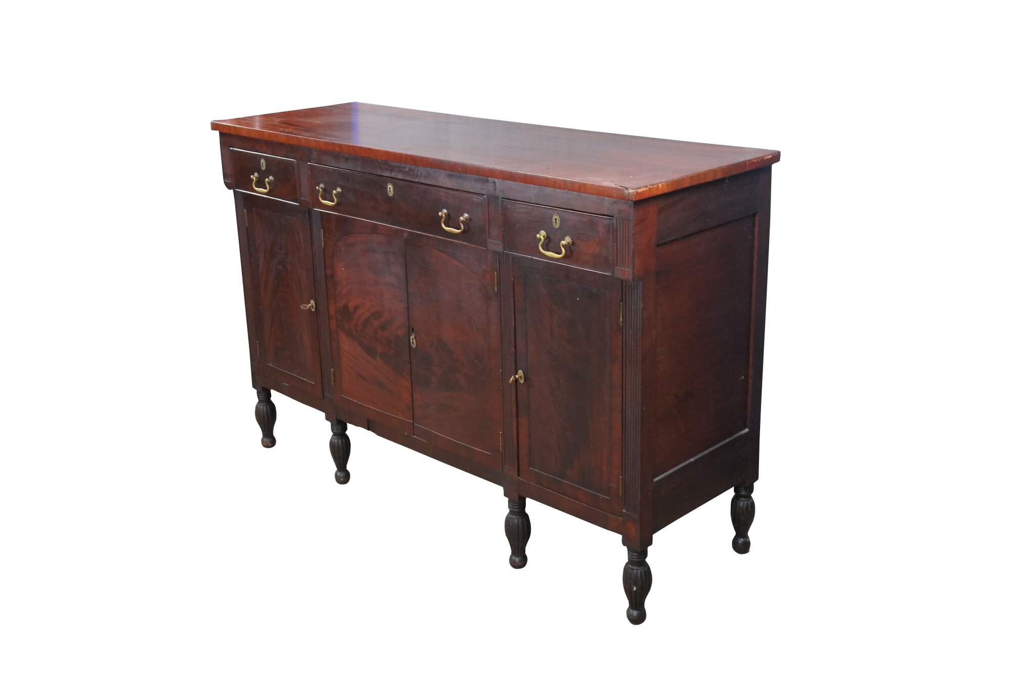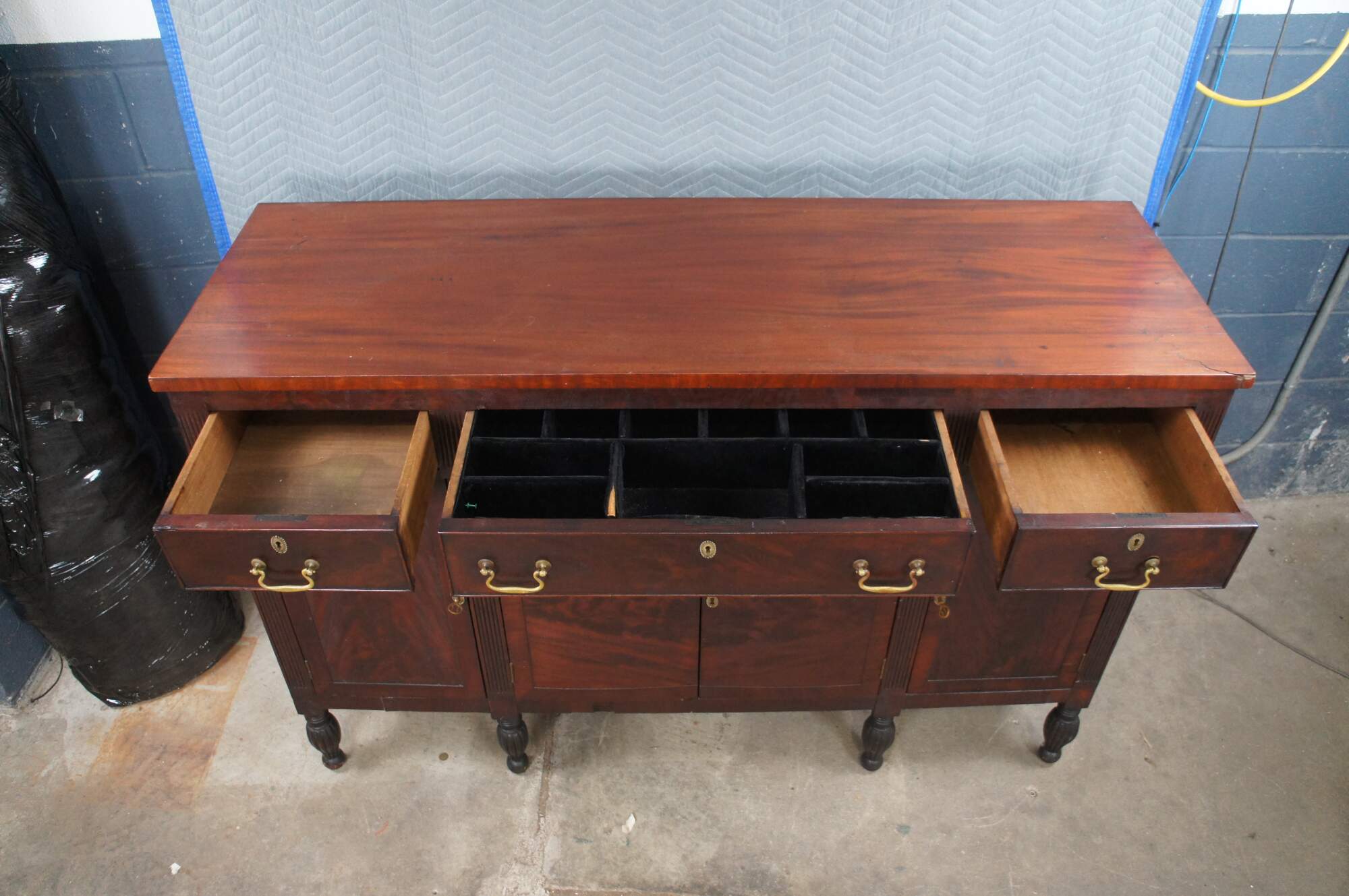 Antique American Empire flame mahogany buffet featuring rectangular form with large central silverware drawer, flanked by drawers over cabinets divided by fluted accents and baluster legs.