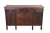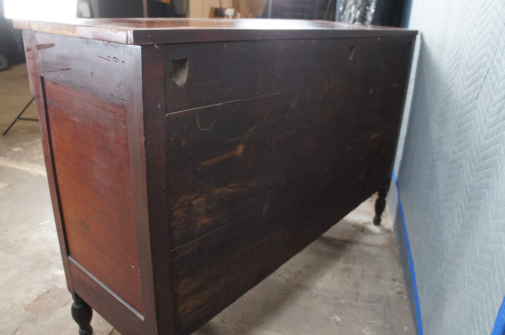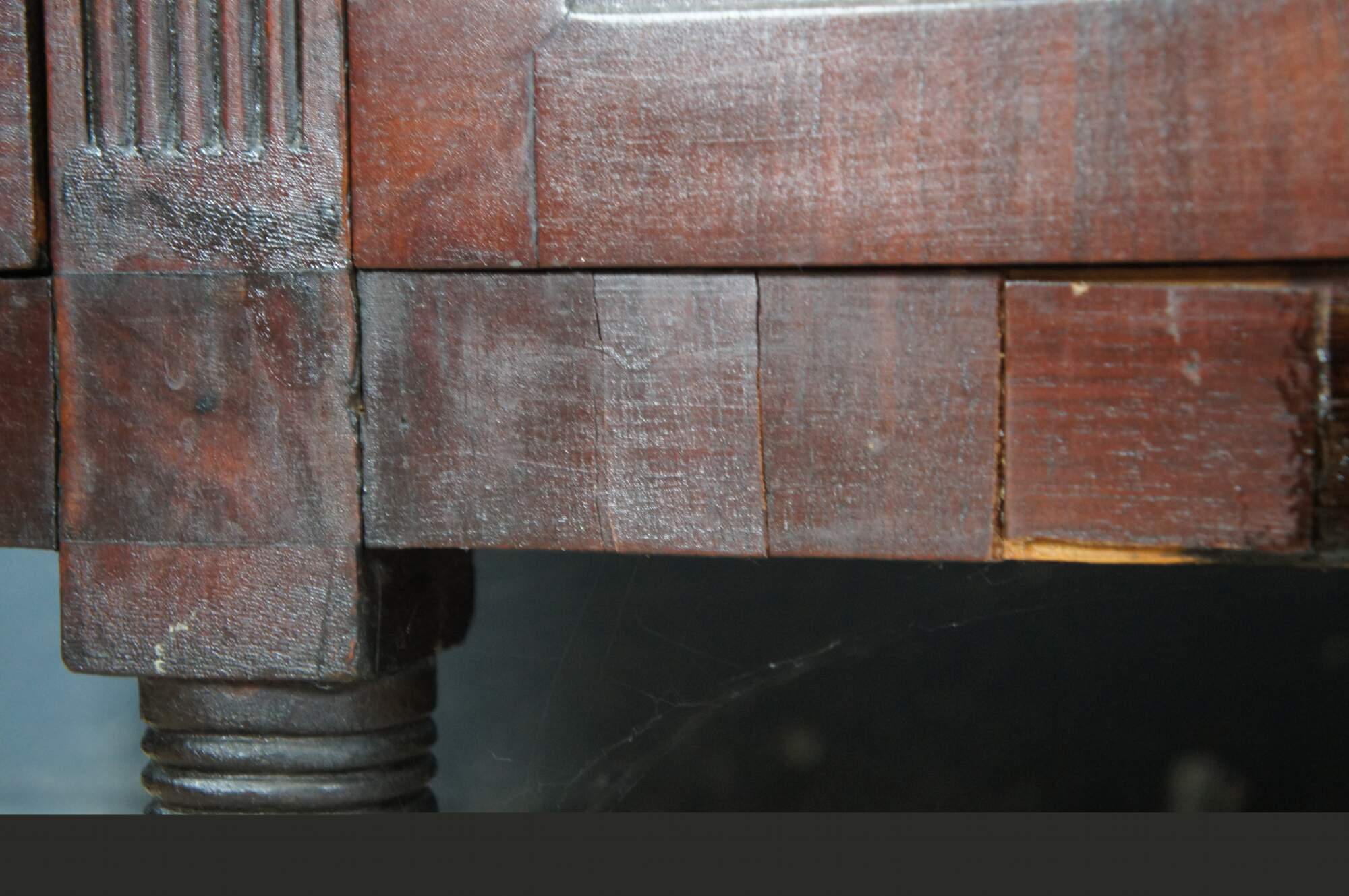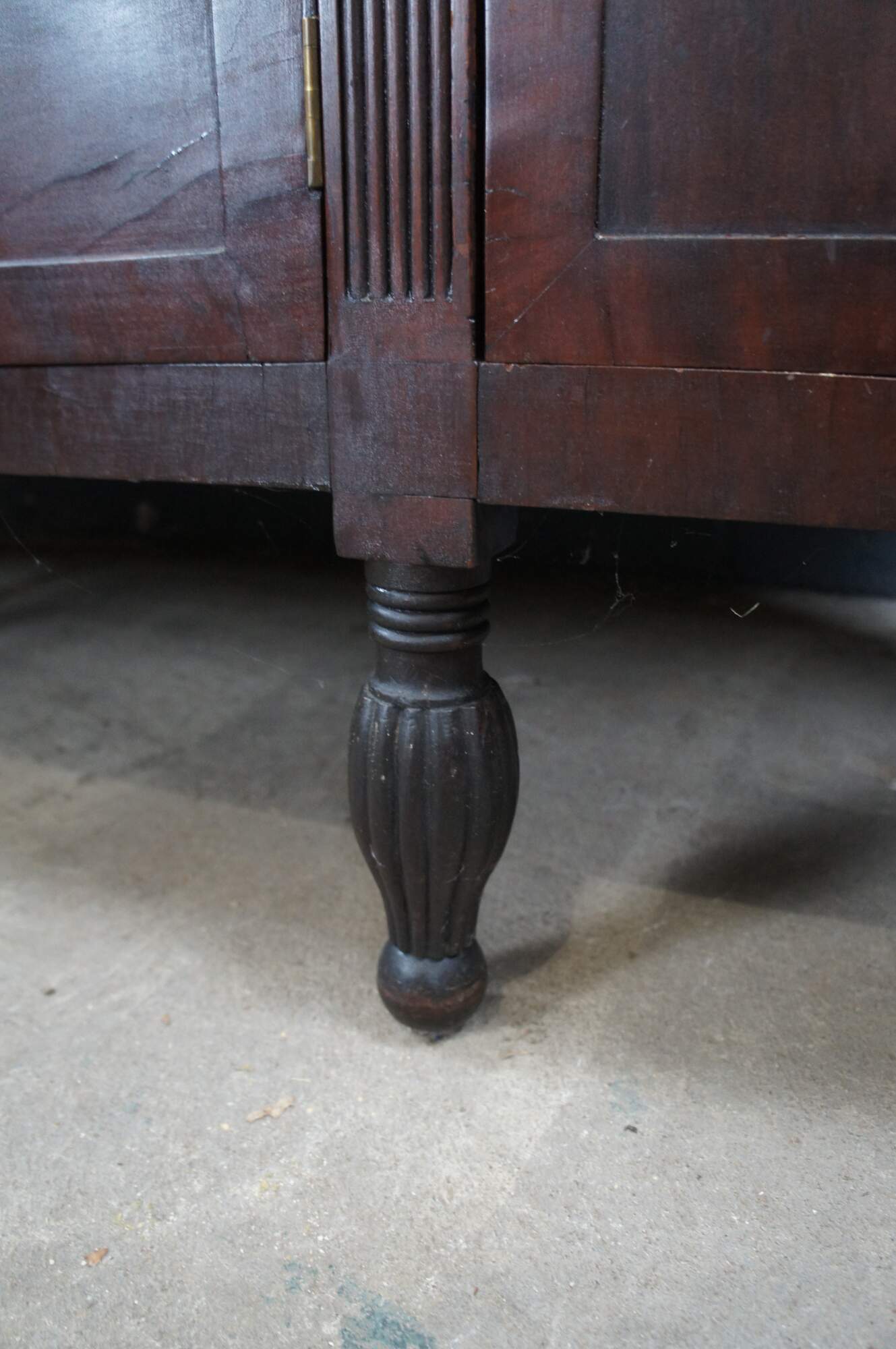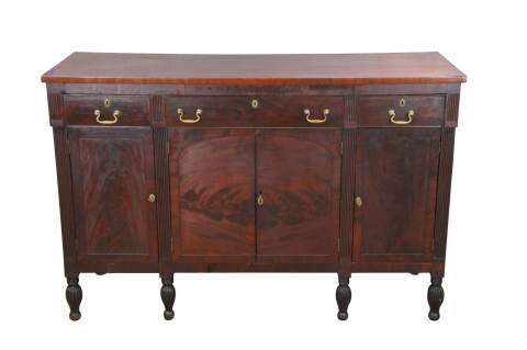 Antique American Empire flame mahogany buffet featuring rectangular form with large central silverware drawer, flanked by drawers over cabinets divided by fluted accents and baluster legs.