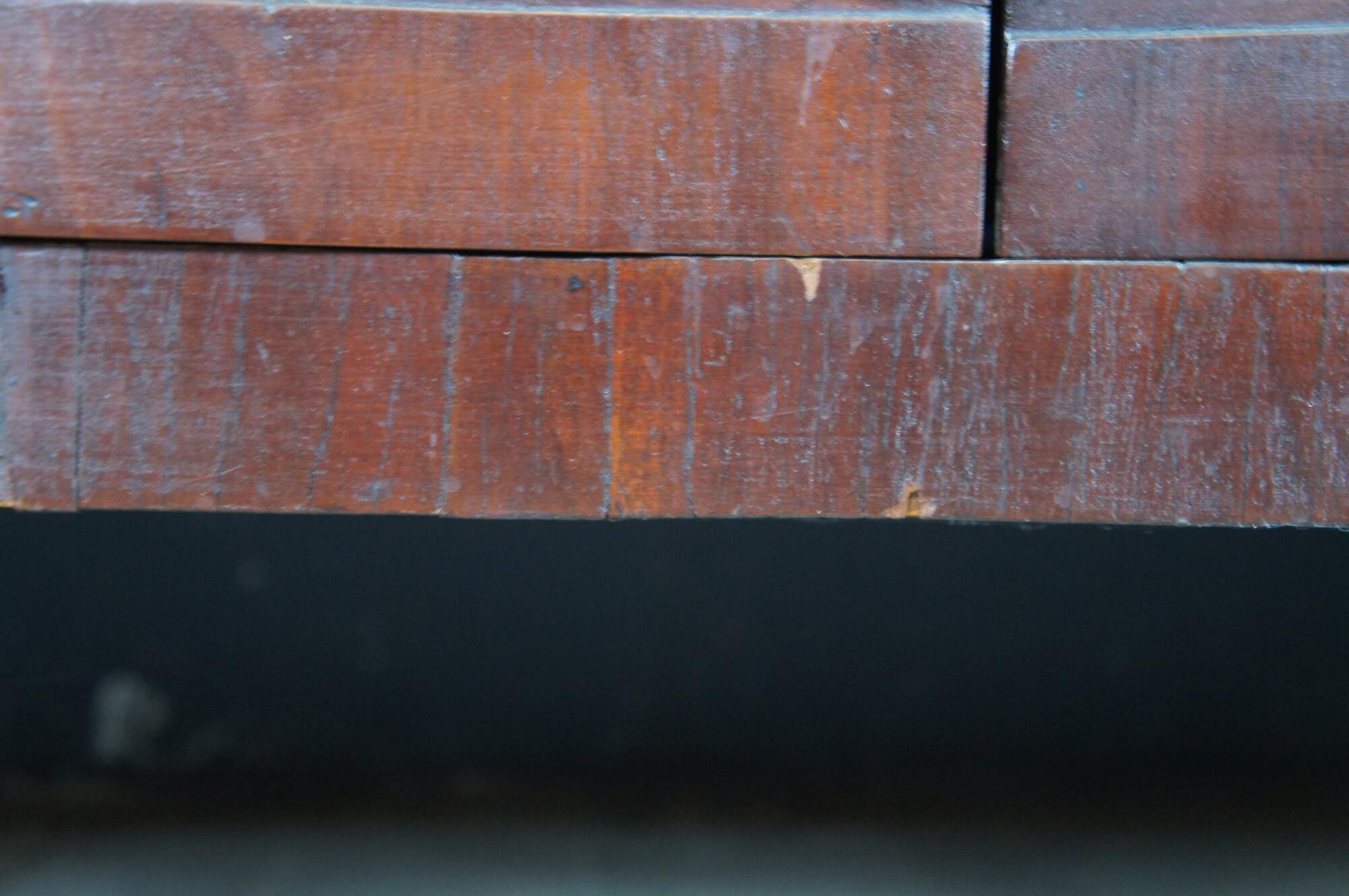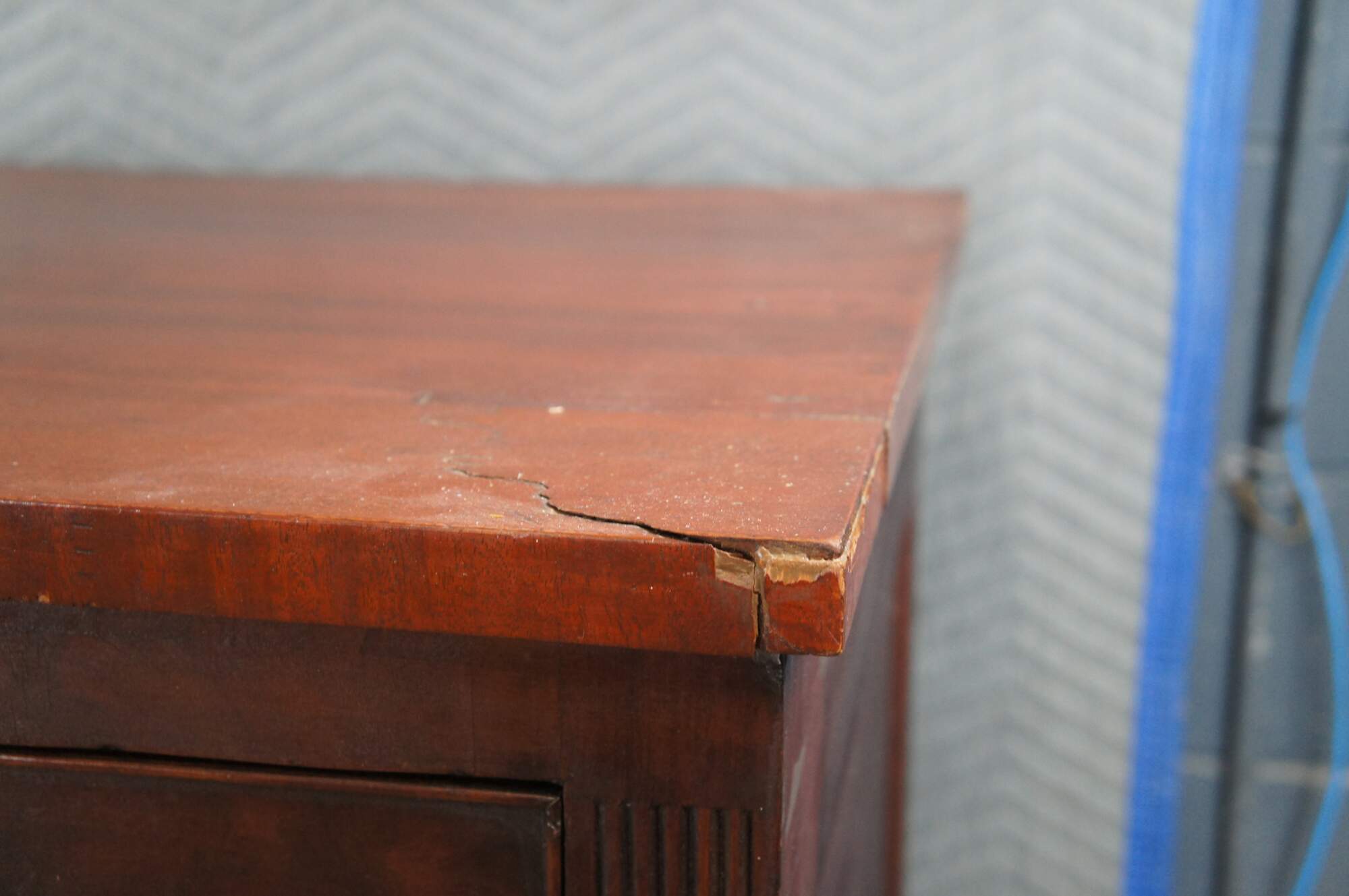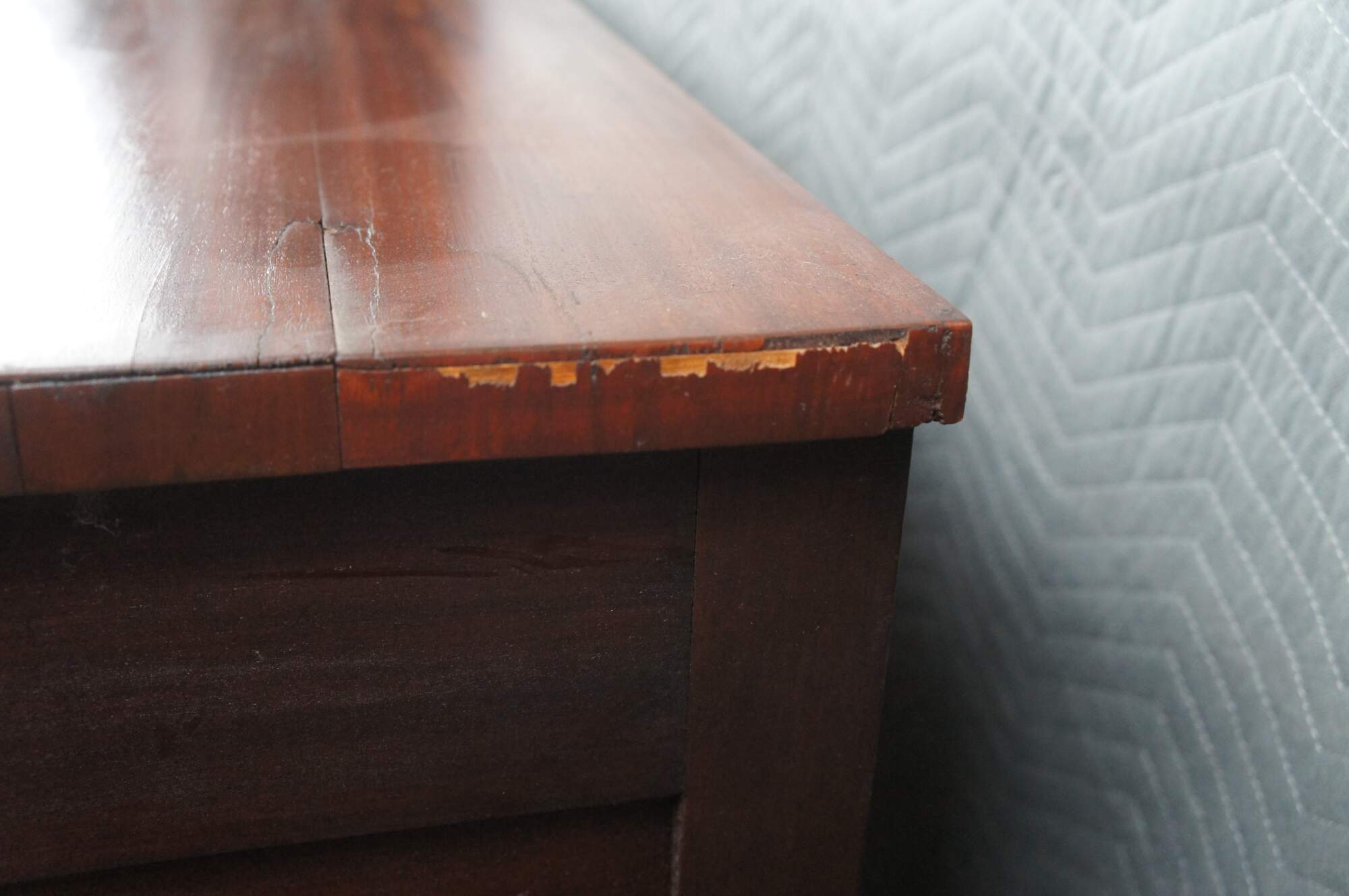 Fair condition, structurally solid, crack / impact to top right corner, splitting, veneer loss, missing trim, alligatoring to finish, hazing, slight damage to drawer insert, staining to interior, no key.