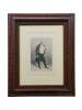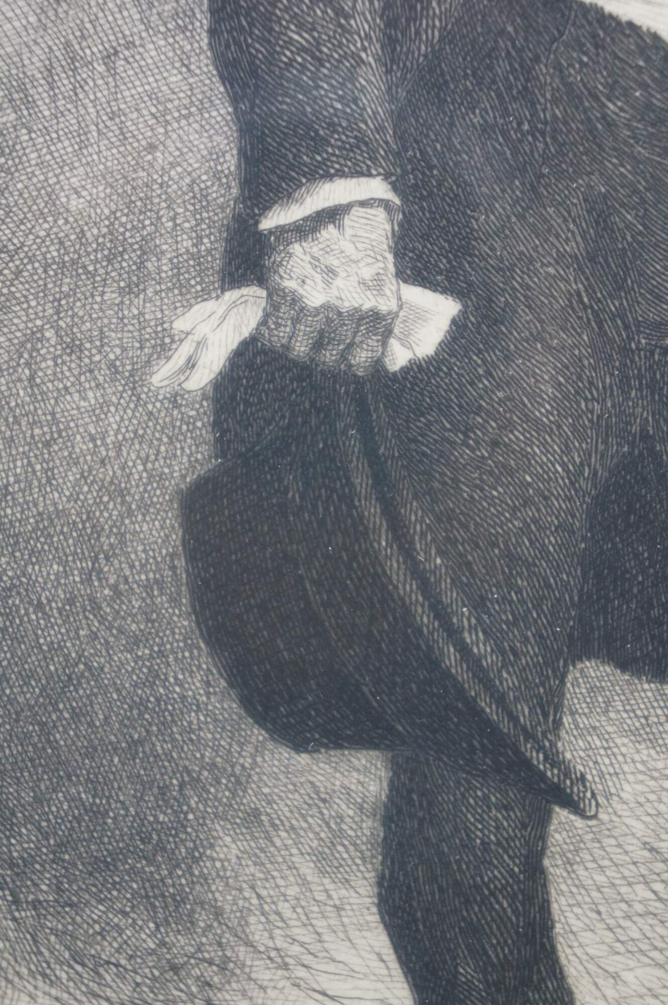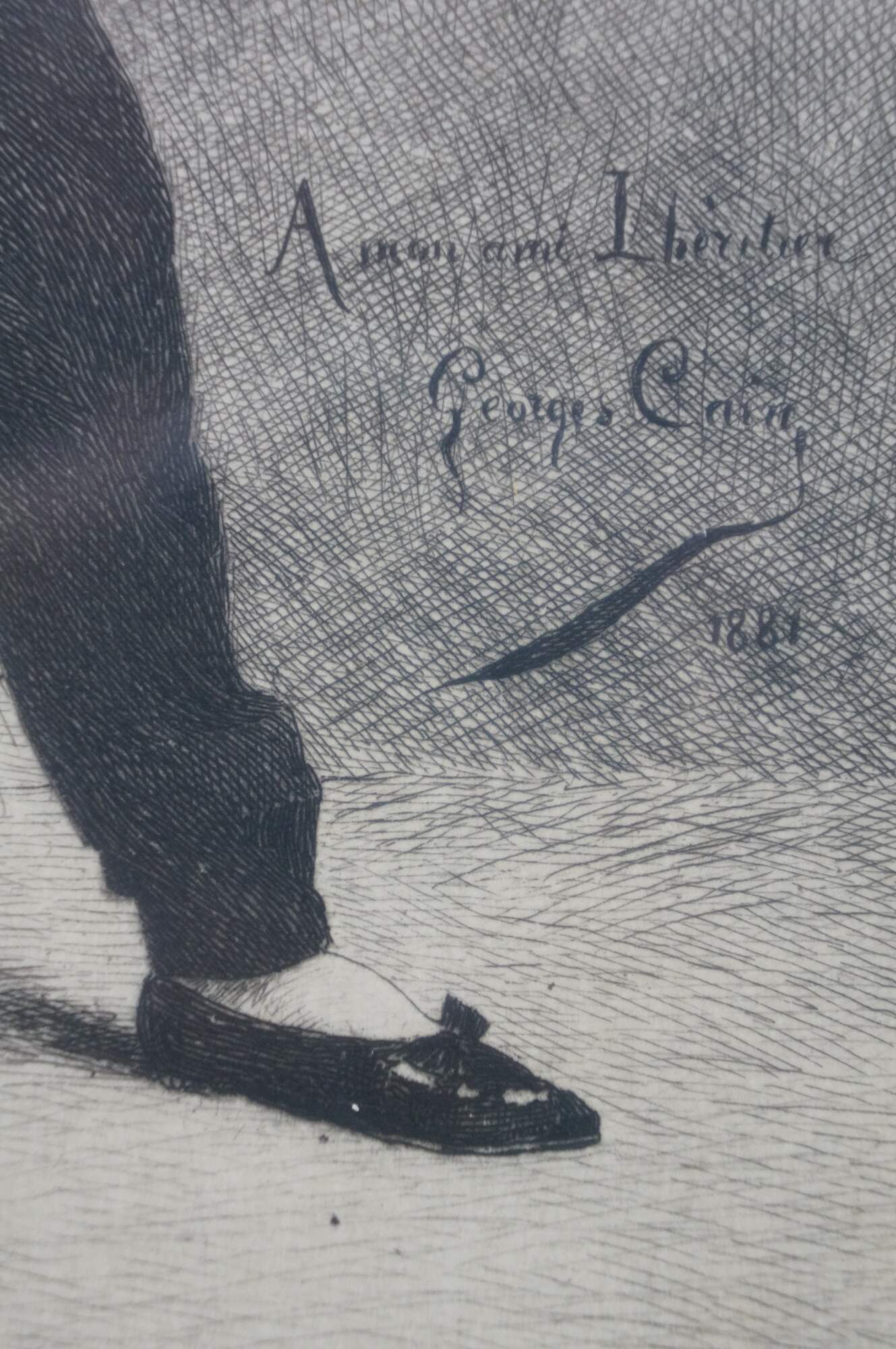 Late 19th century black and white etching of "Portrait de Lhéritier (Romain Thomas, dit), acteur (1809-1885) dans le rôle de Cordenbois de "la Cagnotte" de Labiche (Portrait of Lhéritier (Romain Thomas, known as), actor (1809-1885) in the role of Cordenbois in "La Cagnotte" by Labiche) by Georges Cain. Depicts a gentleman in evening wear with a floral vest, holding gloves and hat. Inscribed "A mon ami Lhéritier (To my friend Lethier) Georges Cain 1881" at lower right. Etcher Leon Gouchard. From "Proof Etchings for L'Art - 1883." Wood frame with raised bevel and painted wood grain; white mat.