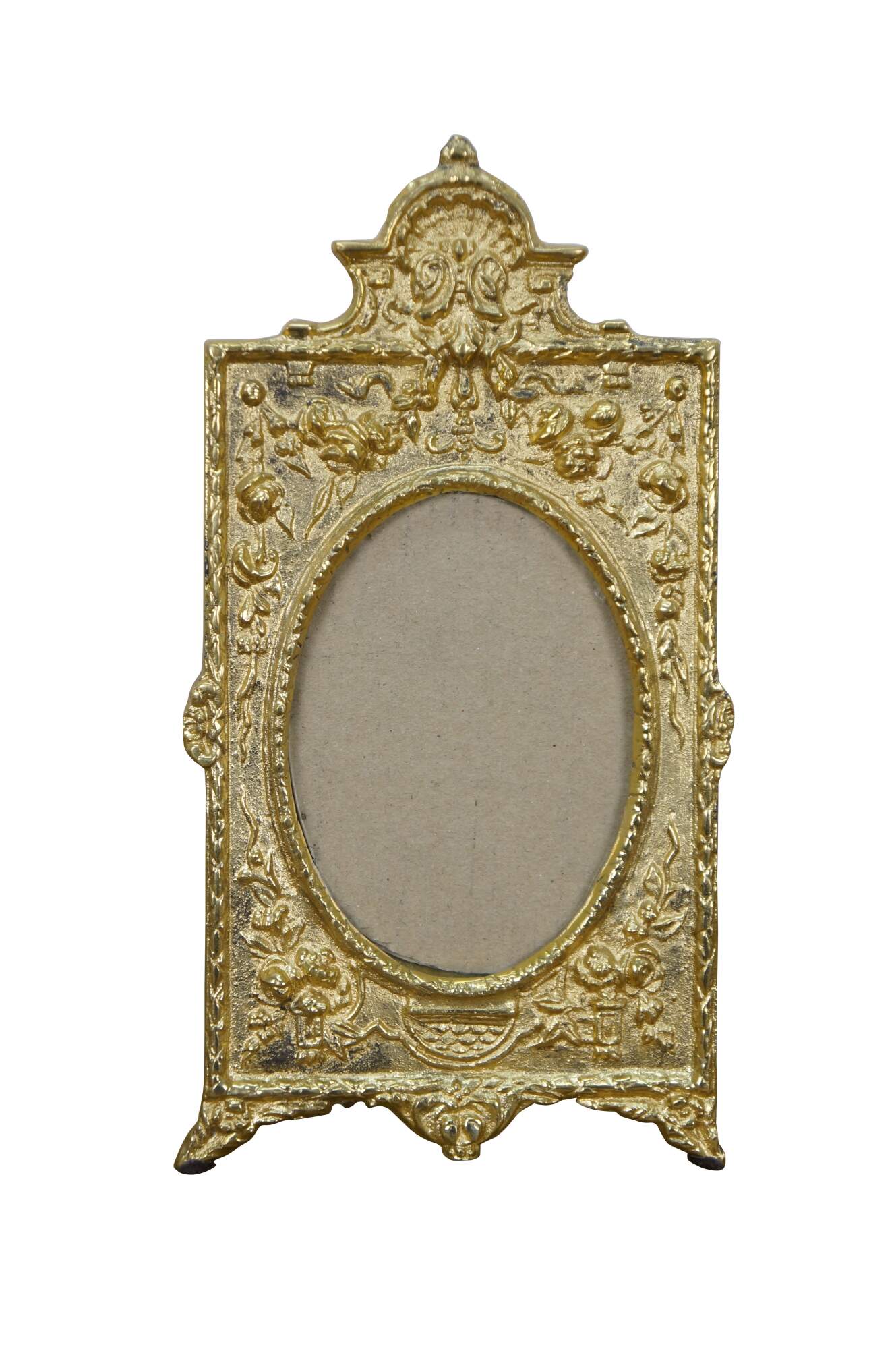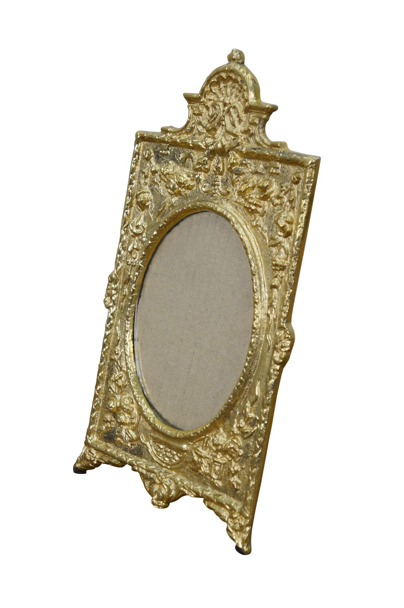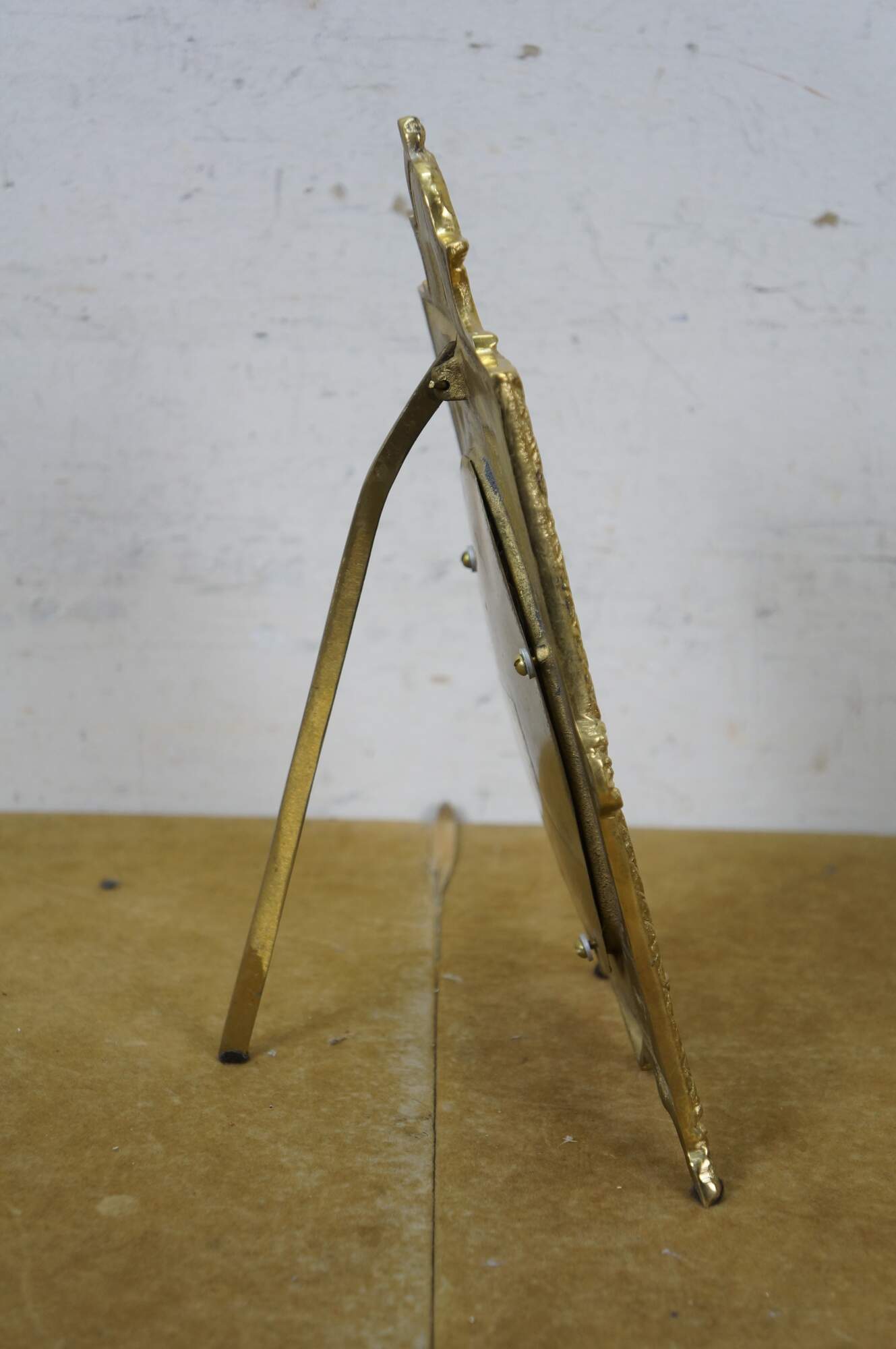 Late 20th century Maitland Smith antiqued brass photo frame with baroque styling and easel back. Designed and Handmade in Thailand by Maitland-Smith Ltd.