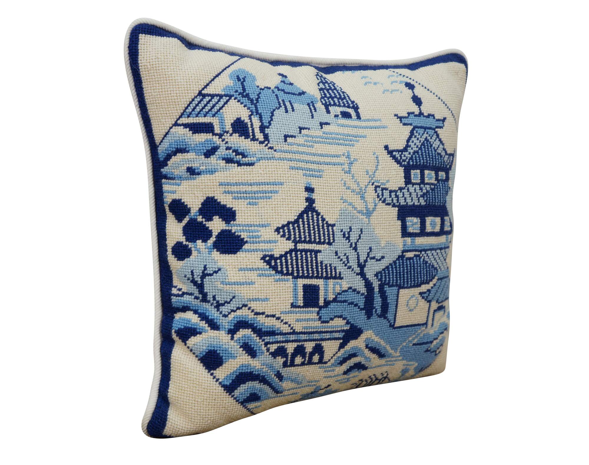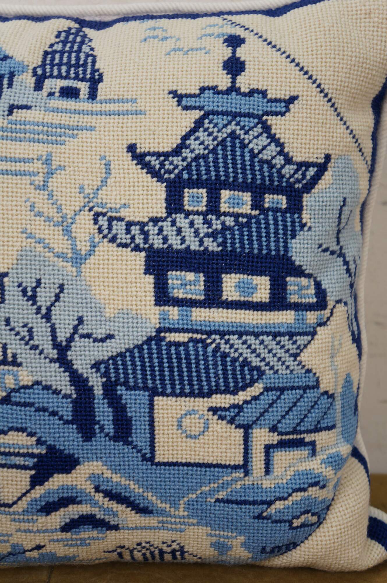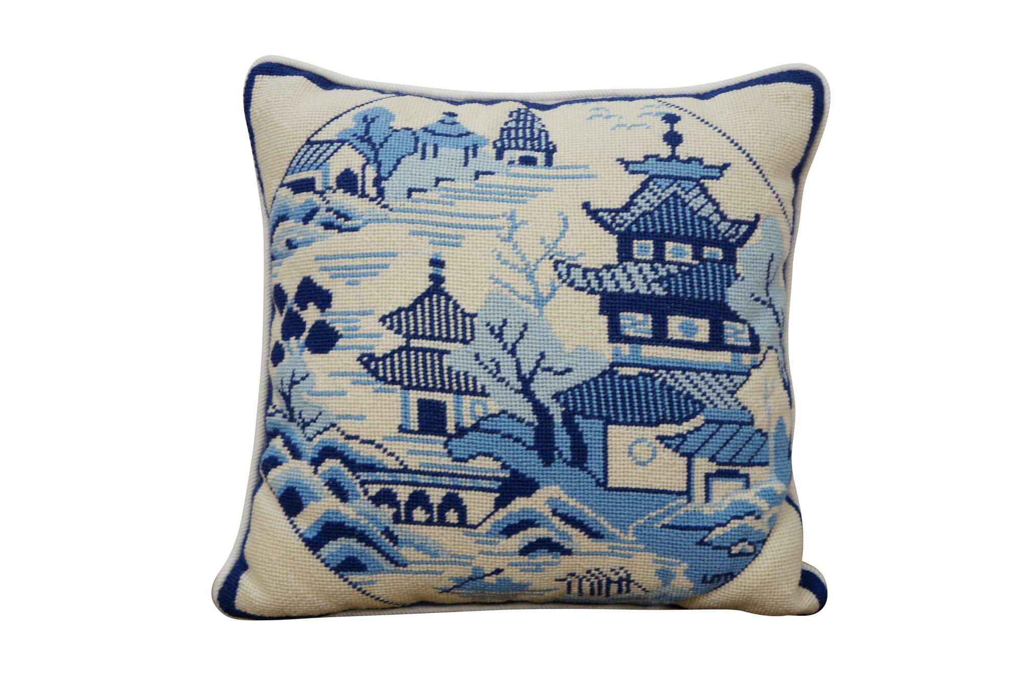 Late 20th century blue and white throw pillow featuring a cross stitched / needplepoint Blue Willow / chinoiserie inspired landscape of pagodas. Blue trim. White courderoy back and piping. Zipper closure, fiber filled.