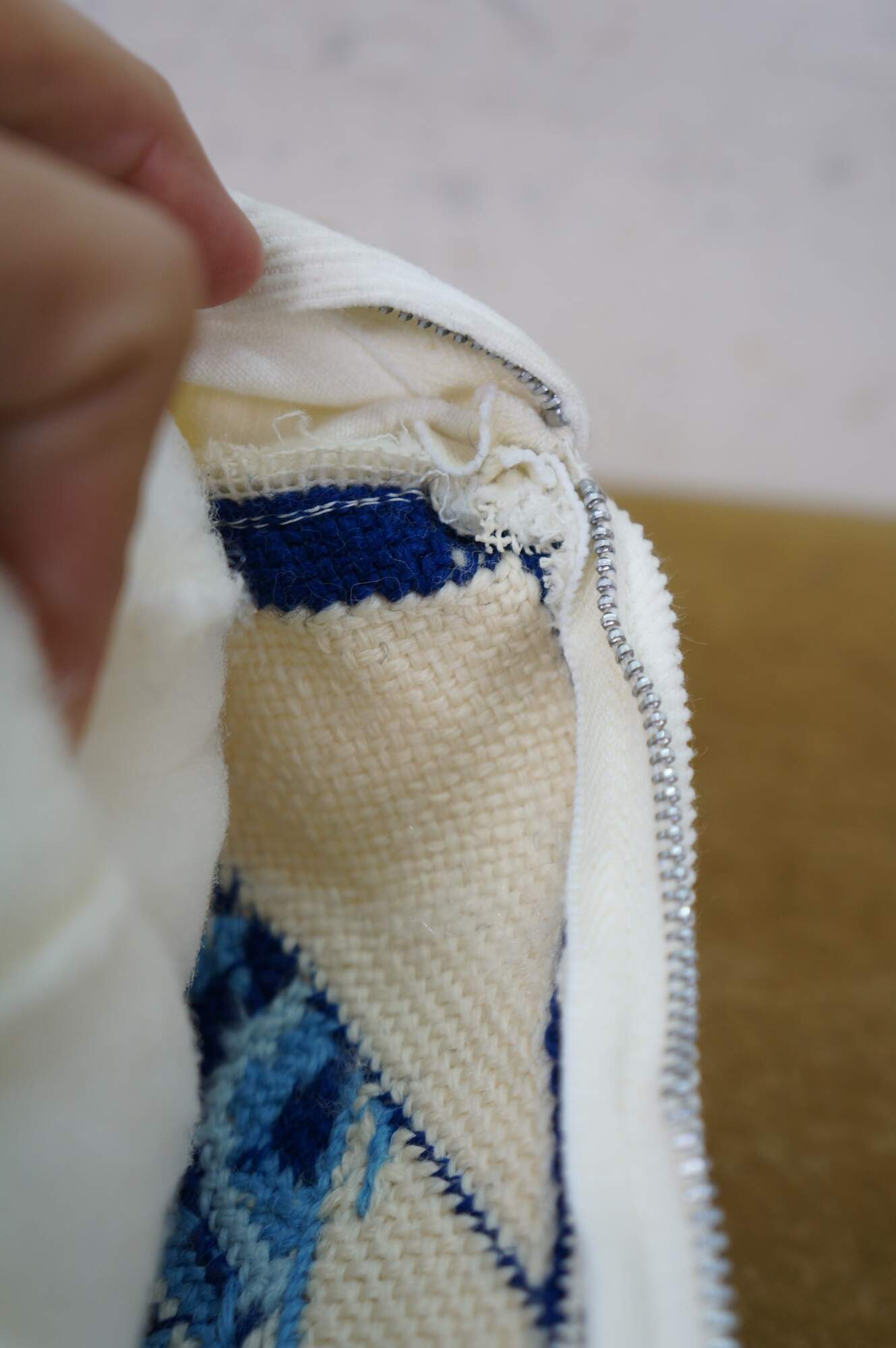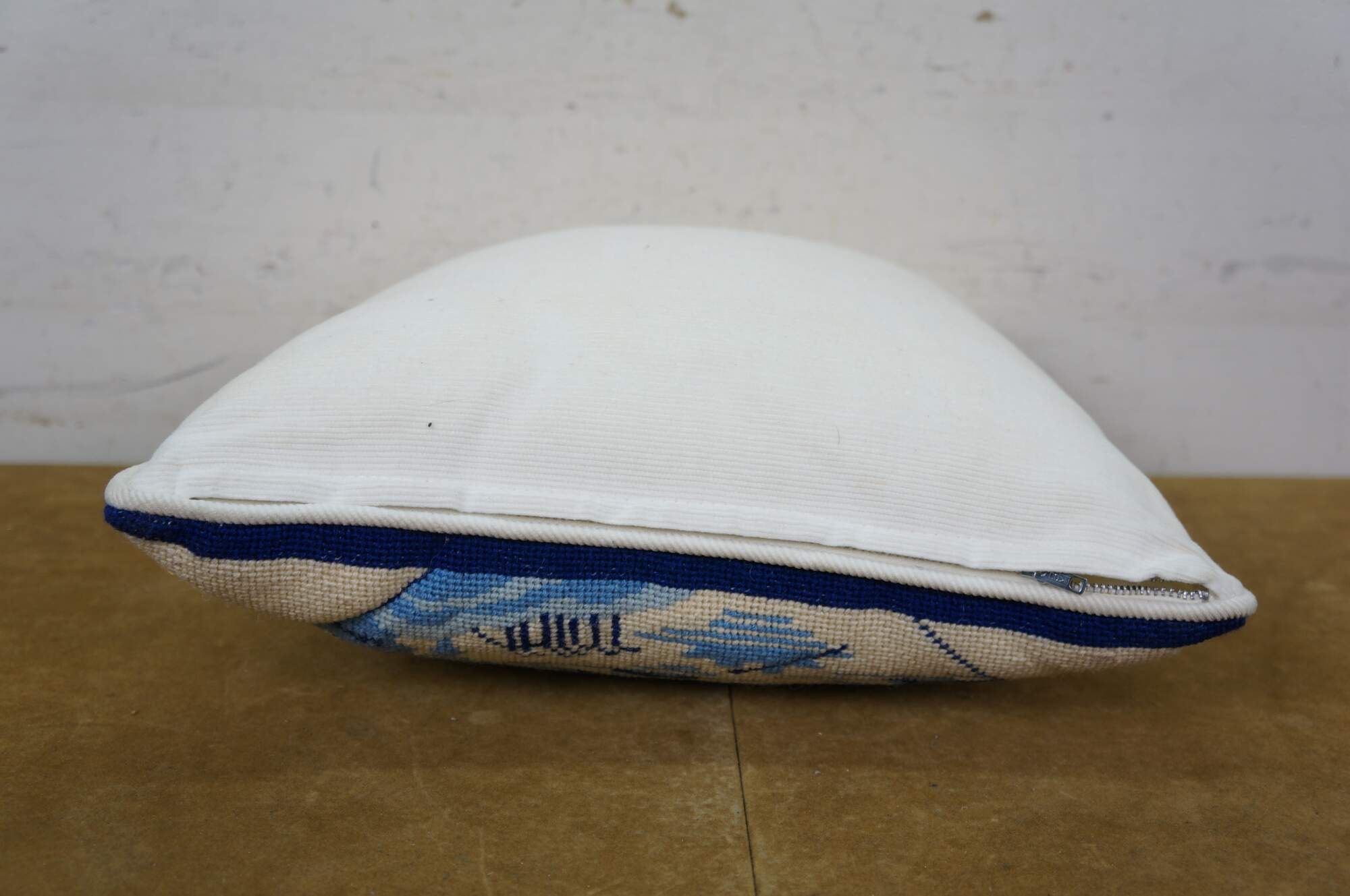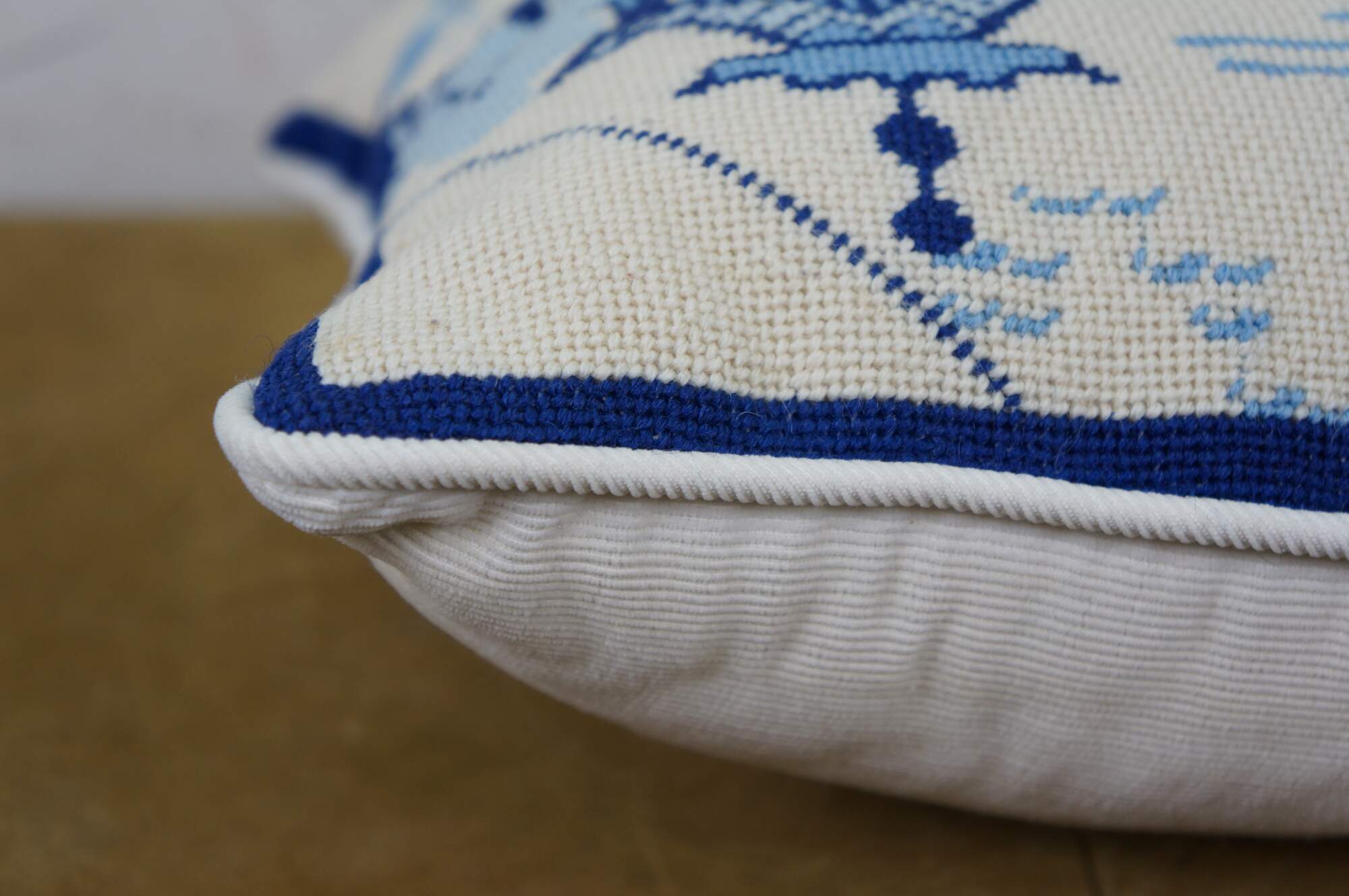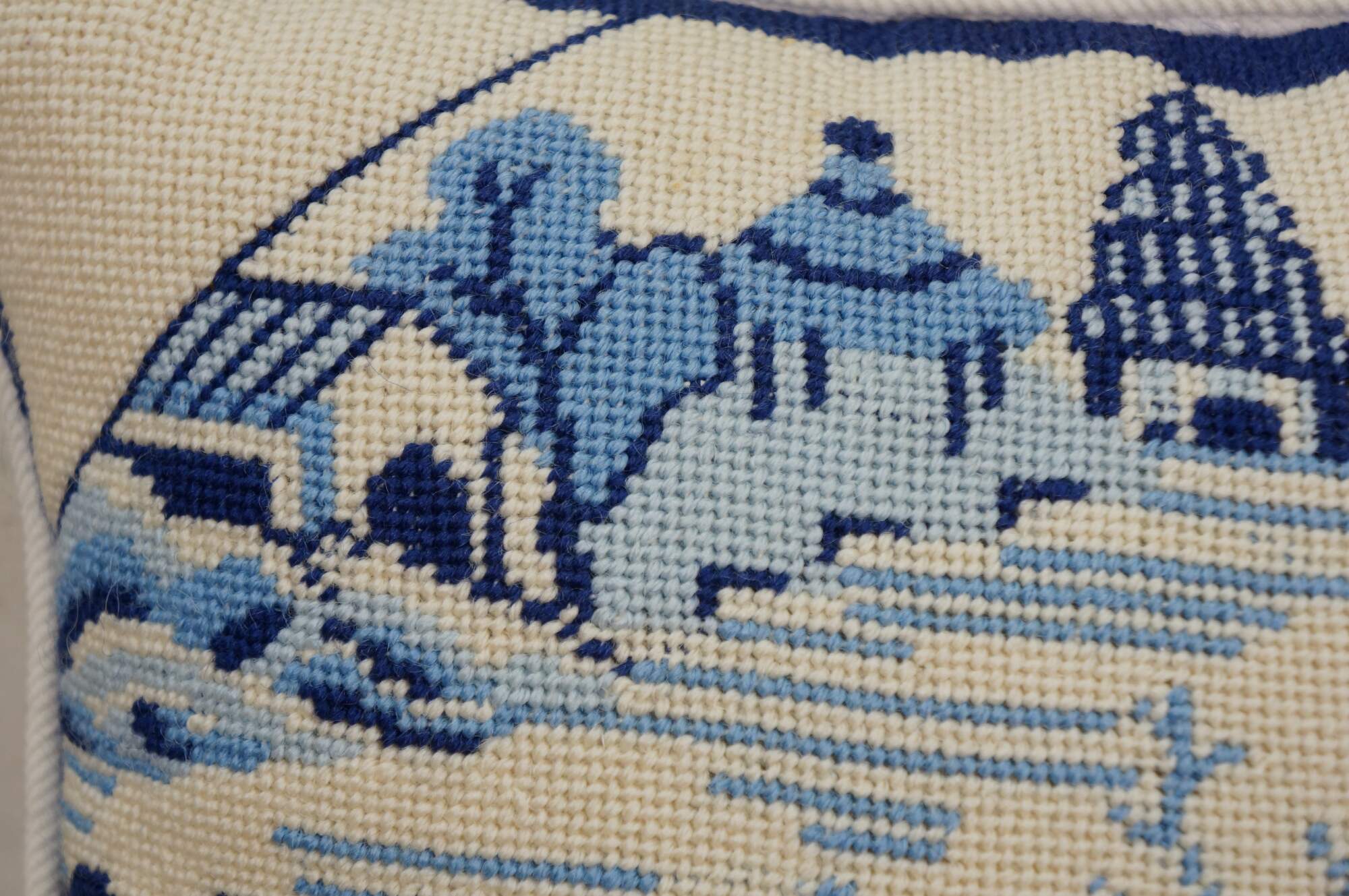 Late 20th century blue and white throw pillow featuring a cross stitched / needplepoint Blue Willow / chinoiserie inspired landscape of pagodas. Blue trim. White courderoy back and piping. Zipper closure, fiber filled.