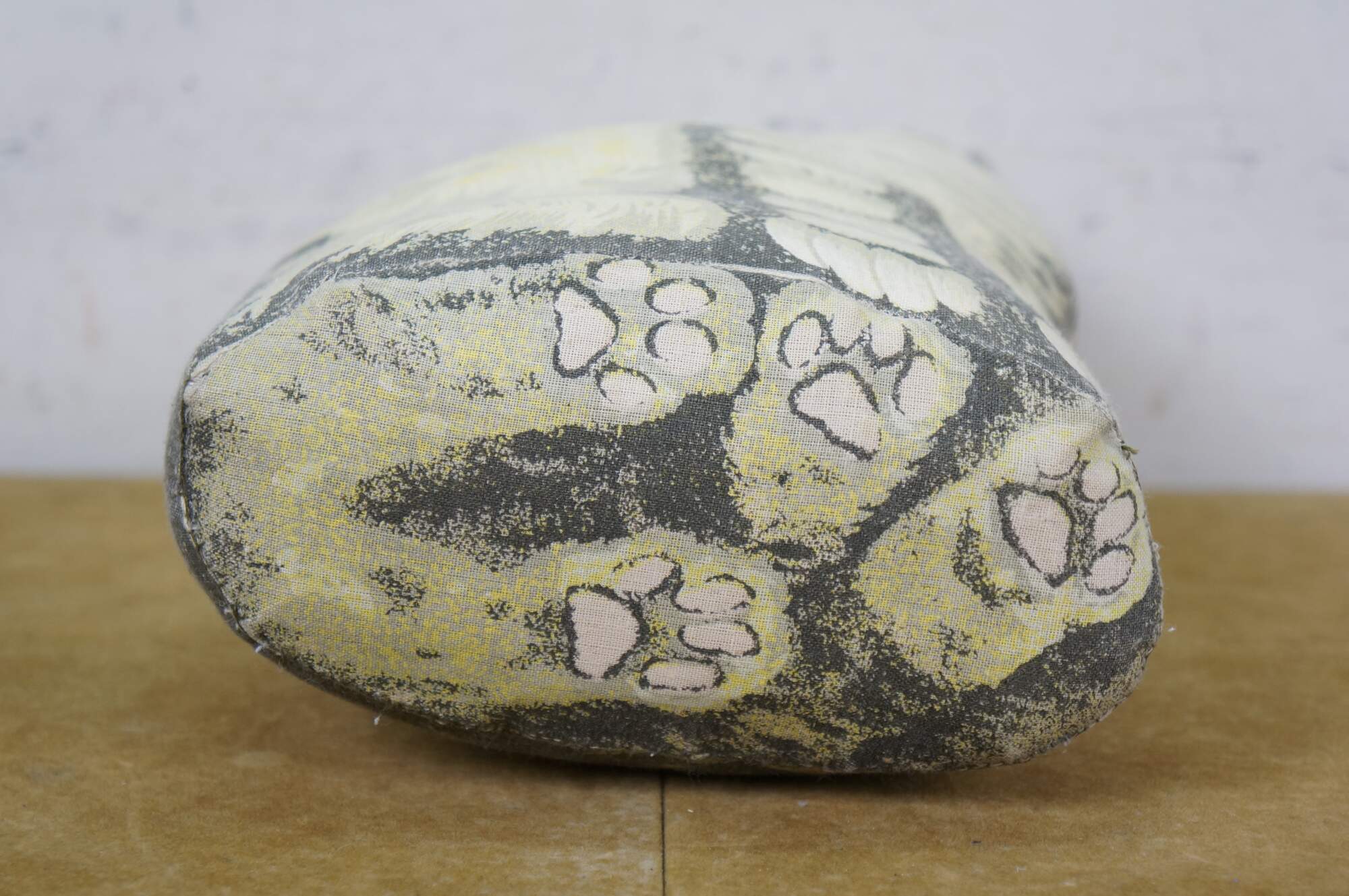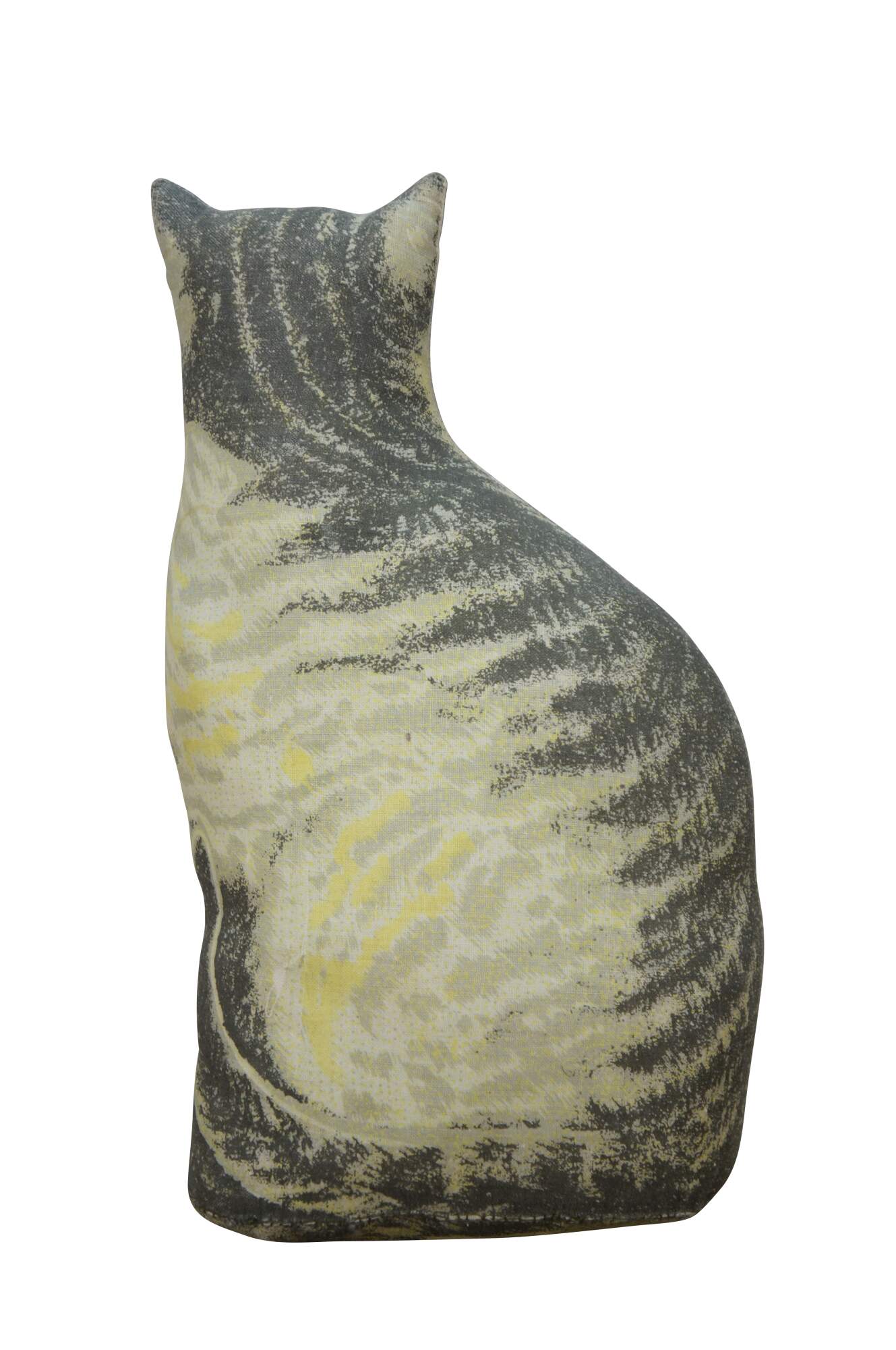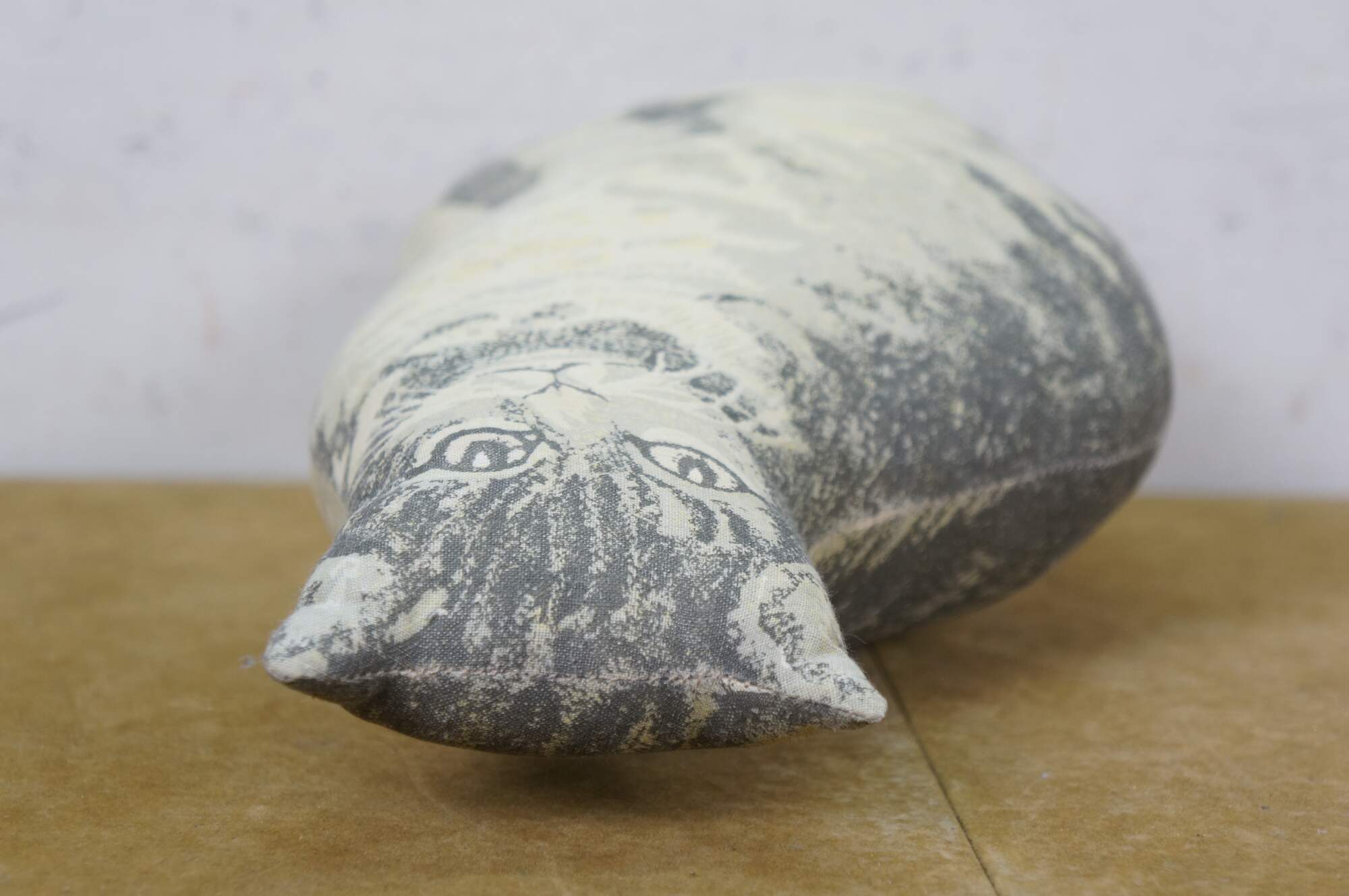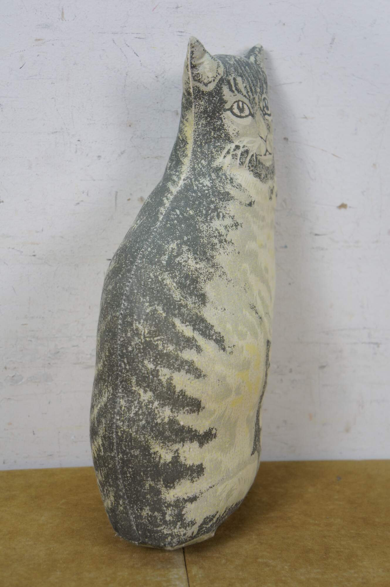 Circa 1970's Arnold Print Works famous Ithaca Kitty / Tabby Cat. Litho printed stuffed cloth doll / pillow in the shape of a seated cat with gray tabby fur and pink feet.