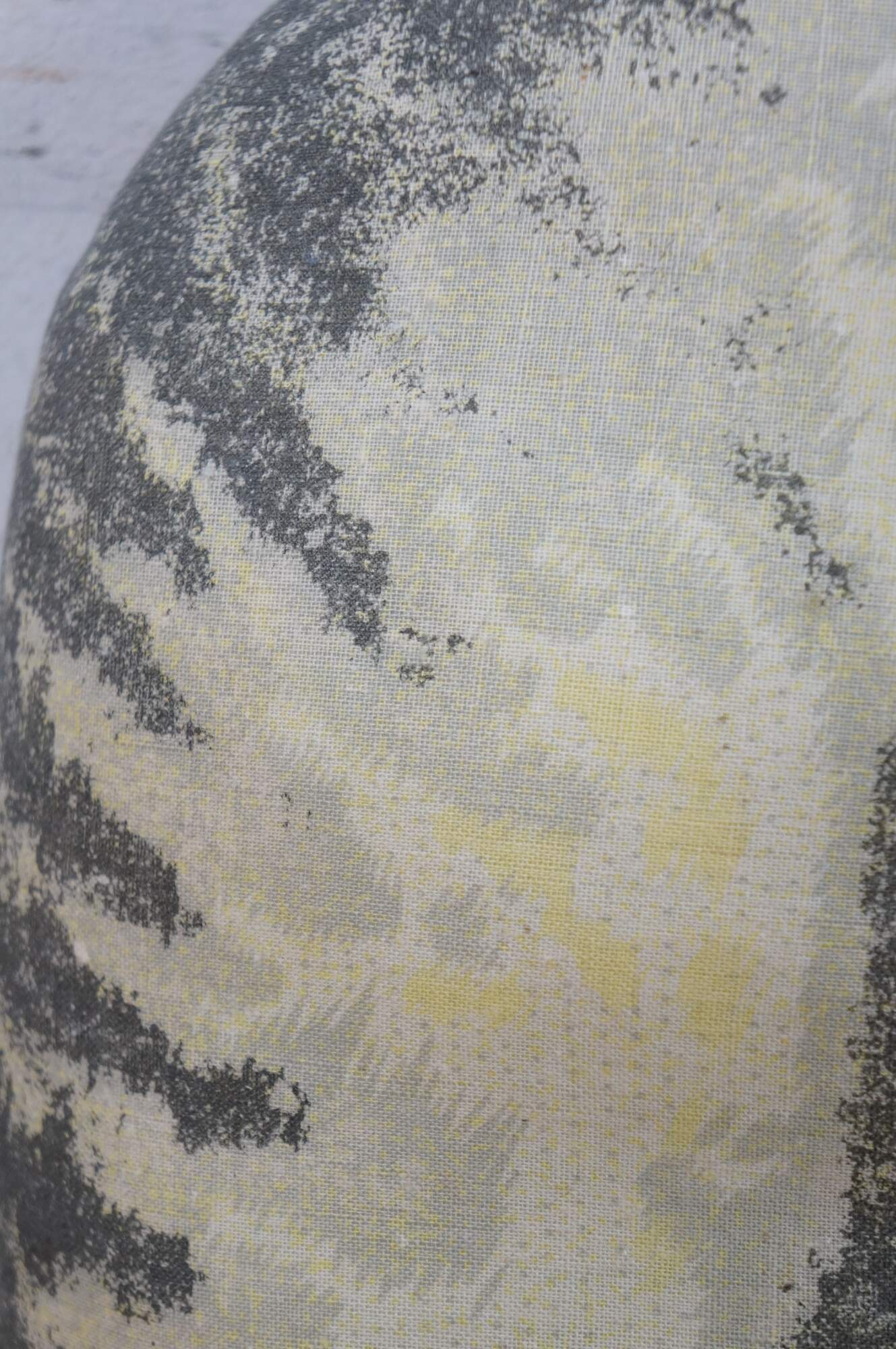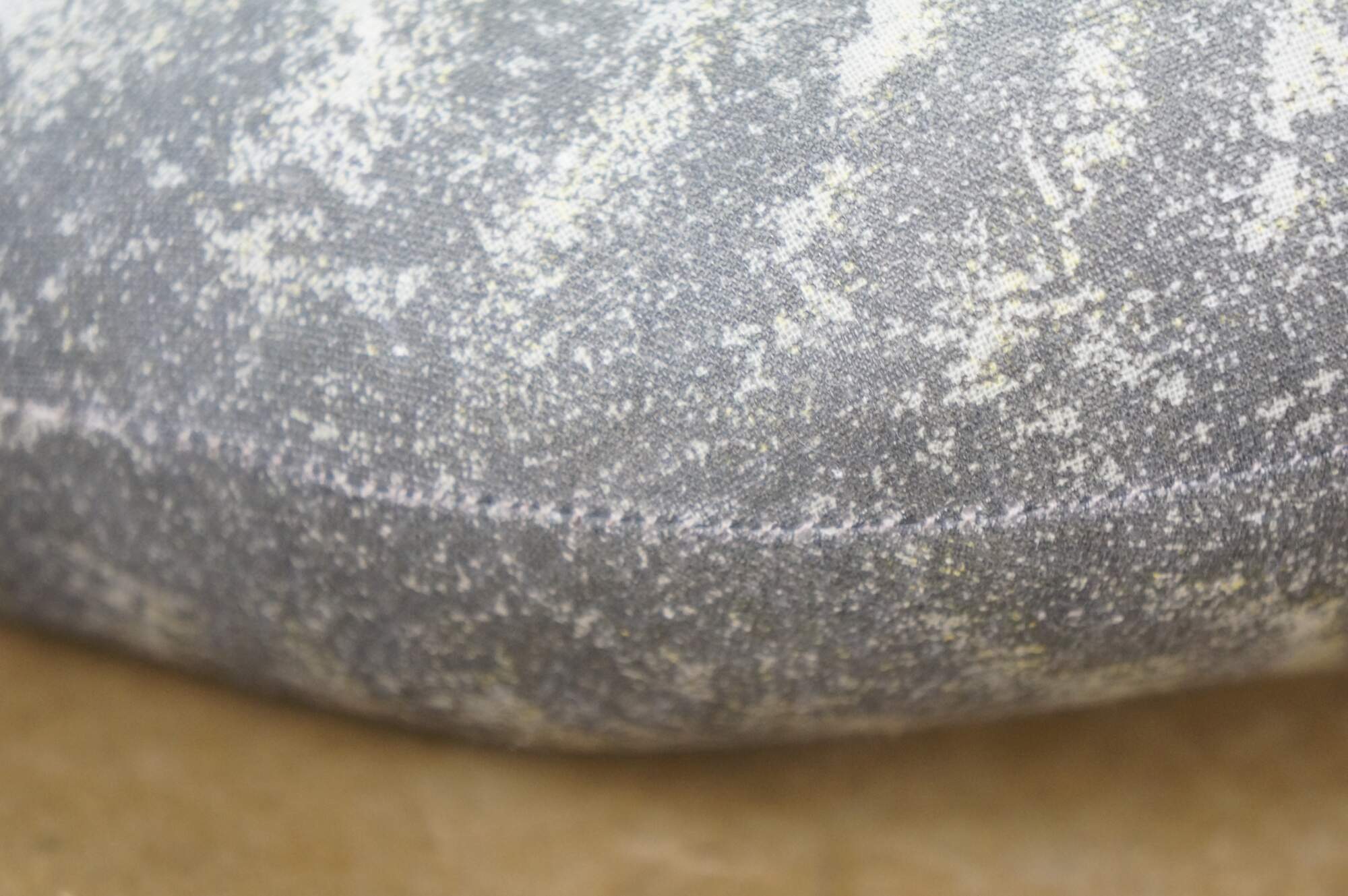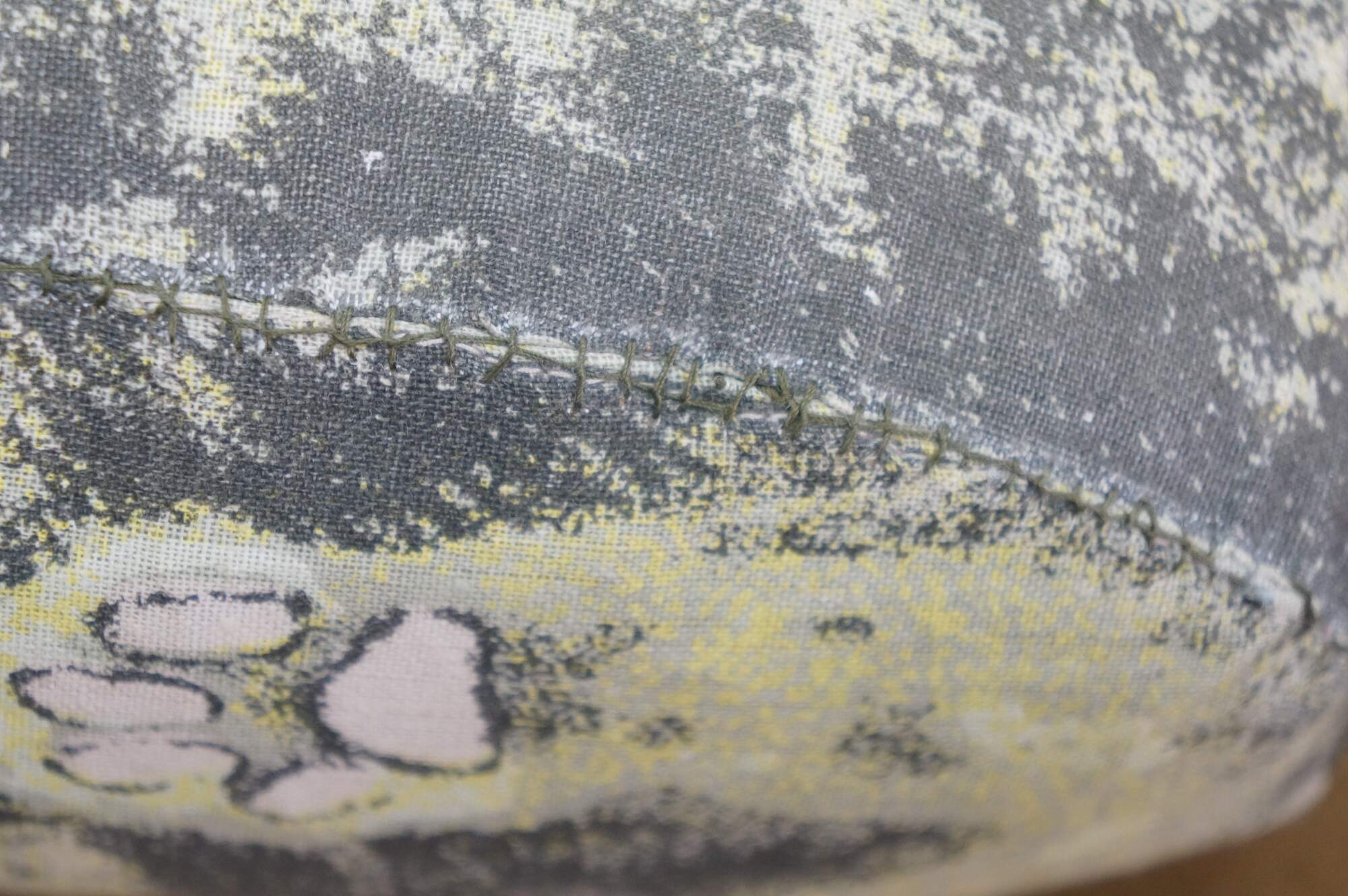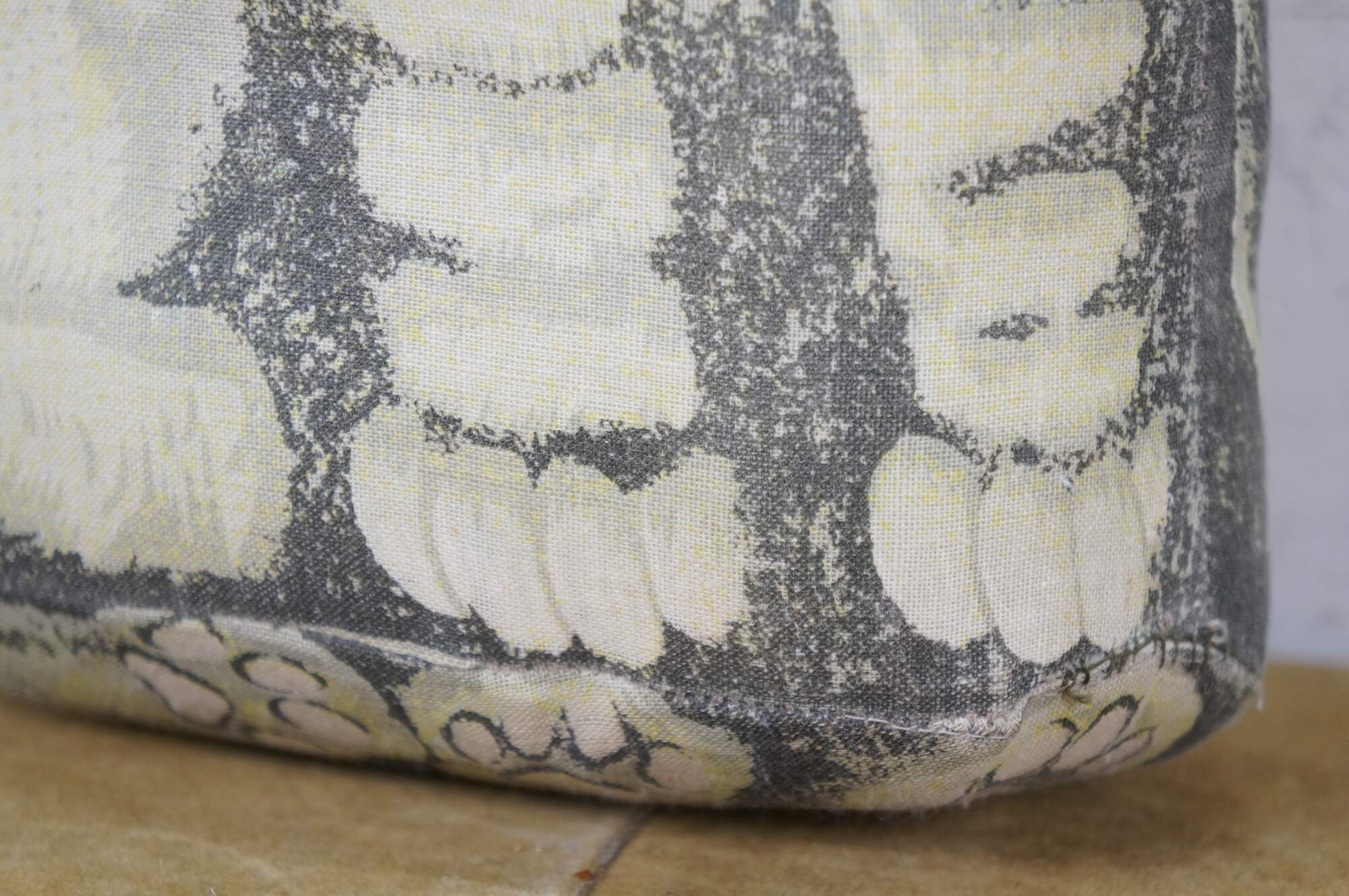 Circa 1970's Arnold Print Works famous Ithaca Kitty / Tabby Cat. Litho printed stuffed cloth doll / pillow in the shape of a seated cat with gray tabby fur and pink feet.