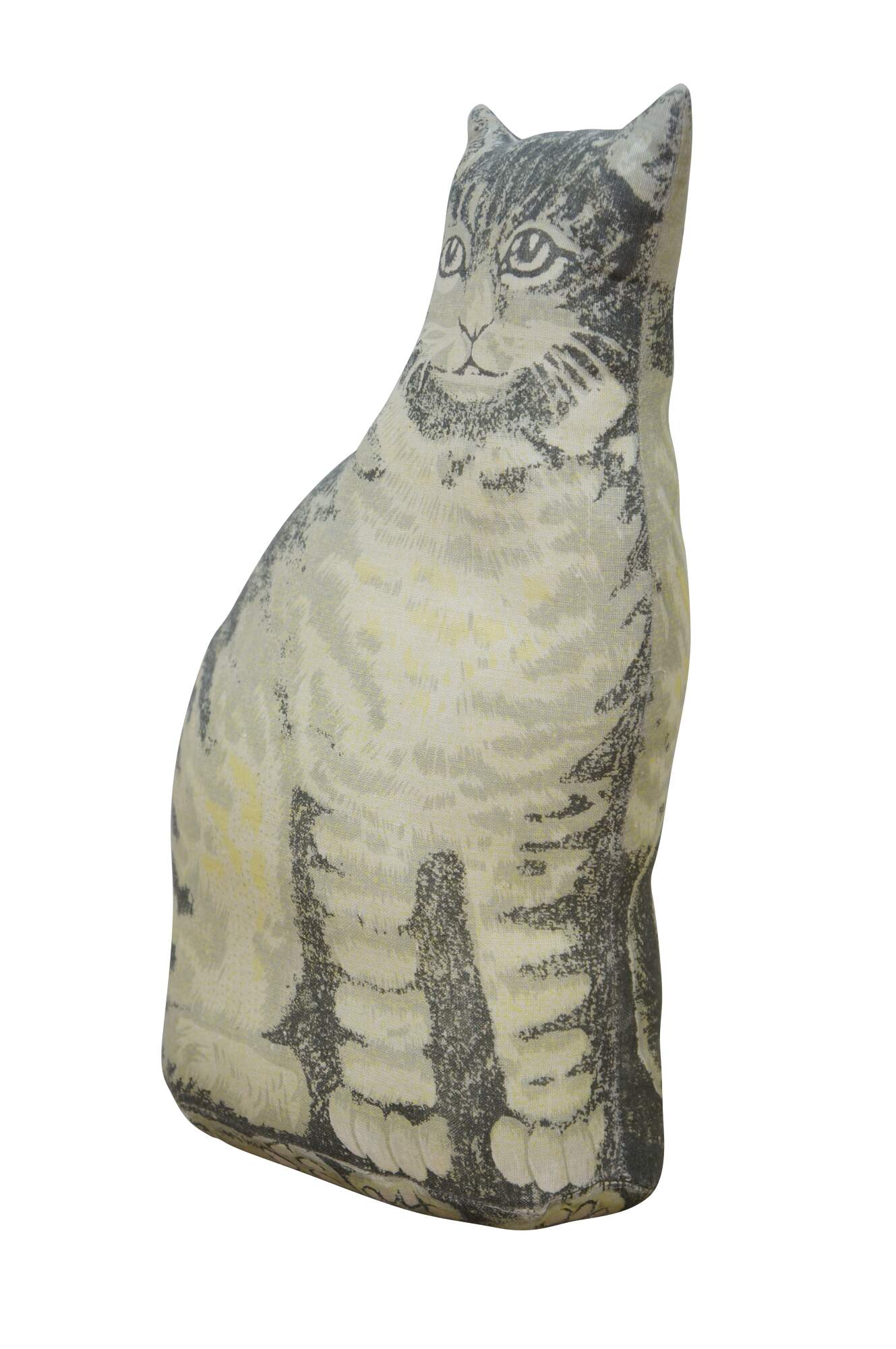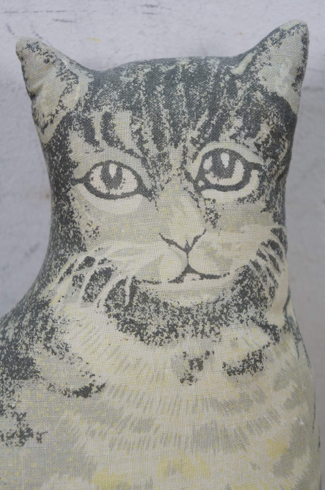 "The Ithaca Kitty, originally known as "The Tabby Cat", was a popular stuffed toy in the United States which started a fad for plush toys that lasted from its introduction in 1892 until after World War I. The Ithaca Kitty was inspired by a gray tabby cat named Caesar Grimalkin in Ithaca, New York. The cat's owners, William Hazlitt Smith and Celia Smith, had the cat photographed and had Celia's sister-in-law, Charity Smith, paint a likeness of the cat onto a three-piece pattern designed by Celia. Although Grimalkin was a polydactyl cat with seven toes on each front paw, the Smiths felt that five toes appeared more normal and patented the "toy animal figure" in October 1892. The design was sold by the Smiths for one cent a yard to Arnold Print Works, which then sold the printed pattern as "The Tabby Cat" on half a yard of muslin for ten cents each in late 1892. Nearly 200,000 were sold that first holiday season. The toy was very successful nationwide, making appearances at the 1893 Chicago World's Fair and in the windows of Wanamaker's department store in Philadelphia. The toy's success led to other stuffed animals, including kittens, dogs, and bunnies. The Ithaca Kitty was especially known for its lifelike appearance and was allegedly used by farmers to scare away birds and by the Central Park police station to scare mice. There was a massive revival of these simple printed cat, rabbit, and dog shaped pillows and padded doorstops in the early to mid 1970s. They were sold both already made up in fancy stores like Bloomingdale’s and Saks, and as printed yardage for self-assembly. A giant fad, at the crest it would have been hard to find a fashionable home (at least in the greater New York area) without one." (Wikipedia / Facebook)