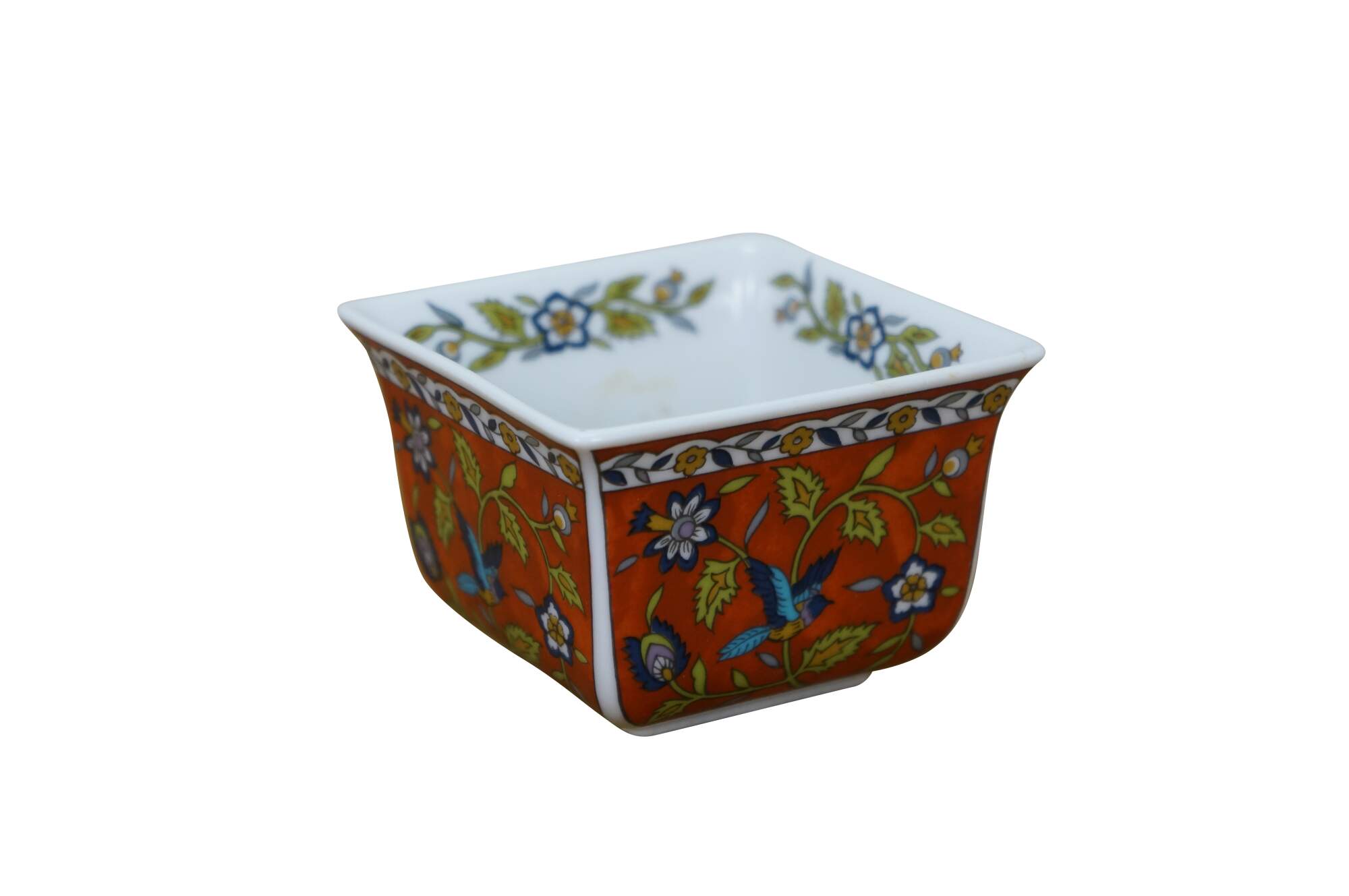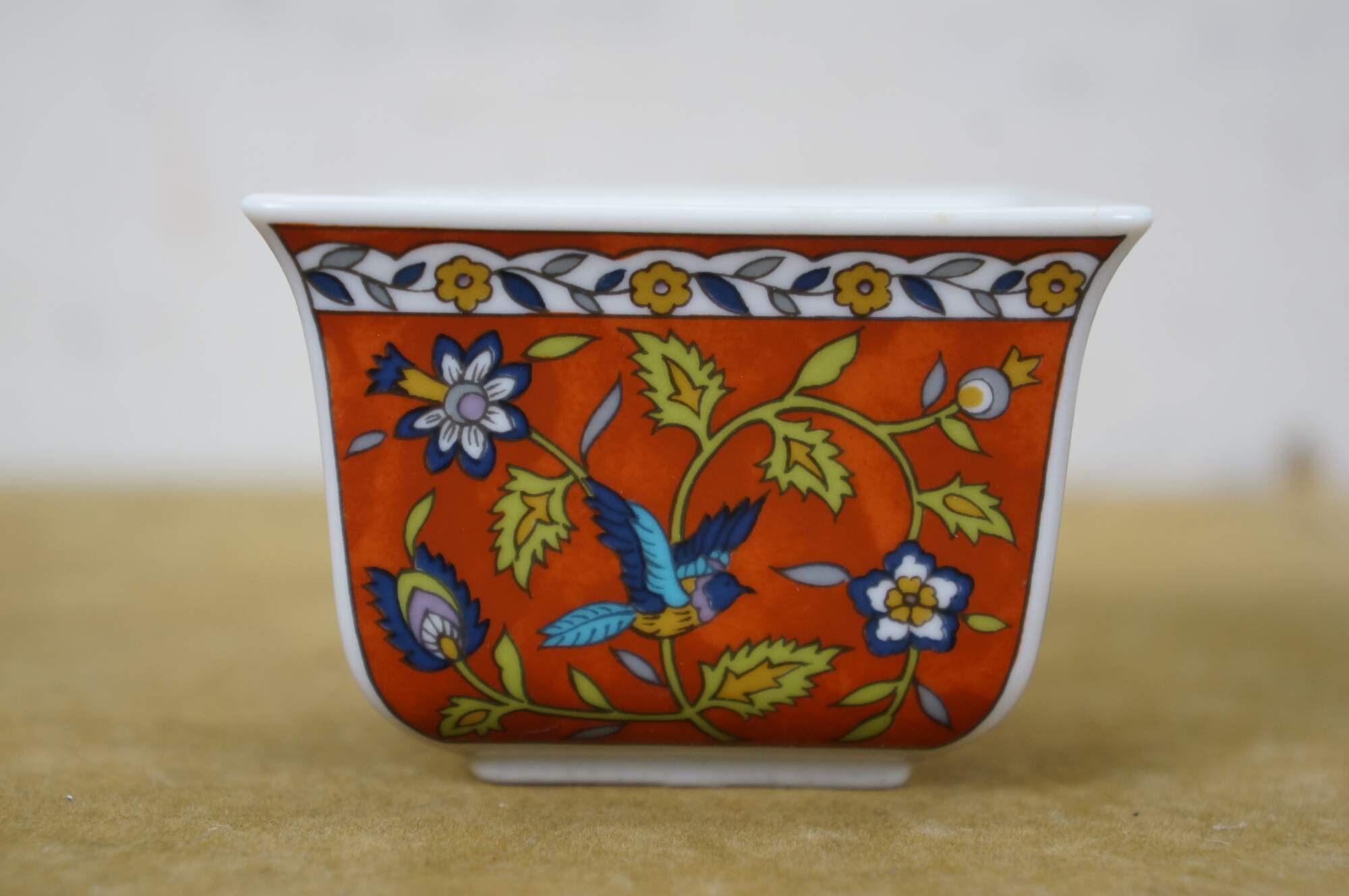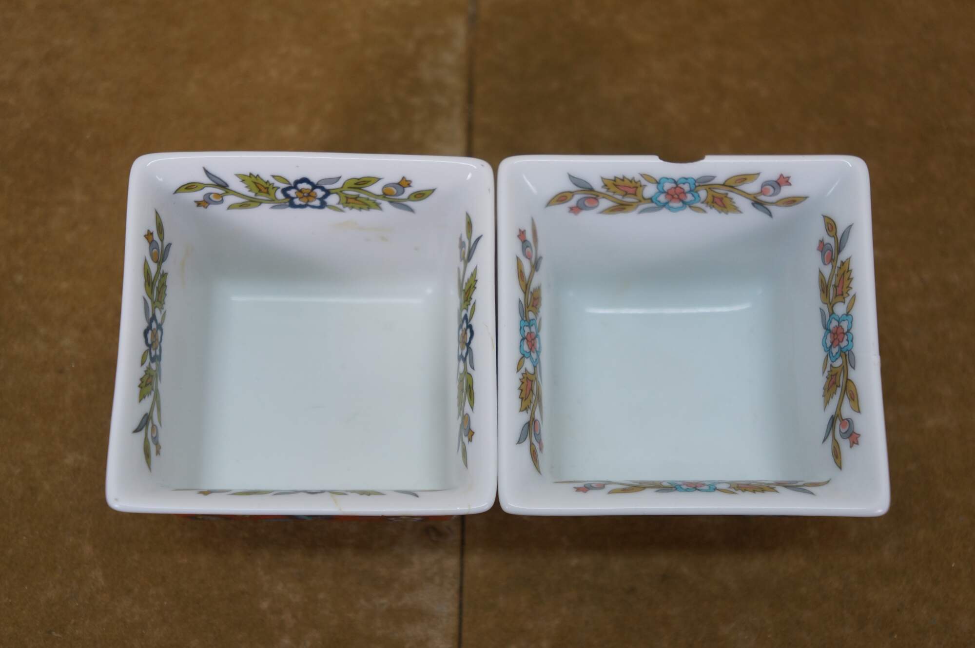 Pair of circa 1983 Takahashi Silk Road collection porcelain nut / bon bon dishes. Square form with rounded base edges and flared mouth, featuring matching floral designs accented with a bird, one with a red orange background and one with a dark blue background.