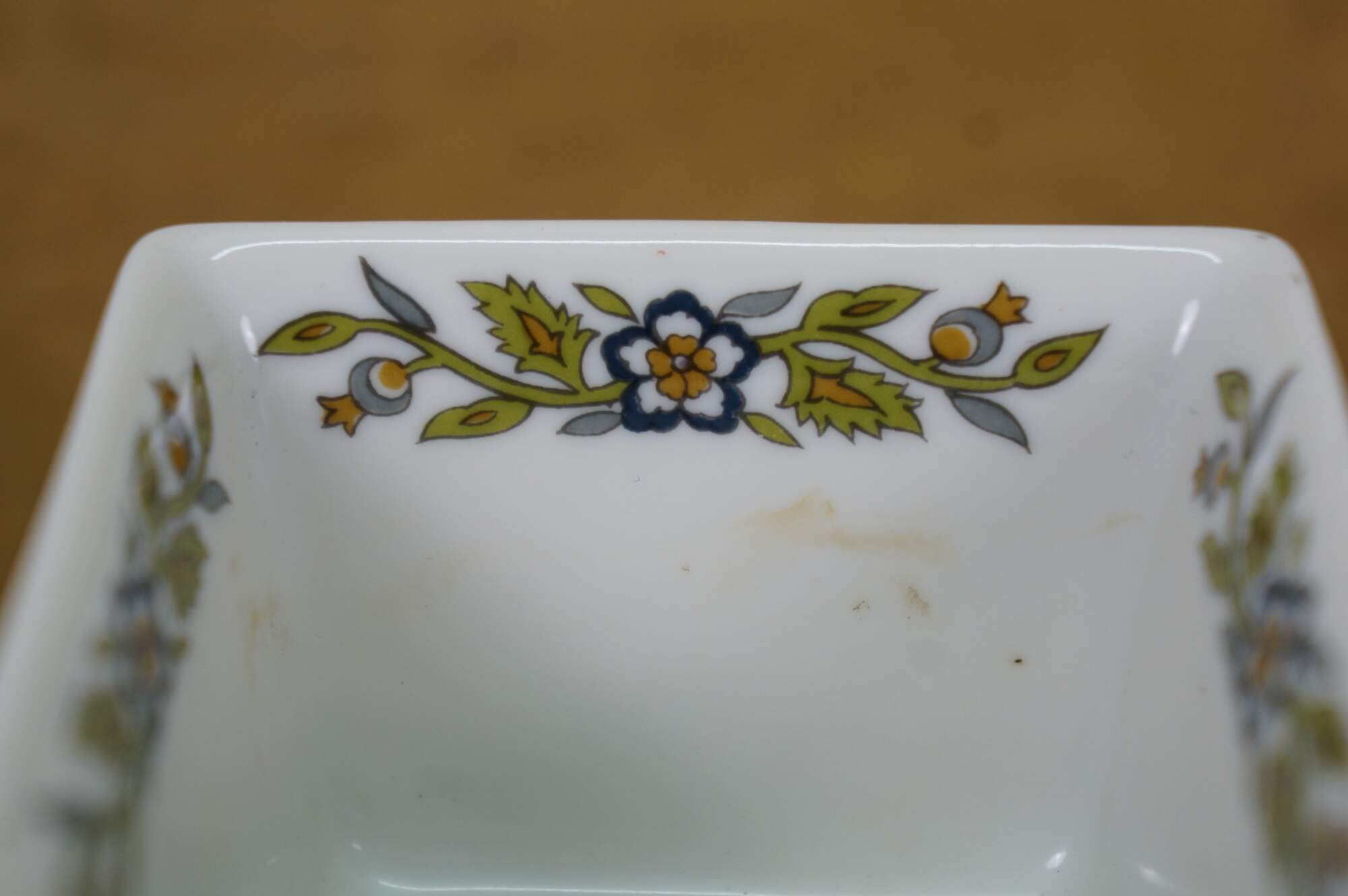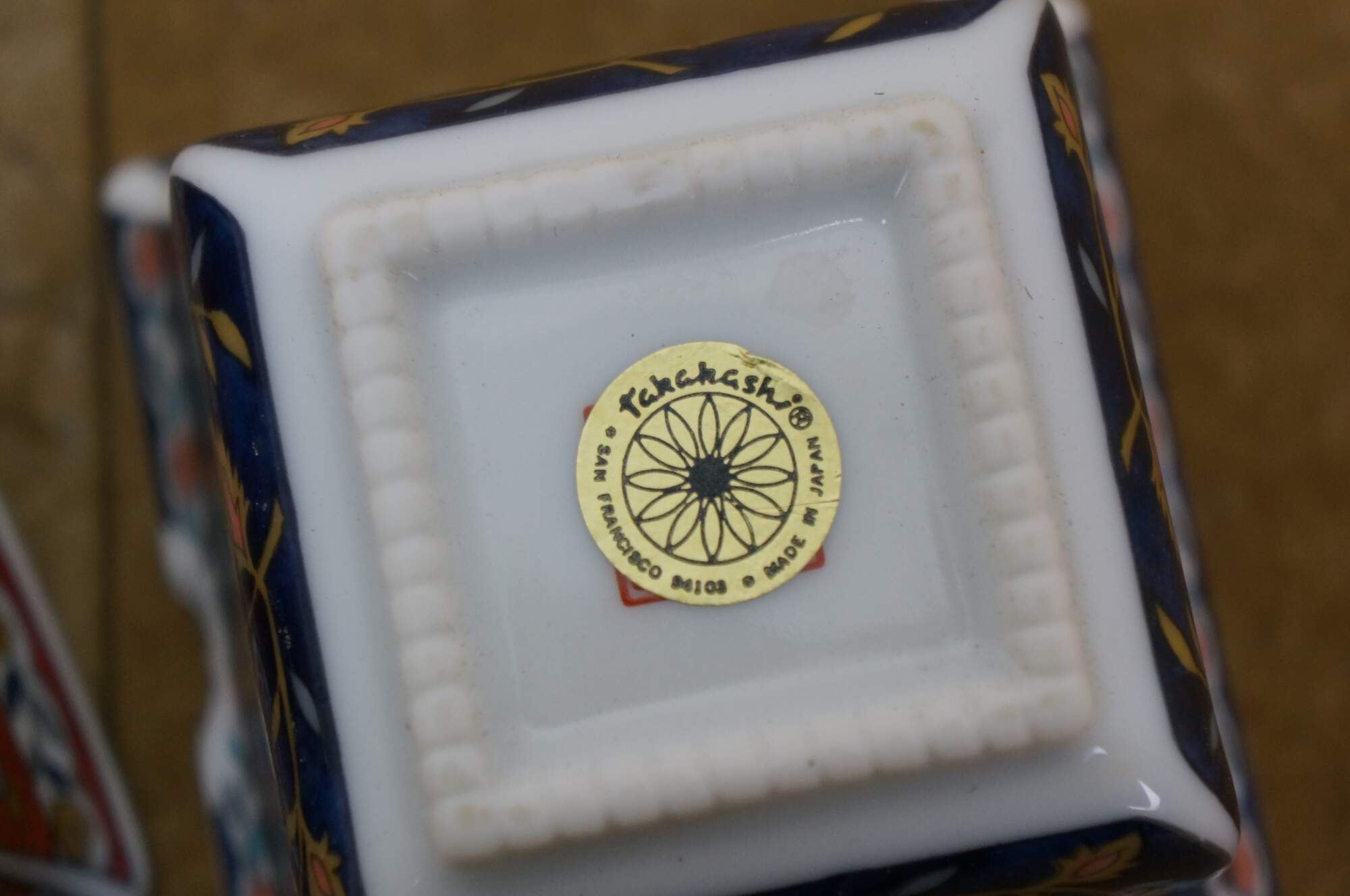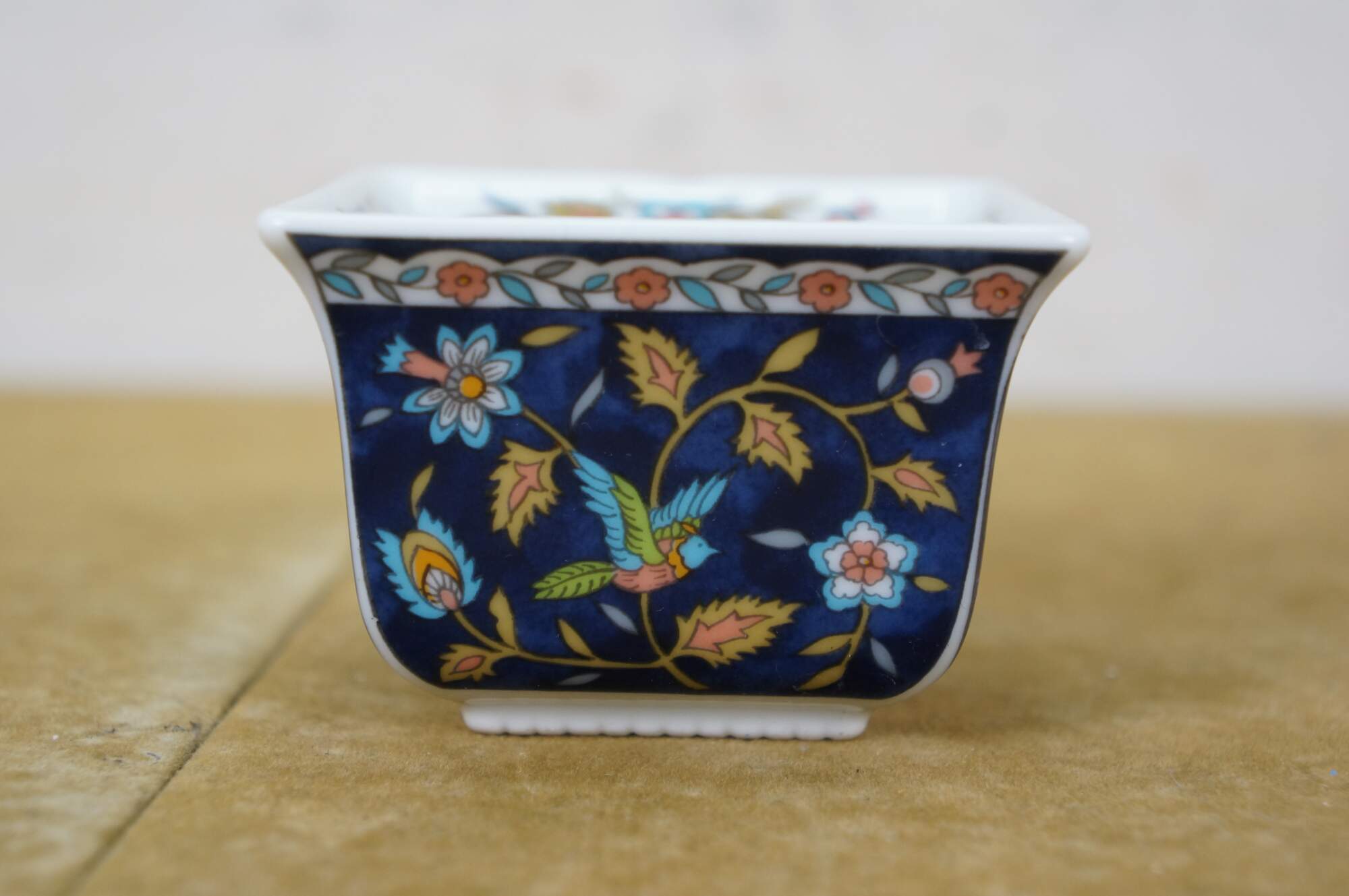 Pair of circa 1983 Takahashi Silk Road collection porcelain nut / bon bon dishes. Square form with rounded base edges and flared mouth, featuring matching floral designs accented with a bird, one with a red orange background and one with a dark blue background.