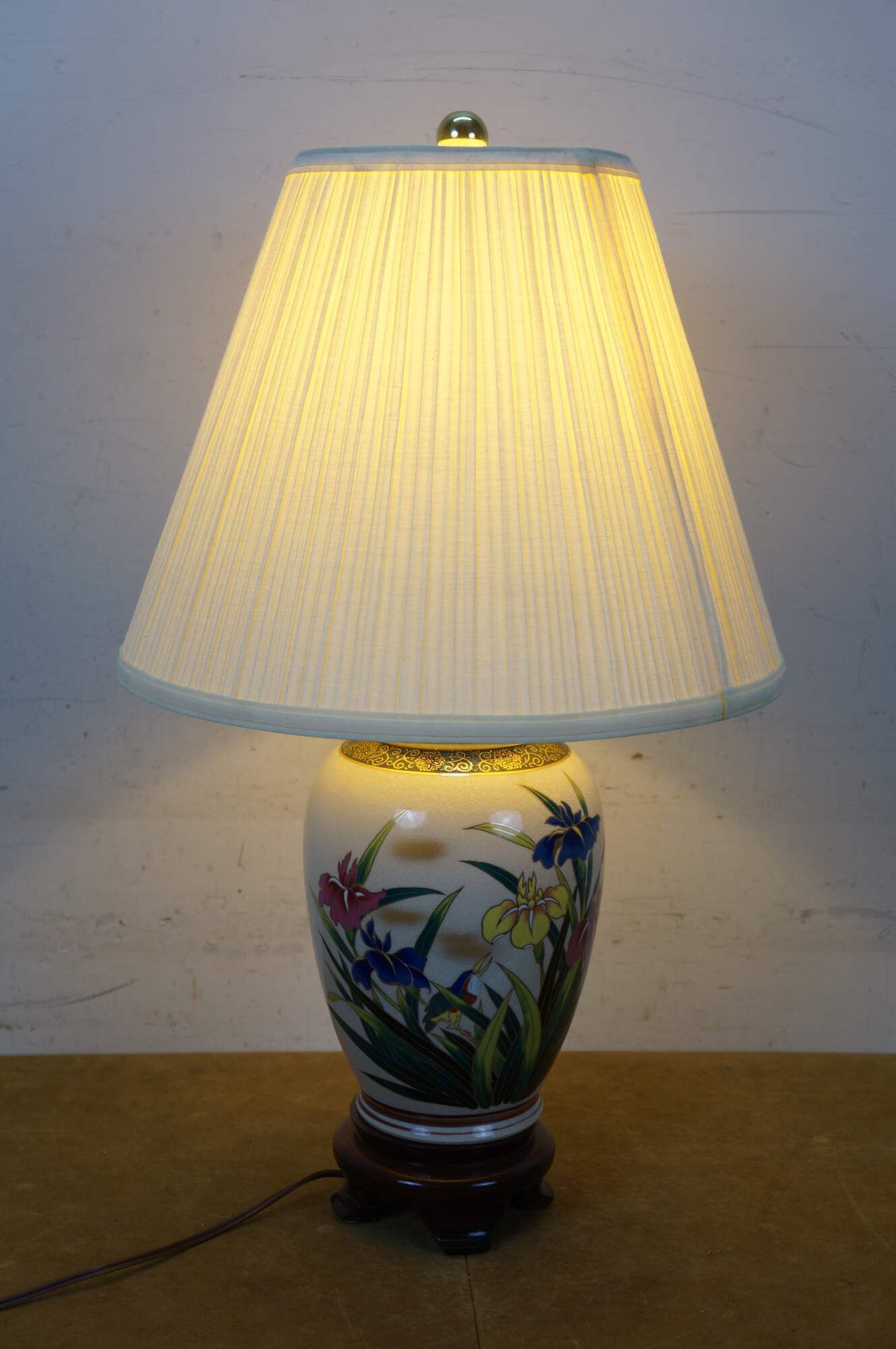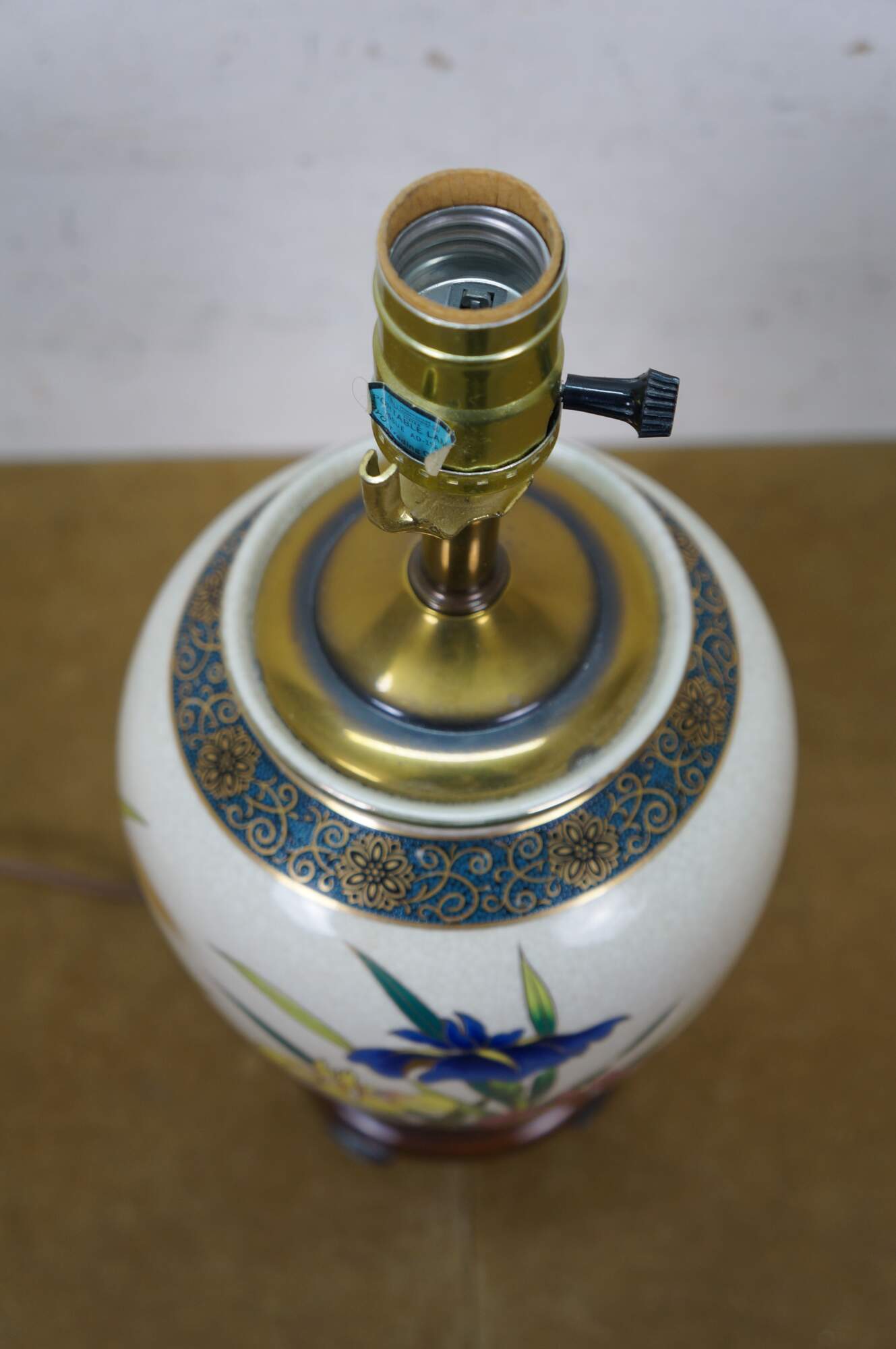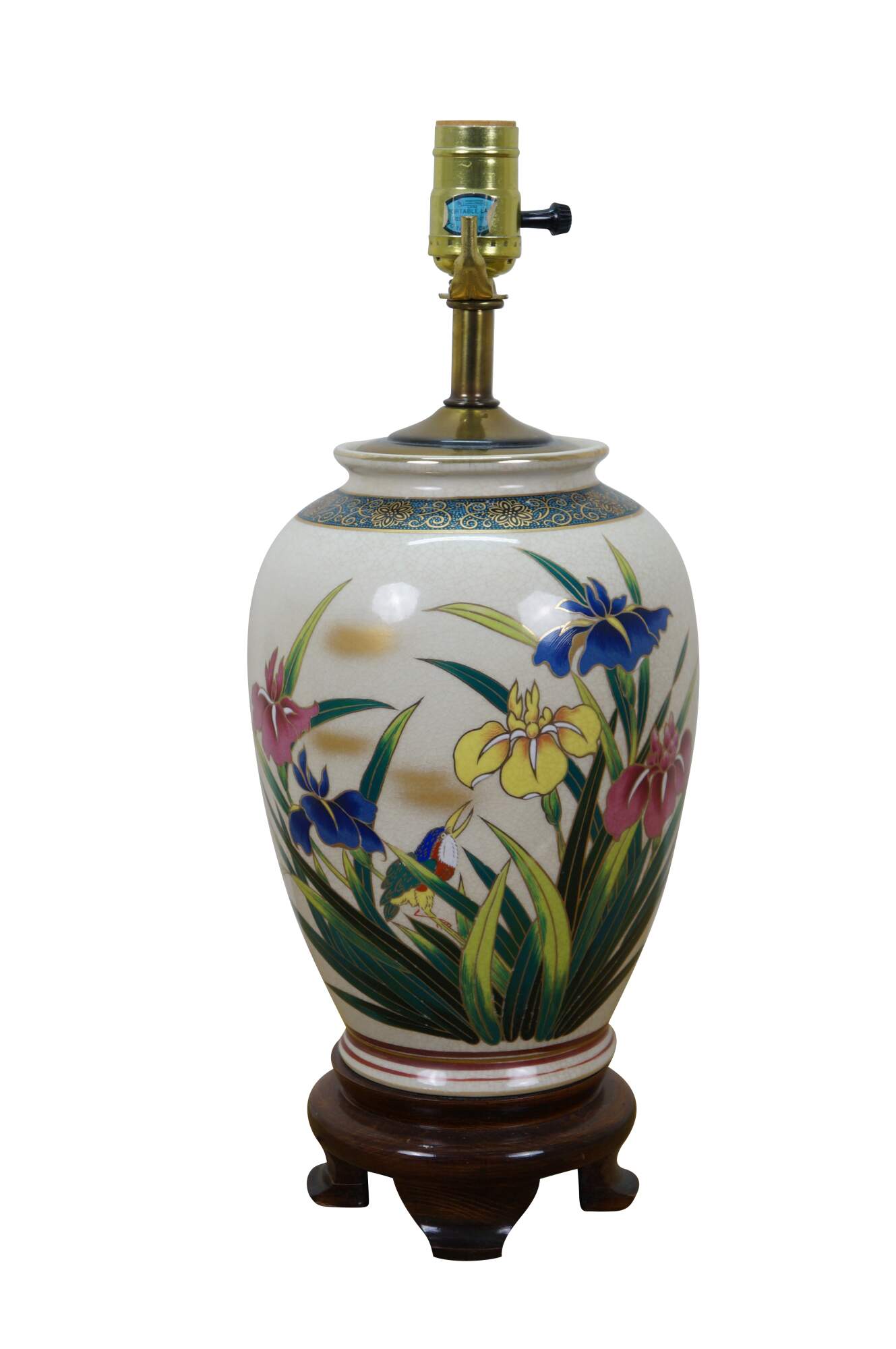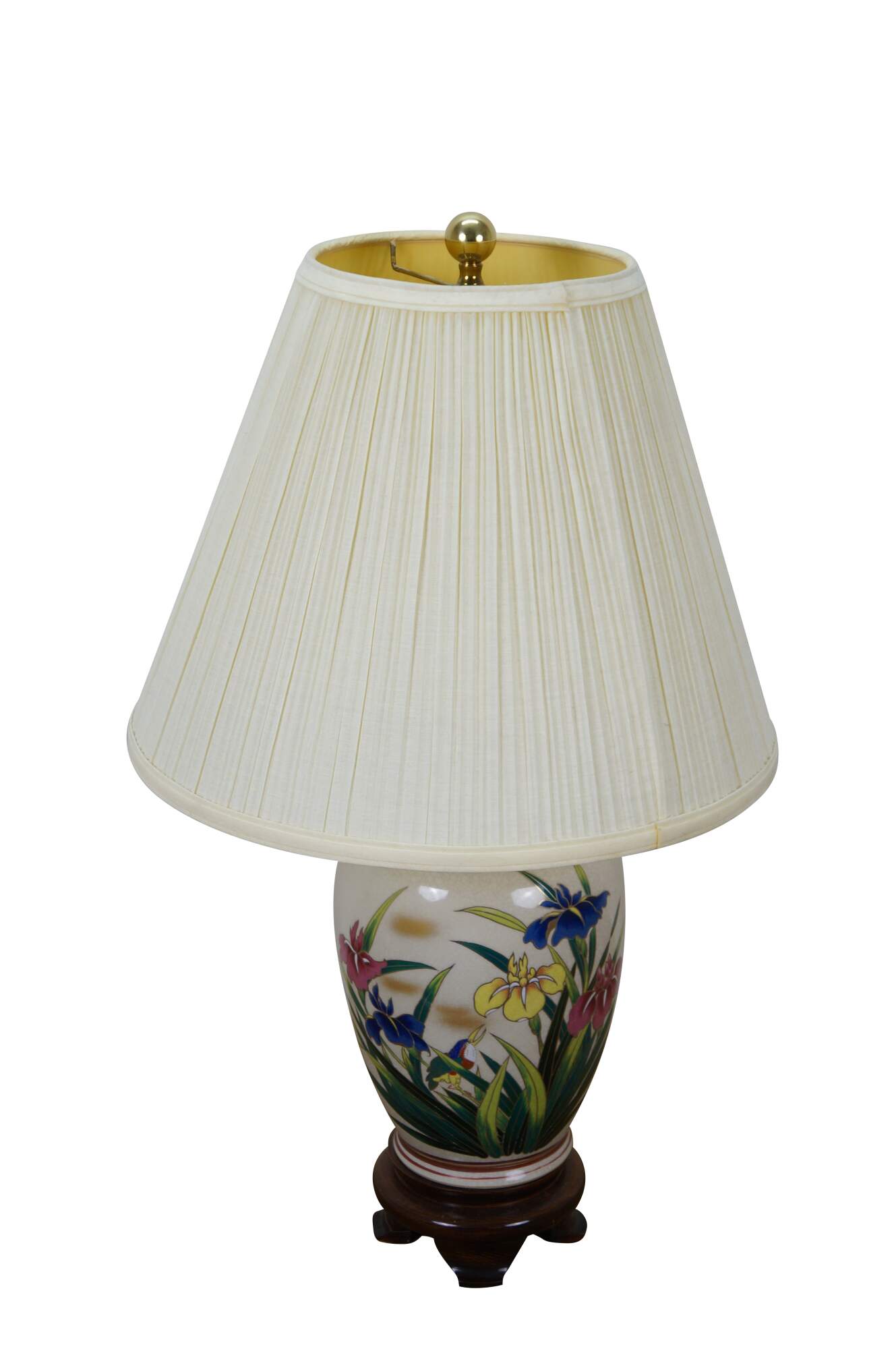 Late 20th century porcelain ginger jar / vase shaped table lamp, painted with a design of multi-colored irises and birds. Footed wood base. Includes harp, brass orb finial, and white fabric shade.