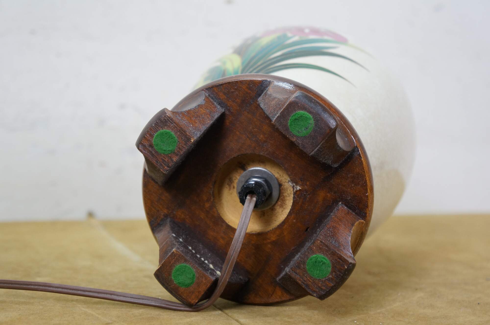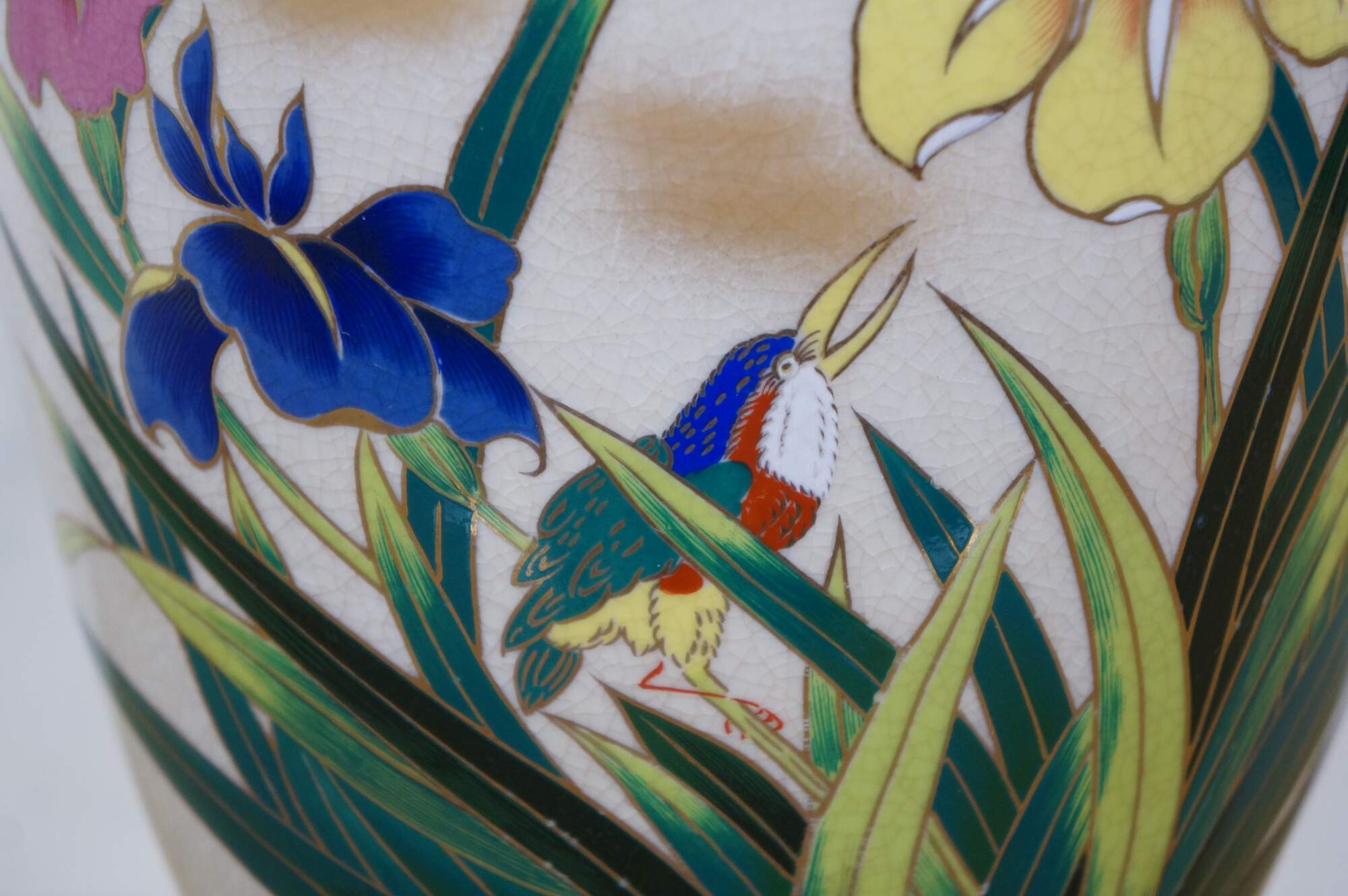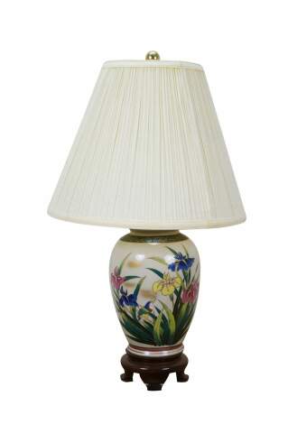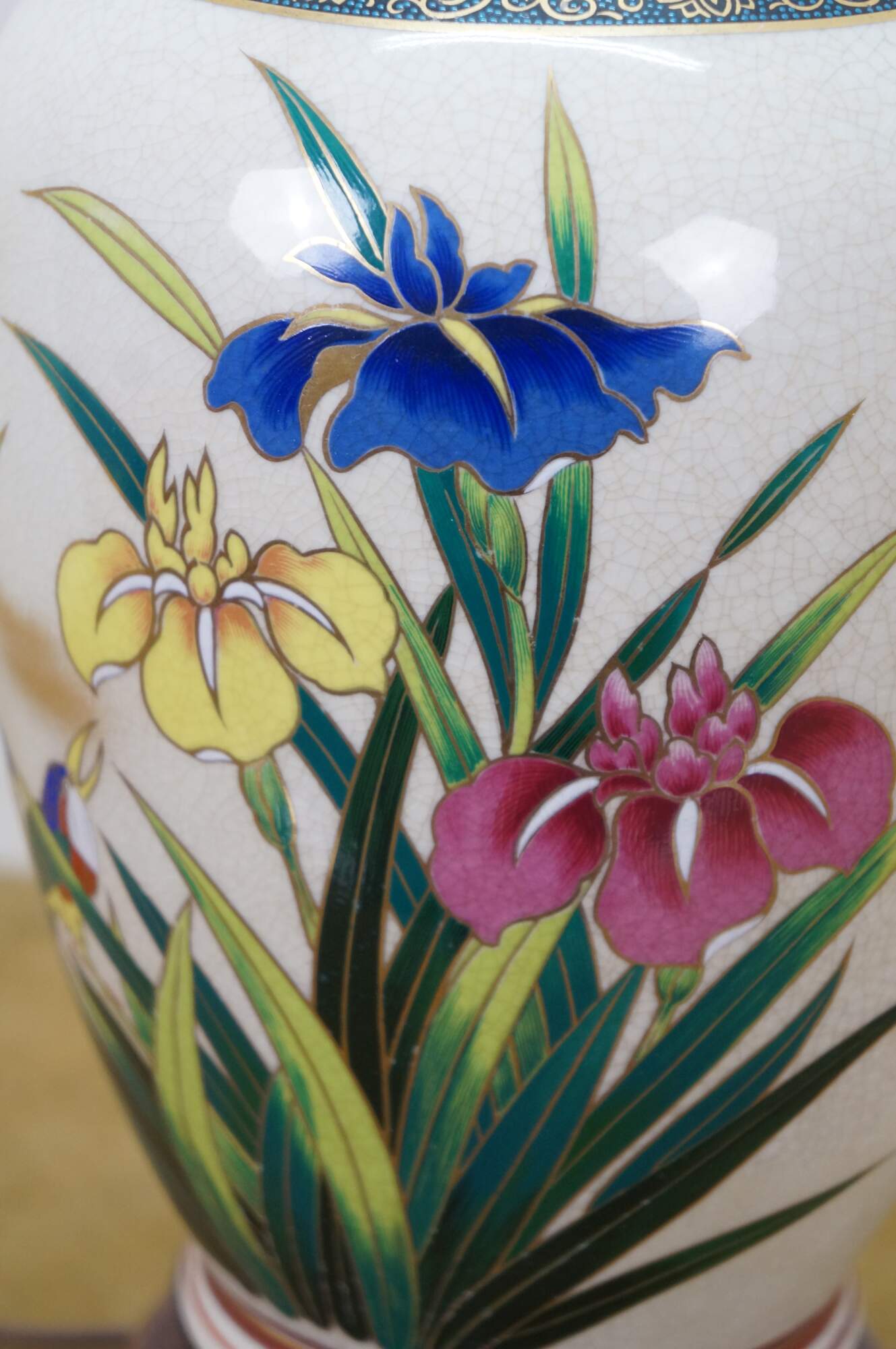 Late 20th century porcelain ginger jar / vase shaped table lamp, painted with a design of multi-colored irises and birds. Footed wood base. Includes harp, brass orb finial, and white fabric shade.