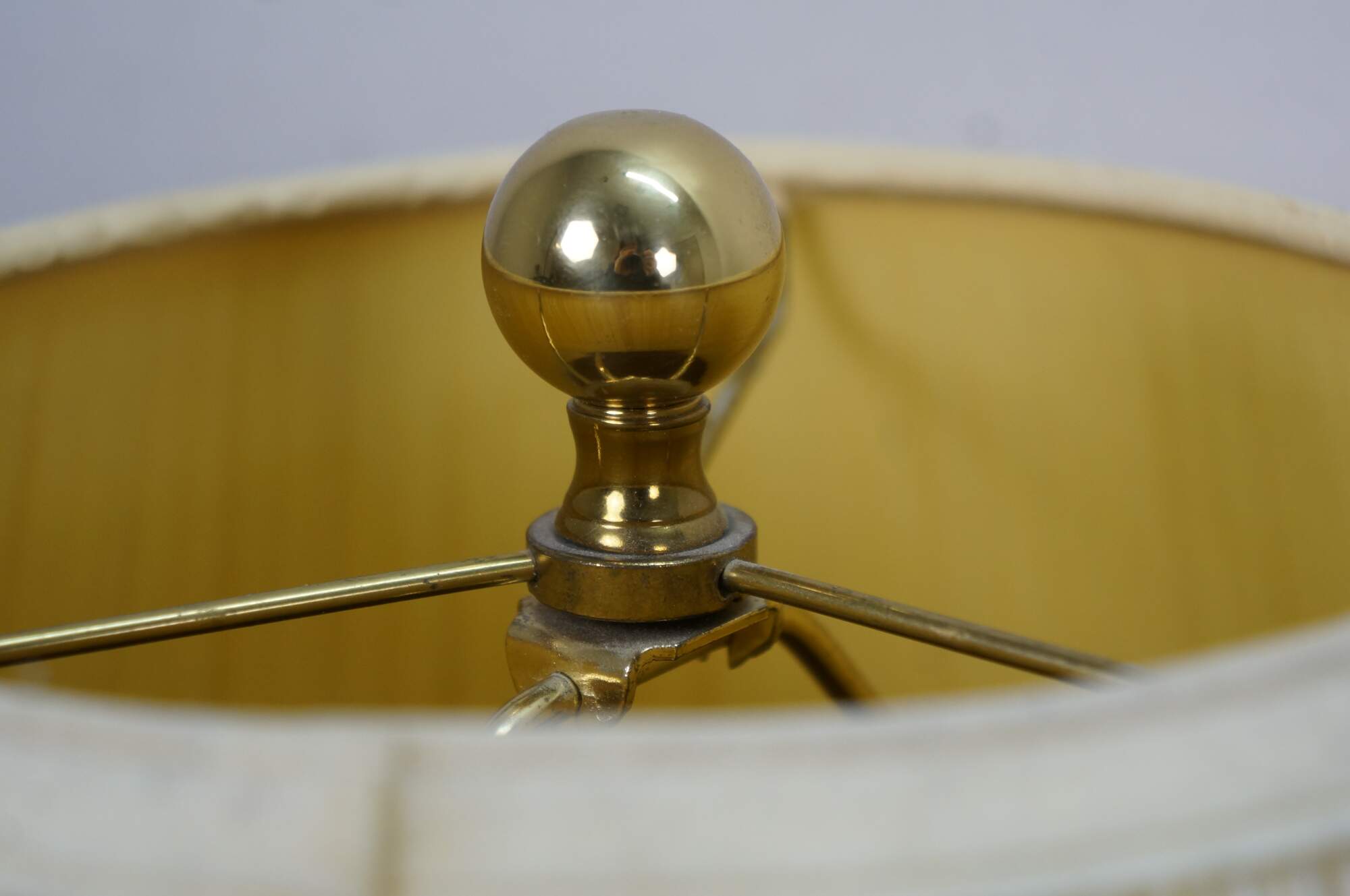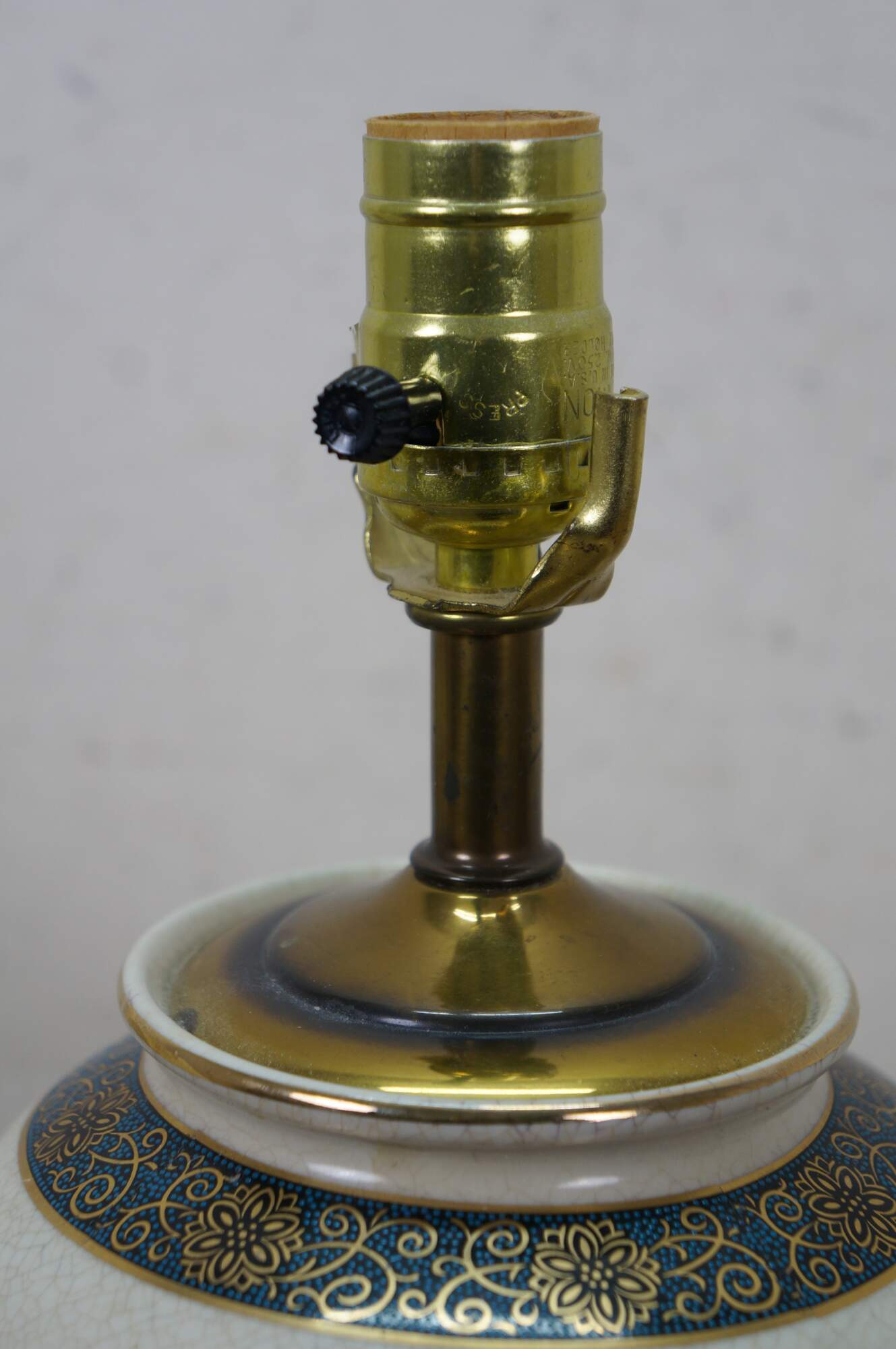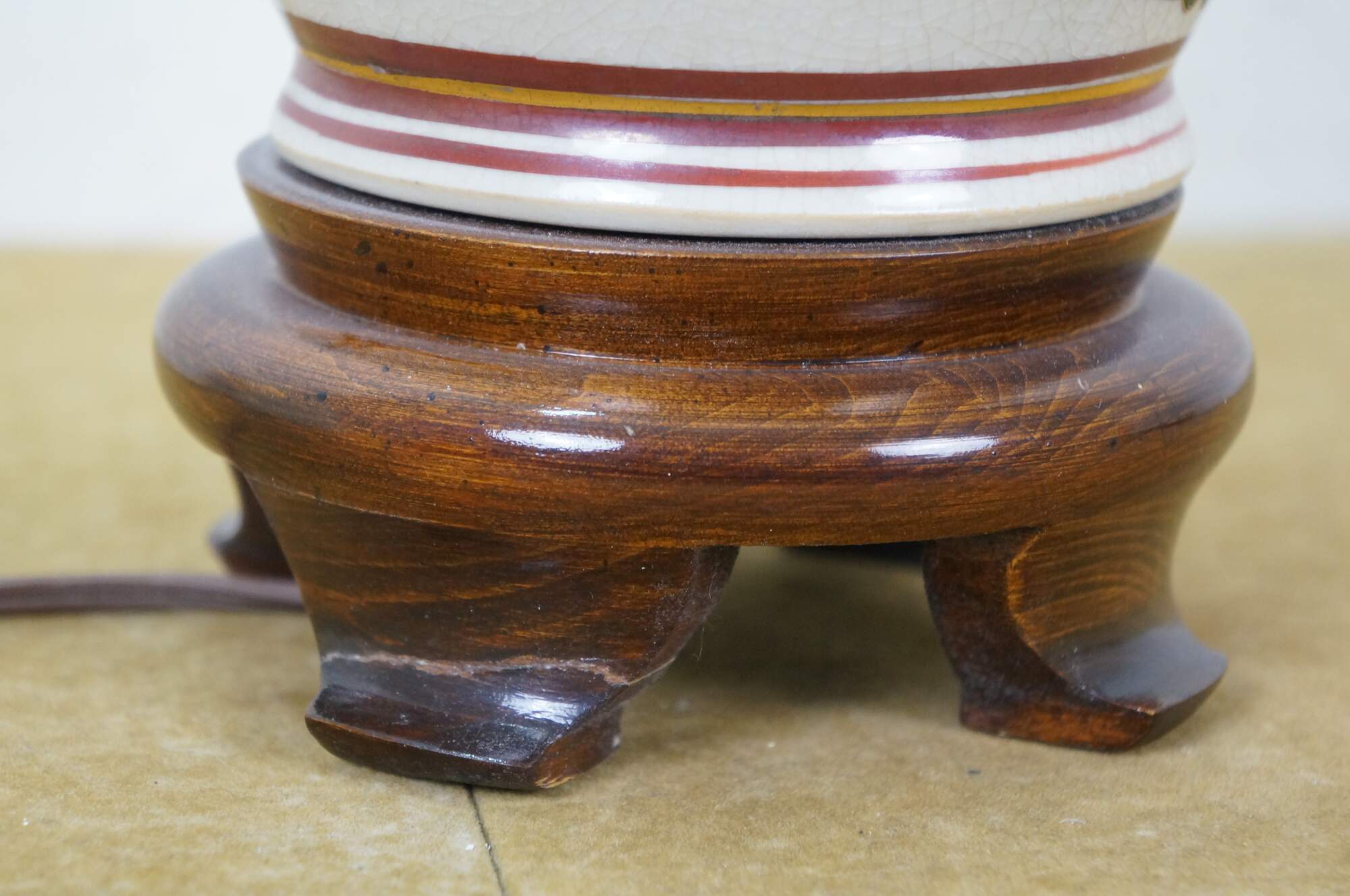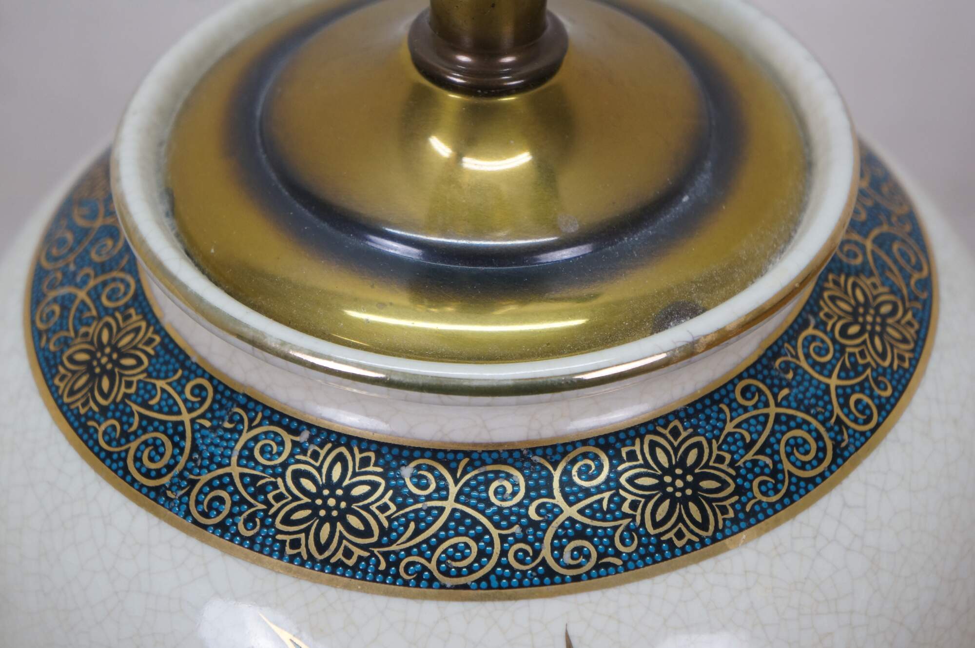 Late 20th century porcelain ginger jar / vase shaped table lamp, painted with a design of multi-colored irises and birds. Footed wood base. Includes harp, brass orb finial, and white fabric shade.