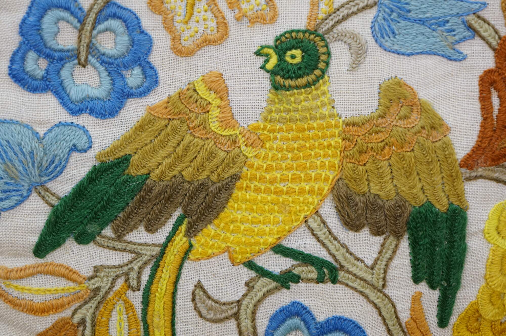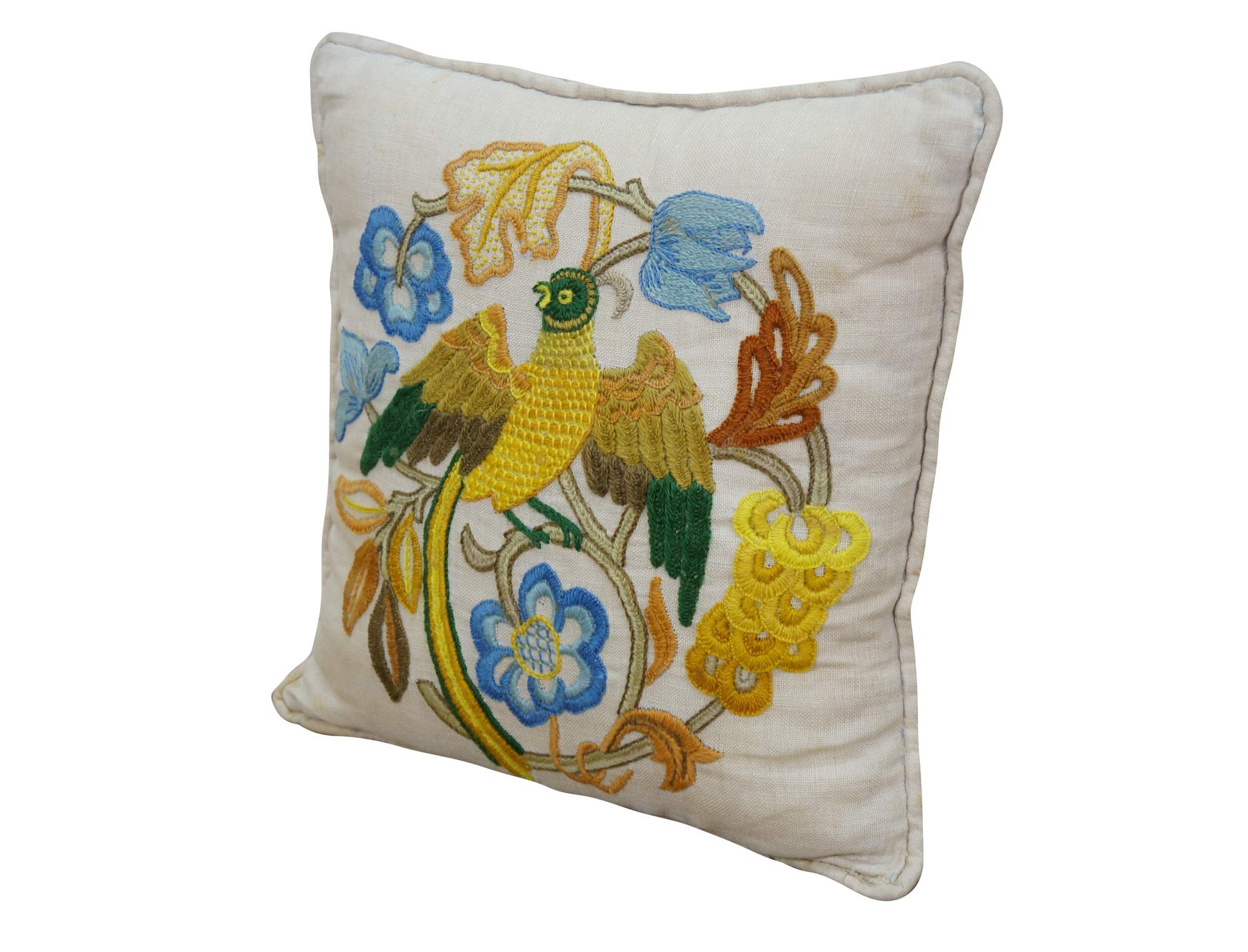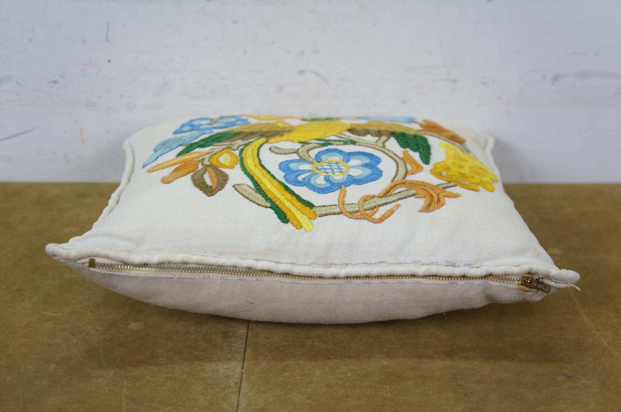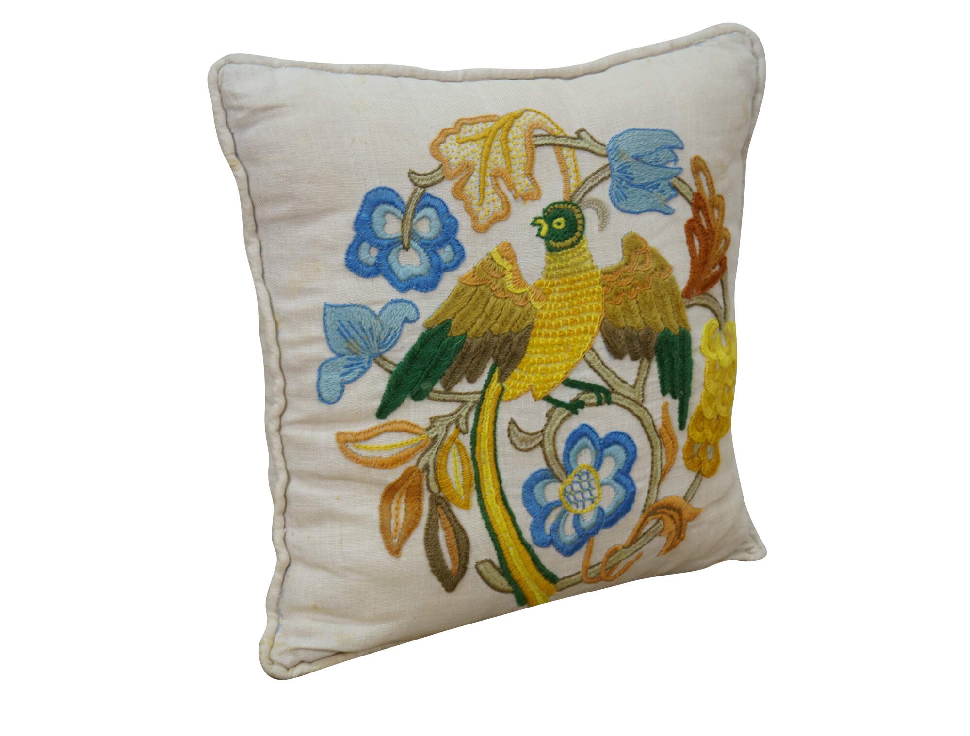 1970's crewel embroidery, folk art / Jacobean style throw pillow featuring an elegant yellow and green bird perched on flowering branches. Crafted from the Columbia-Minerva Creative Crewel kit number 7130 titled Fabled Bird, designed by Erica Wilson, 1971. Wood on white linen with piping around edge. Zipper closure. Fiber fill.