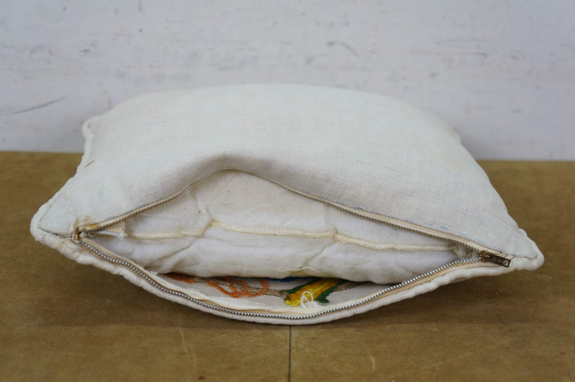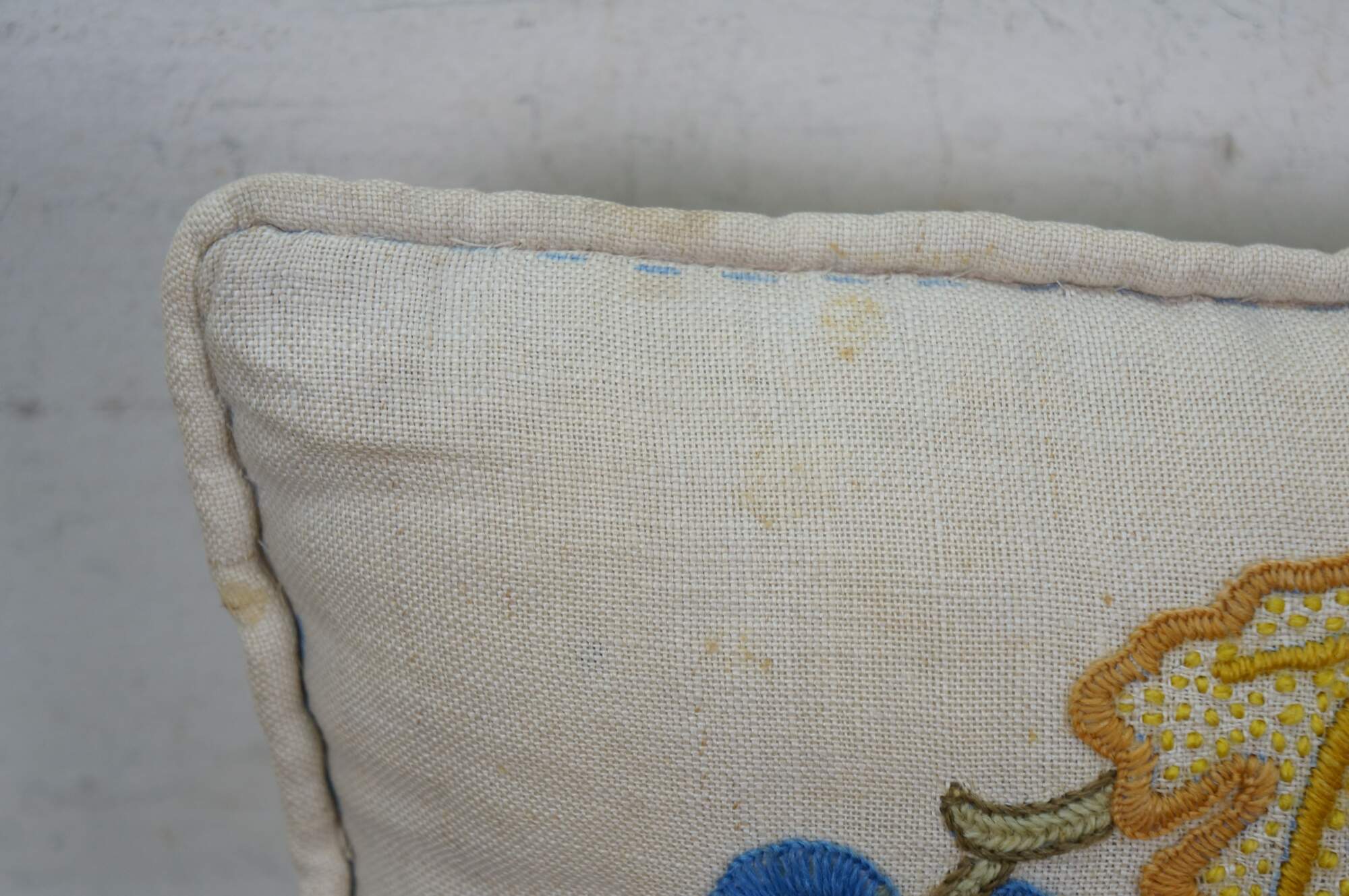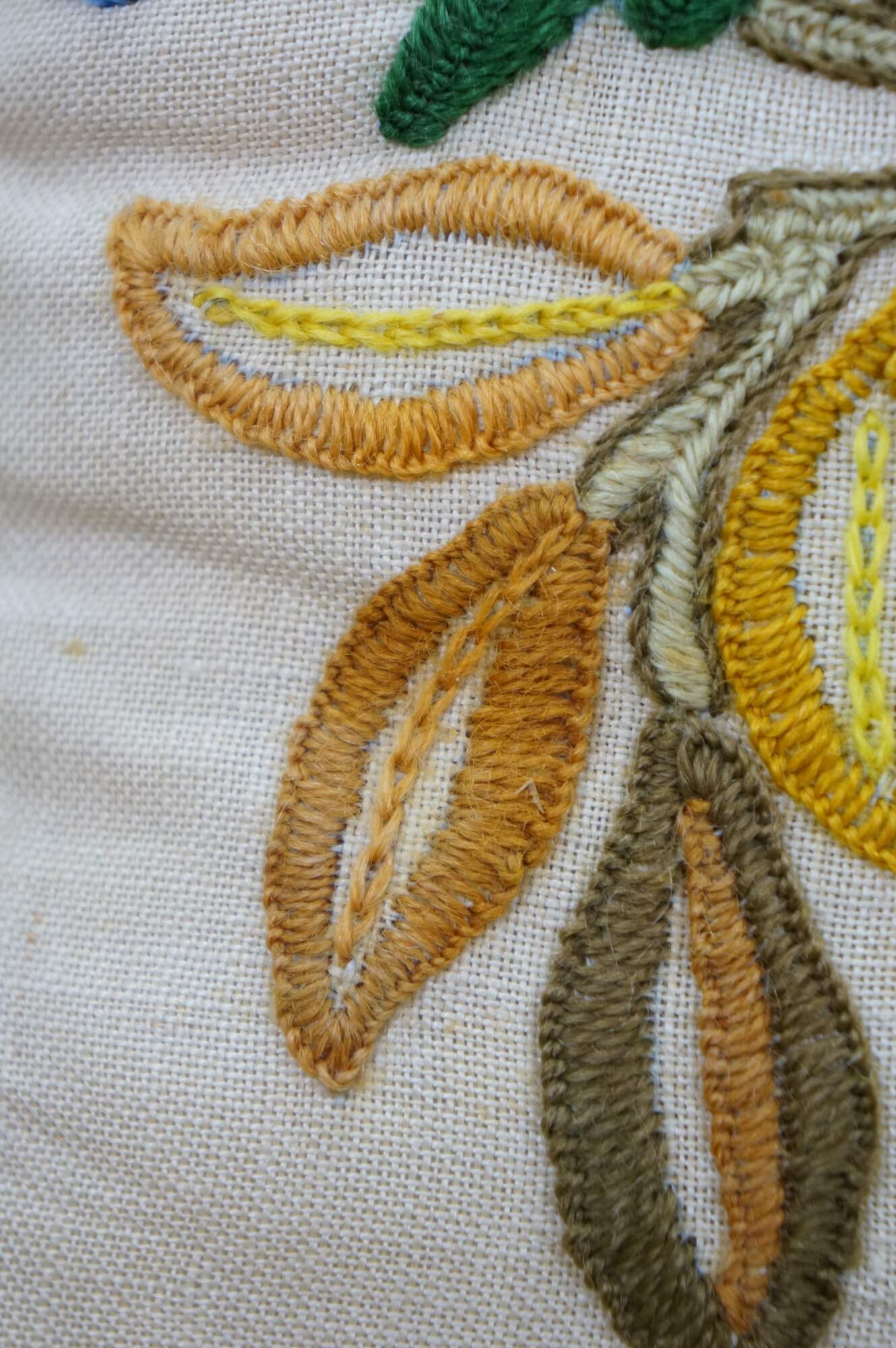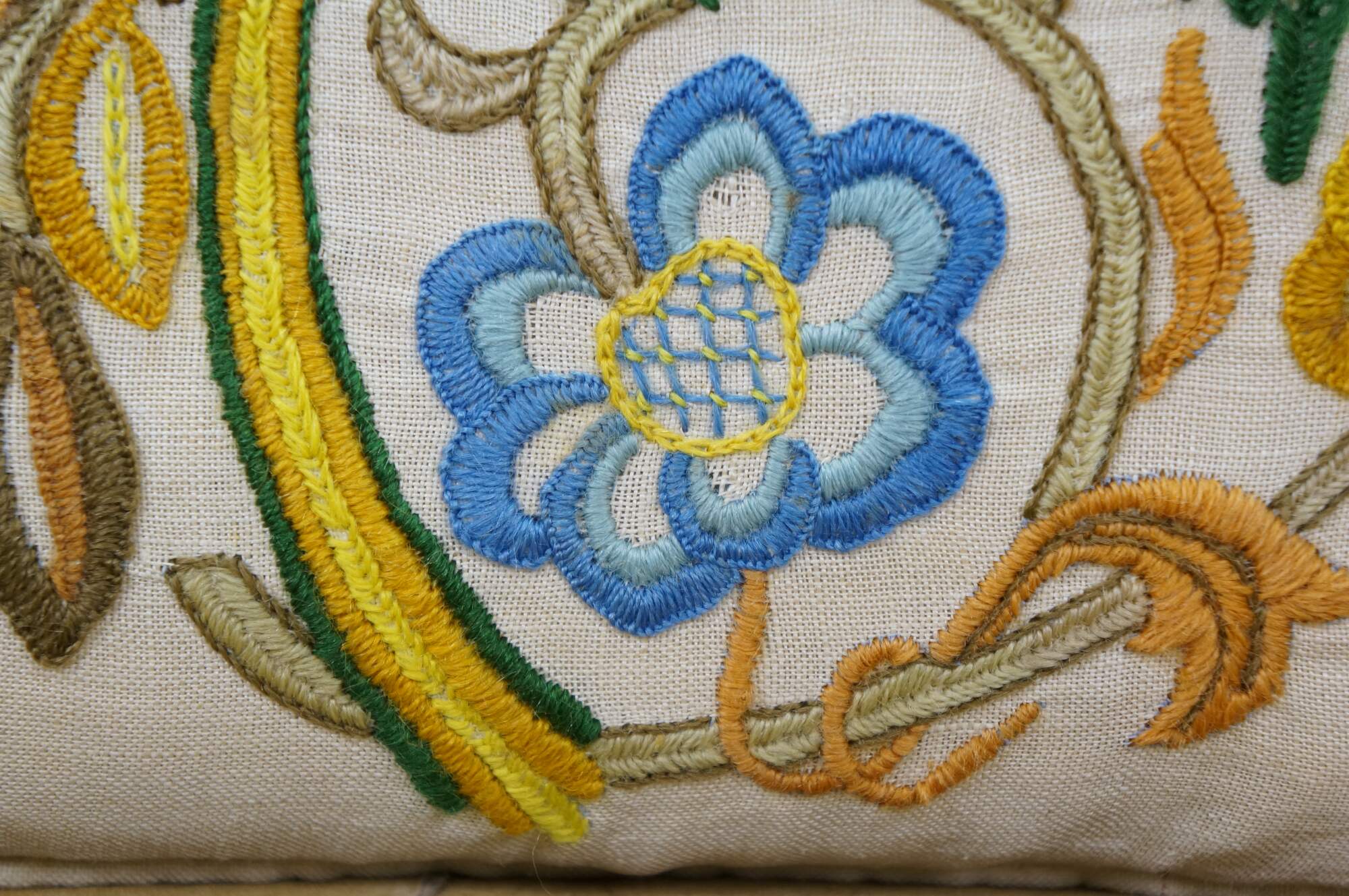 1970's crewel embroidery, folk art / Jacobean style throw pillow featuring an elegant yellow and green bird perched on flowering branches. Crafted from the Columbia-Minerva Creative Crewel kit number 7130 titled Fabled Bird, designed by Erica Wilson, 1971. Wood on white linen with piping around edge. Zipper closure. Fiber fill.