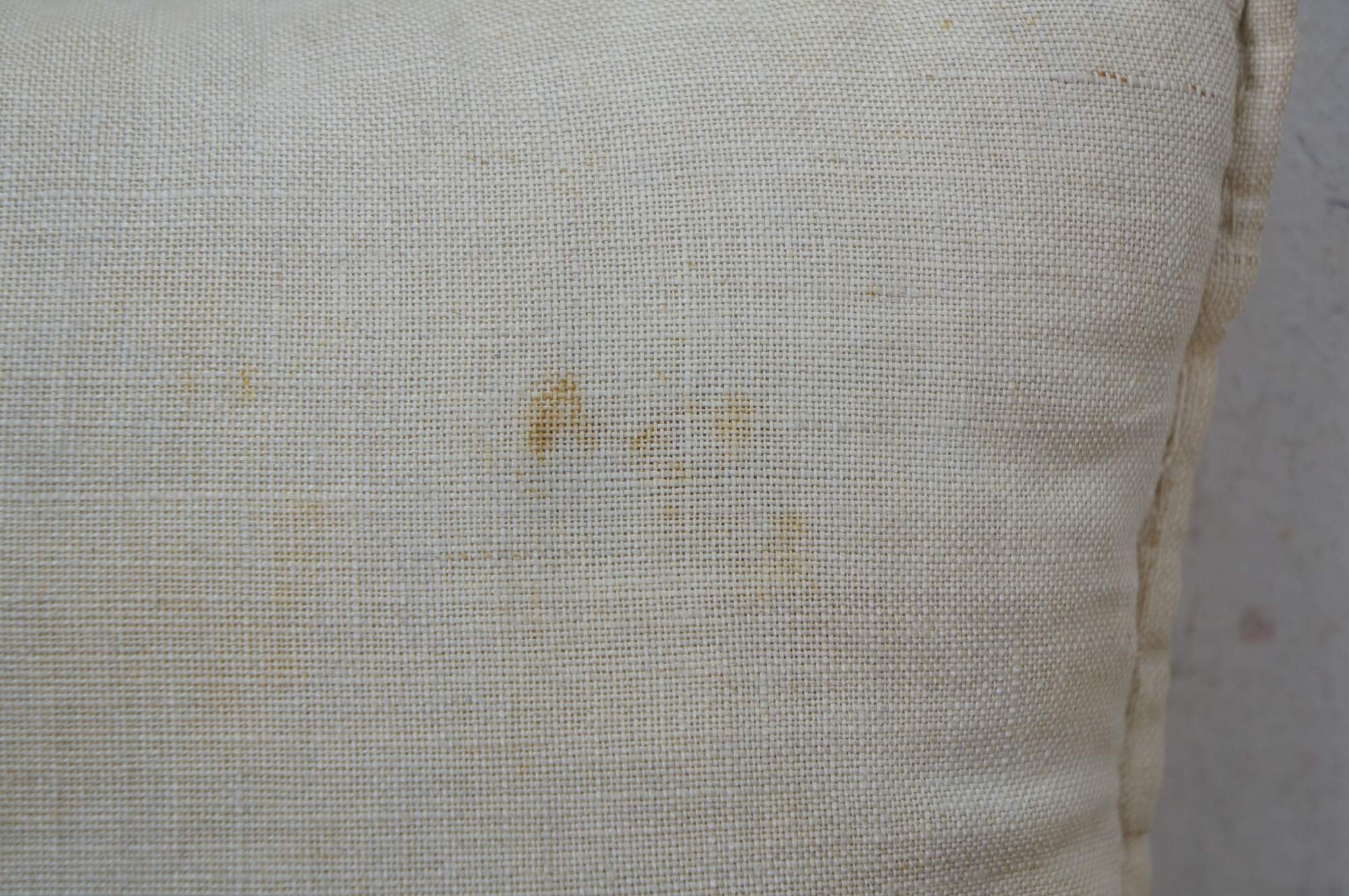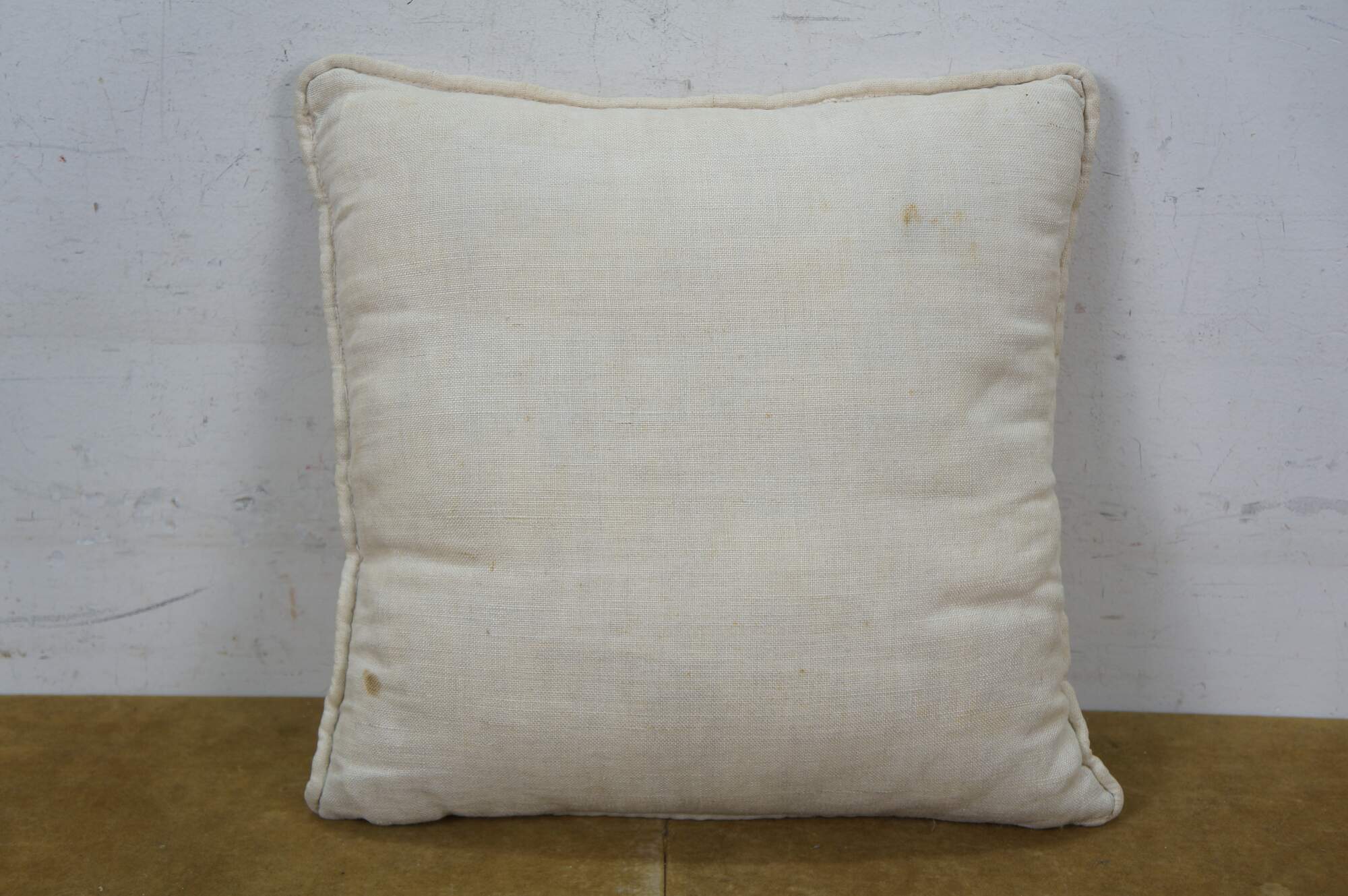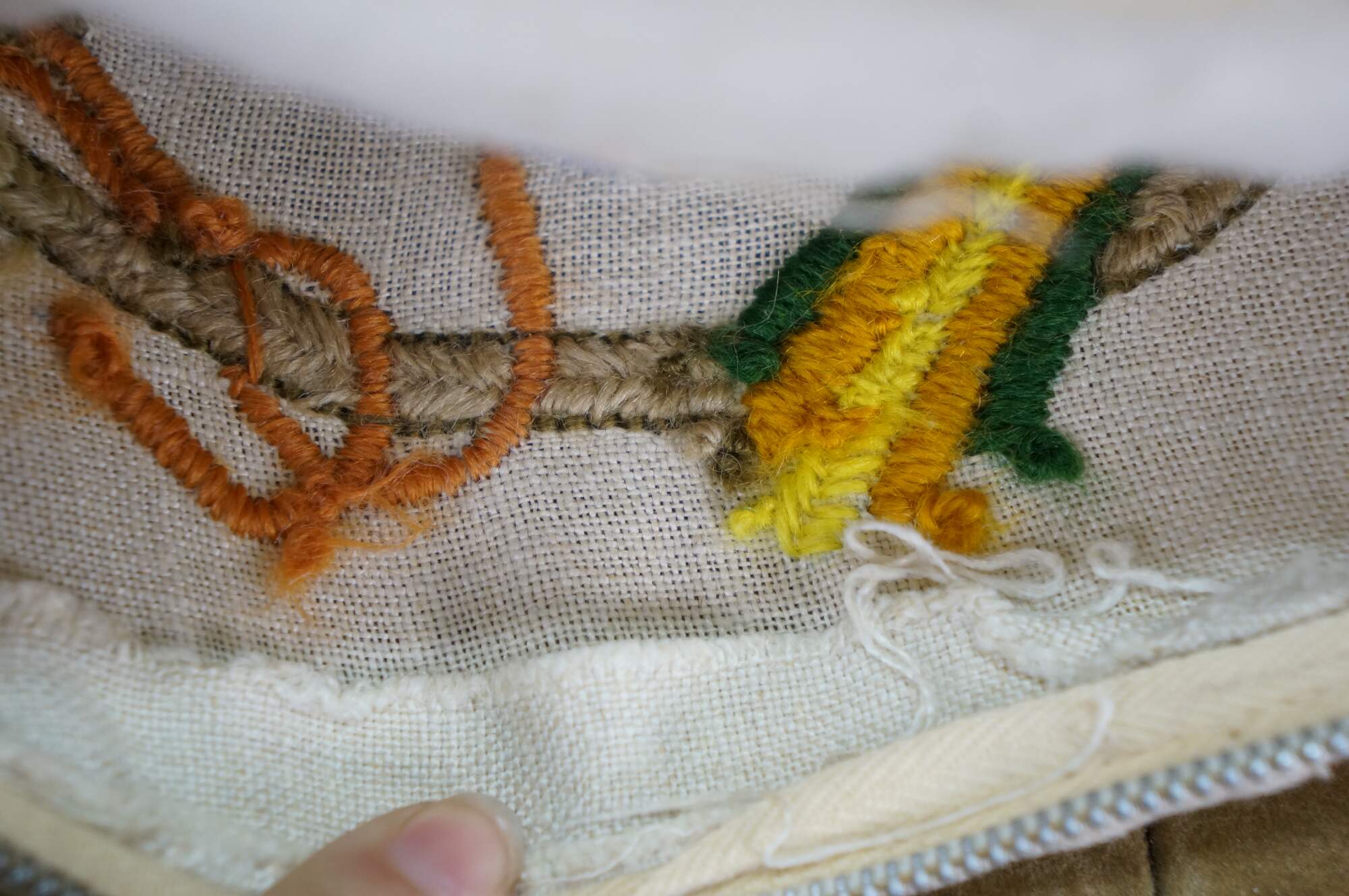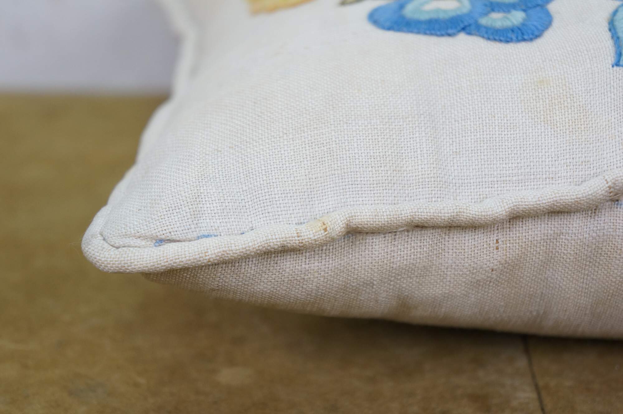 1970's crewel embroidery, folk art / Jacobean style throw pillow featuring an elegant yellow and green bird perched on flowering branches. Crafted from the Columbia-Minerva Creative Crewel kit number 7130 titled Fabled Bird, designed by Erica Wilson, 1971. Wood on white linen with piping around edge. Zipper closure. Fiber fill.