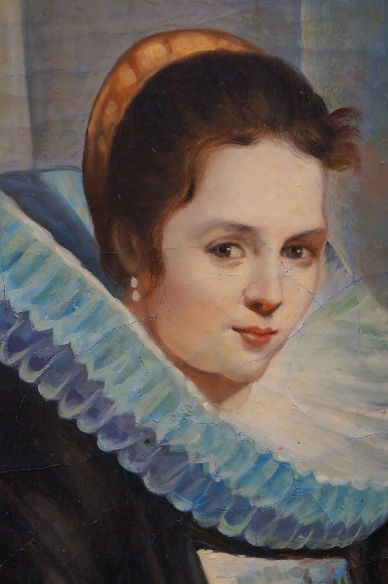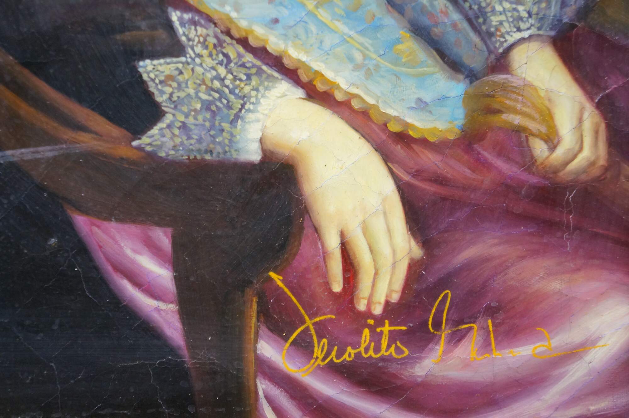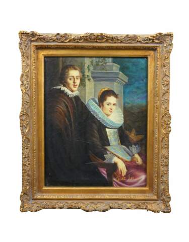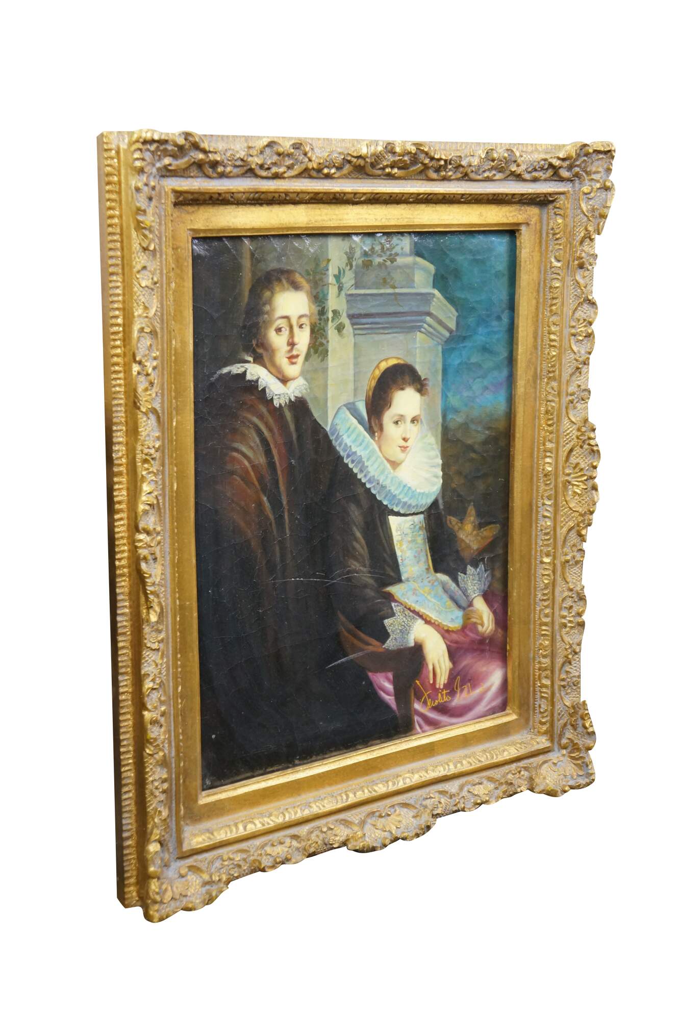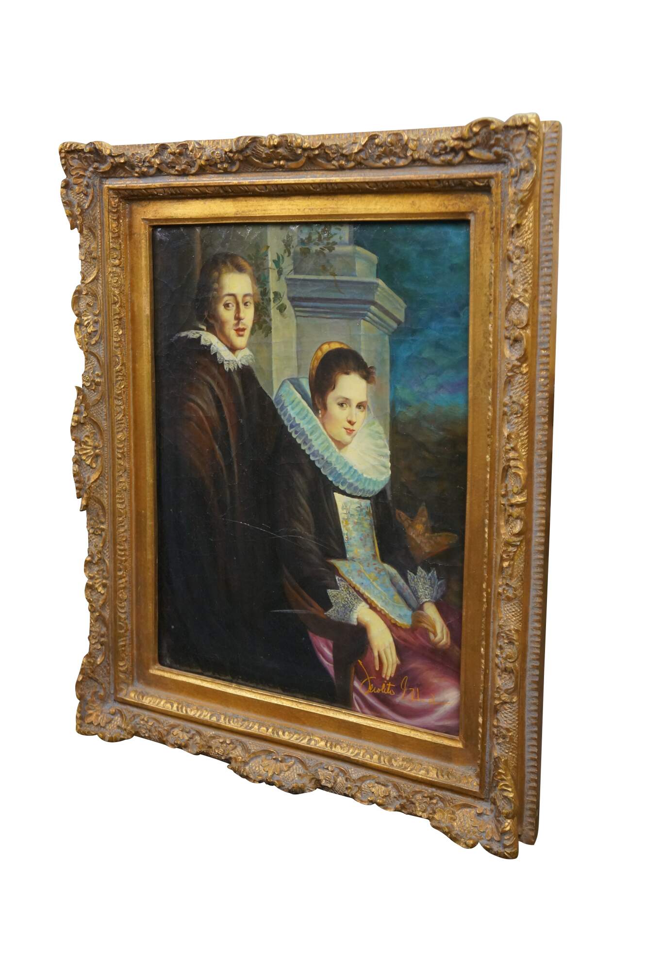 Late 20th century oil on linen painting after "Portrait of a Young Married Couple" by Jacob Jordaens, originally painted circa 1621-22. Likely painted to celebrate the marriage of the young couple depicted, the man in black with lace collar, standing behind his seated whif in black jacket with embroidered stomacher, pink /red skirt, lace cuffs, gold cap, and large ruff. Signed, lower right. Gilt composite frame molded with floral and foliate designs.
