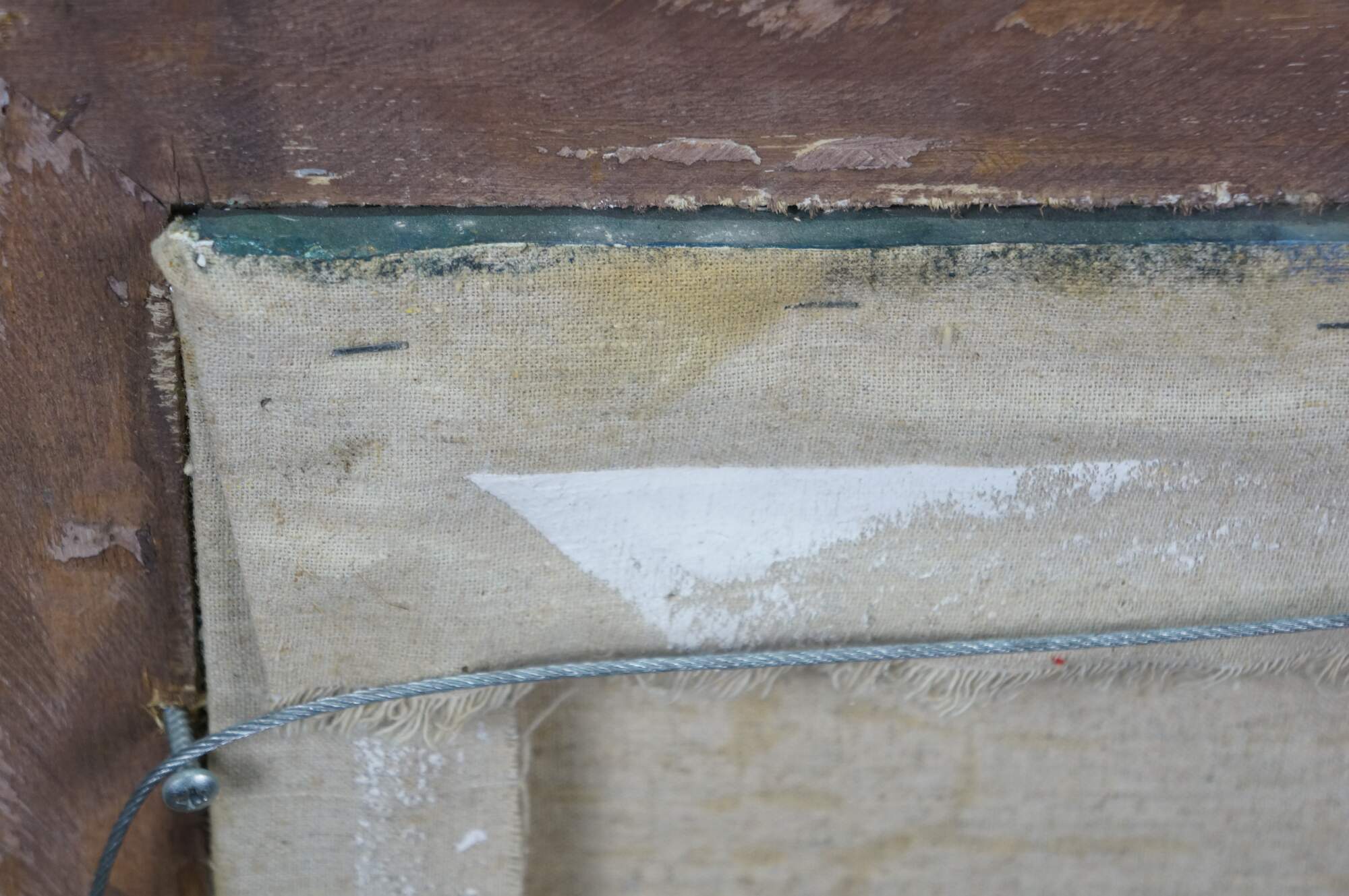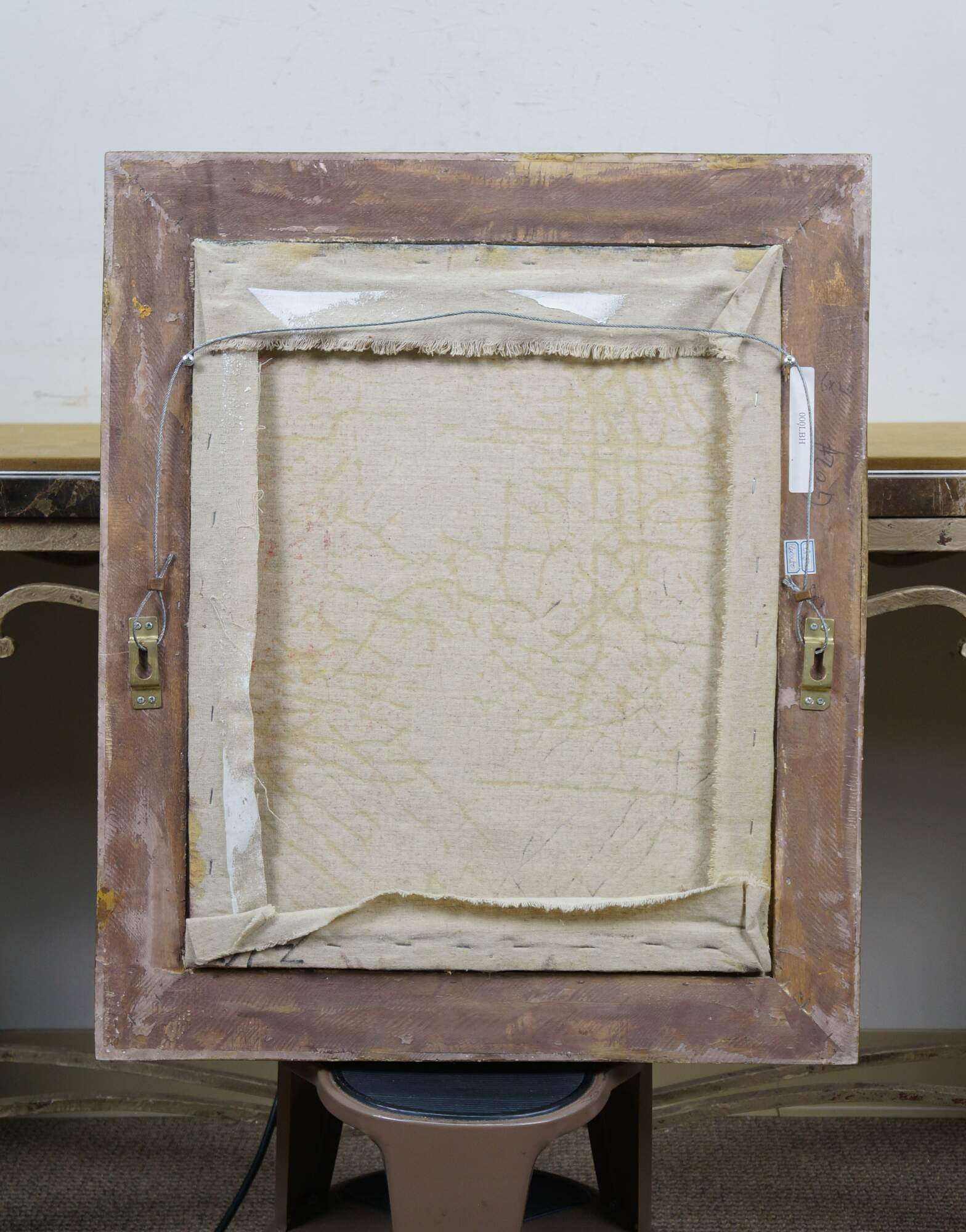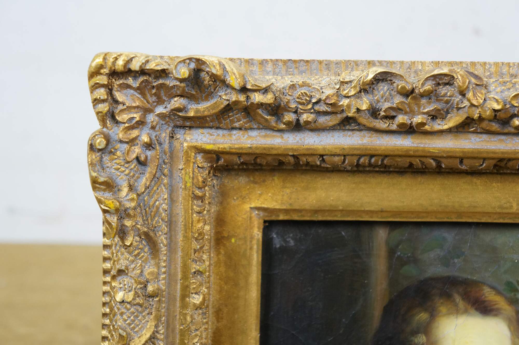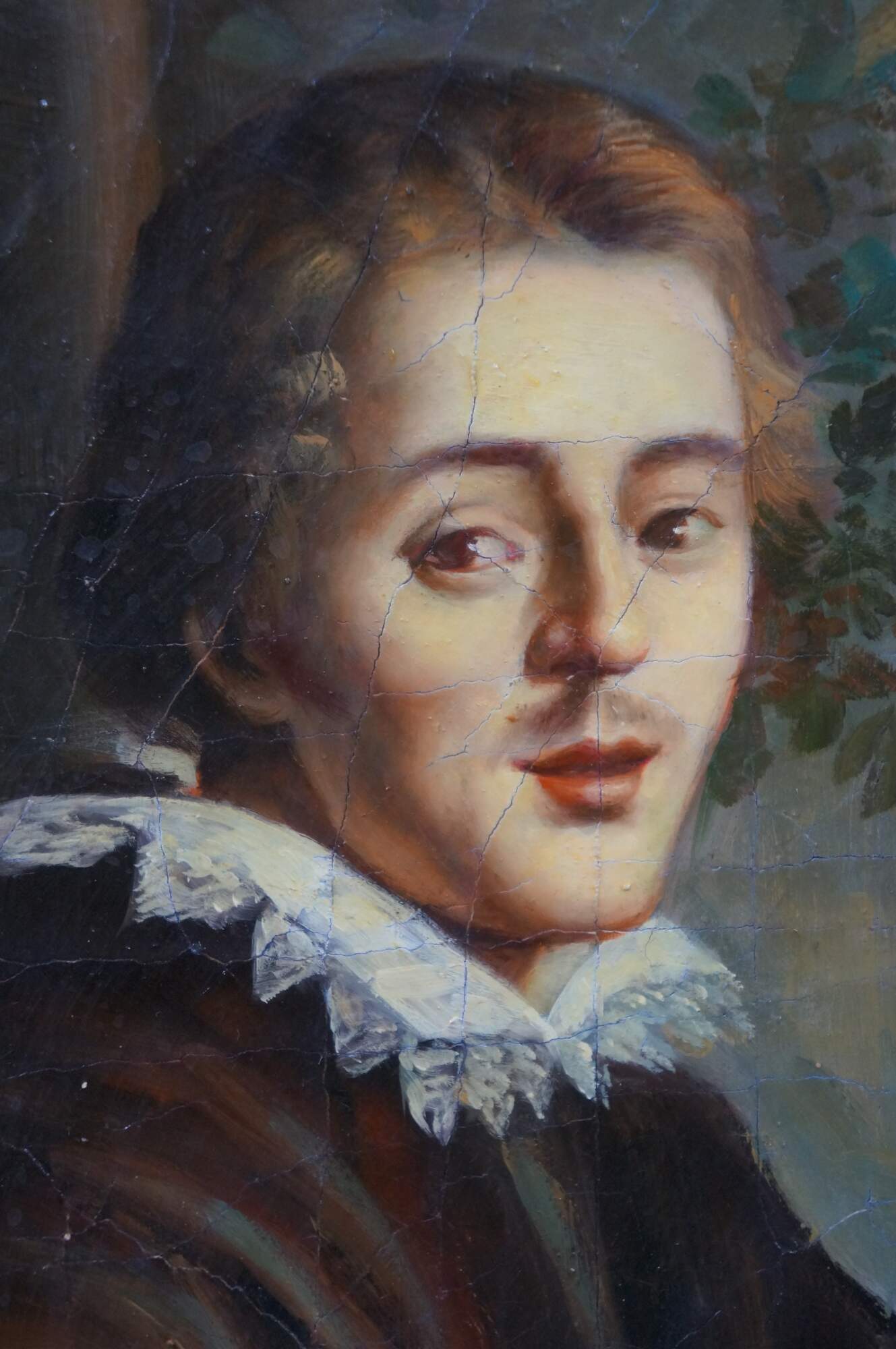 Late 20th century oil on linen painting after "Portrait of a Young Married Couple" by Jacob Jordaens, originally painted circa 1621-22. Likely painted to celebrate the marriage of the young couple depicted, the man in black with lace collar, standing behind his seated whif in black jacket with embroidered stomacher, pink /red skirt, lace cuffs, gold cap, and large ruff. Signed, lower right. Gilt composite frame molded with floral and foliate designs.