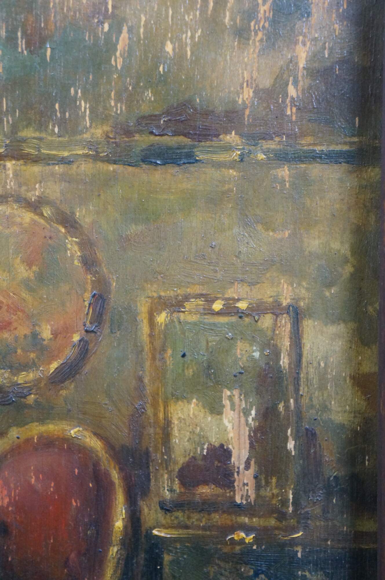 Wear from age, paint loss, fading, chipping to frame, original painting cut out and board used as a backing, which is now visible. not sure if it was intended to conceal this piece, or if it was used as a backing, or if someone just framed it this way.