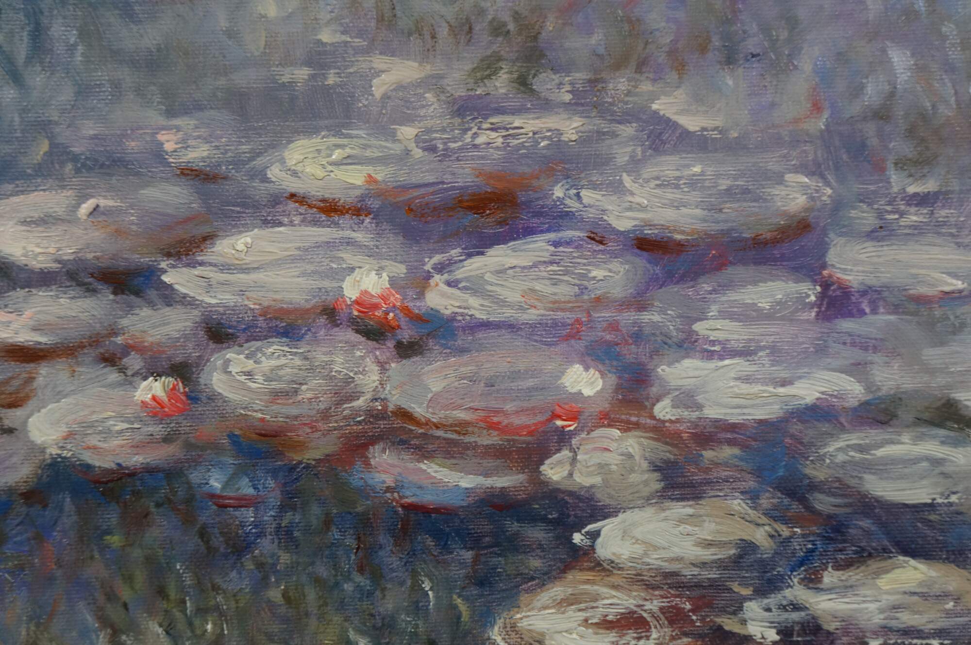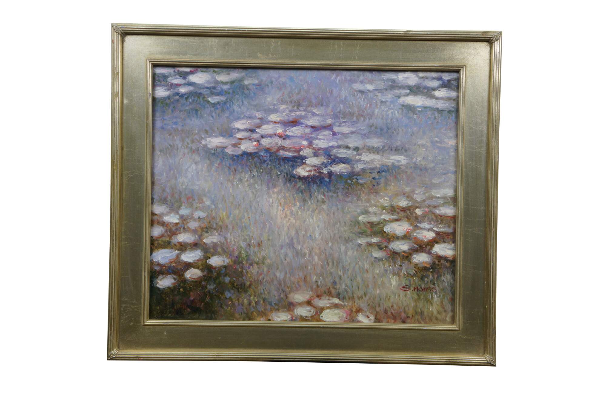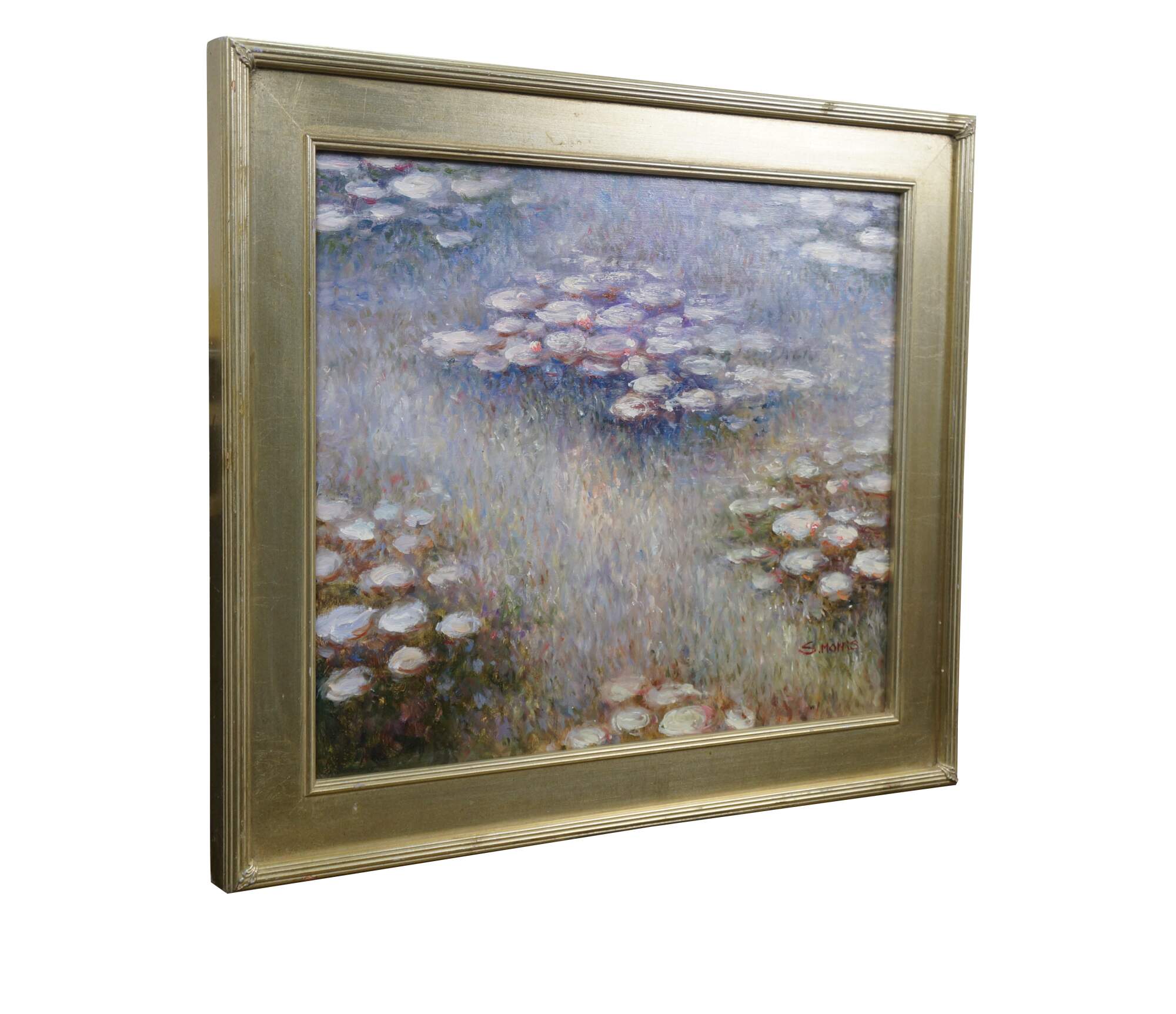 Late 20th century oil on canvas impressionist style painting after one of Claude Monet's many depictions of Water Lilies. Depicts clusters of lily pads in shades of violet, green, and blue. Signed S. Morris, lower right. Gilt composite frame.