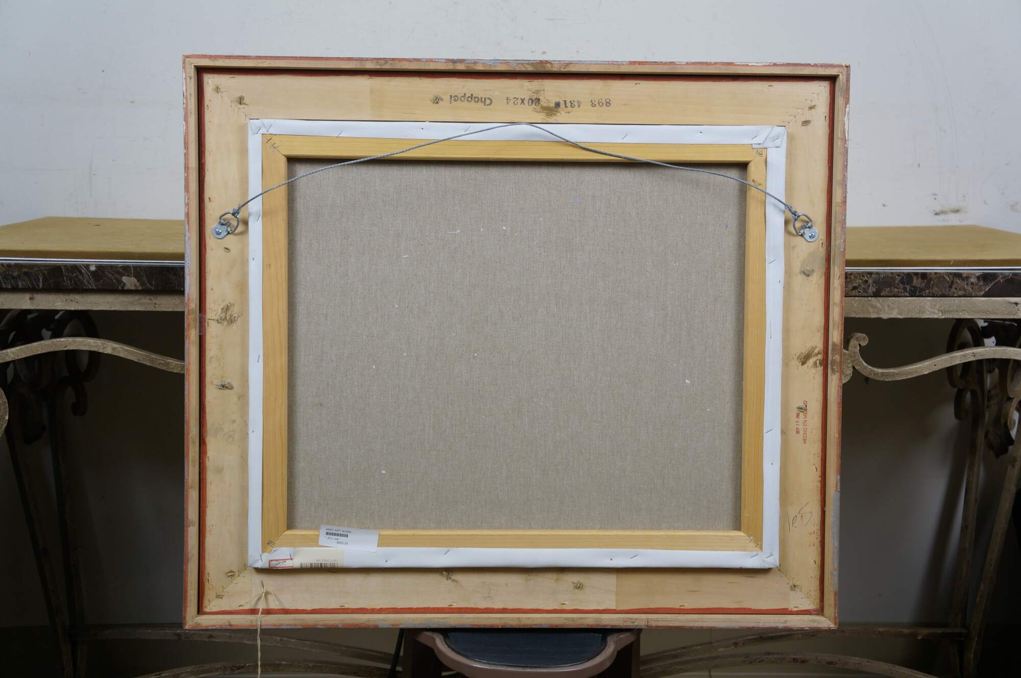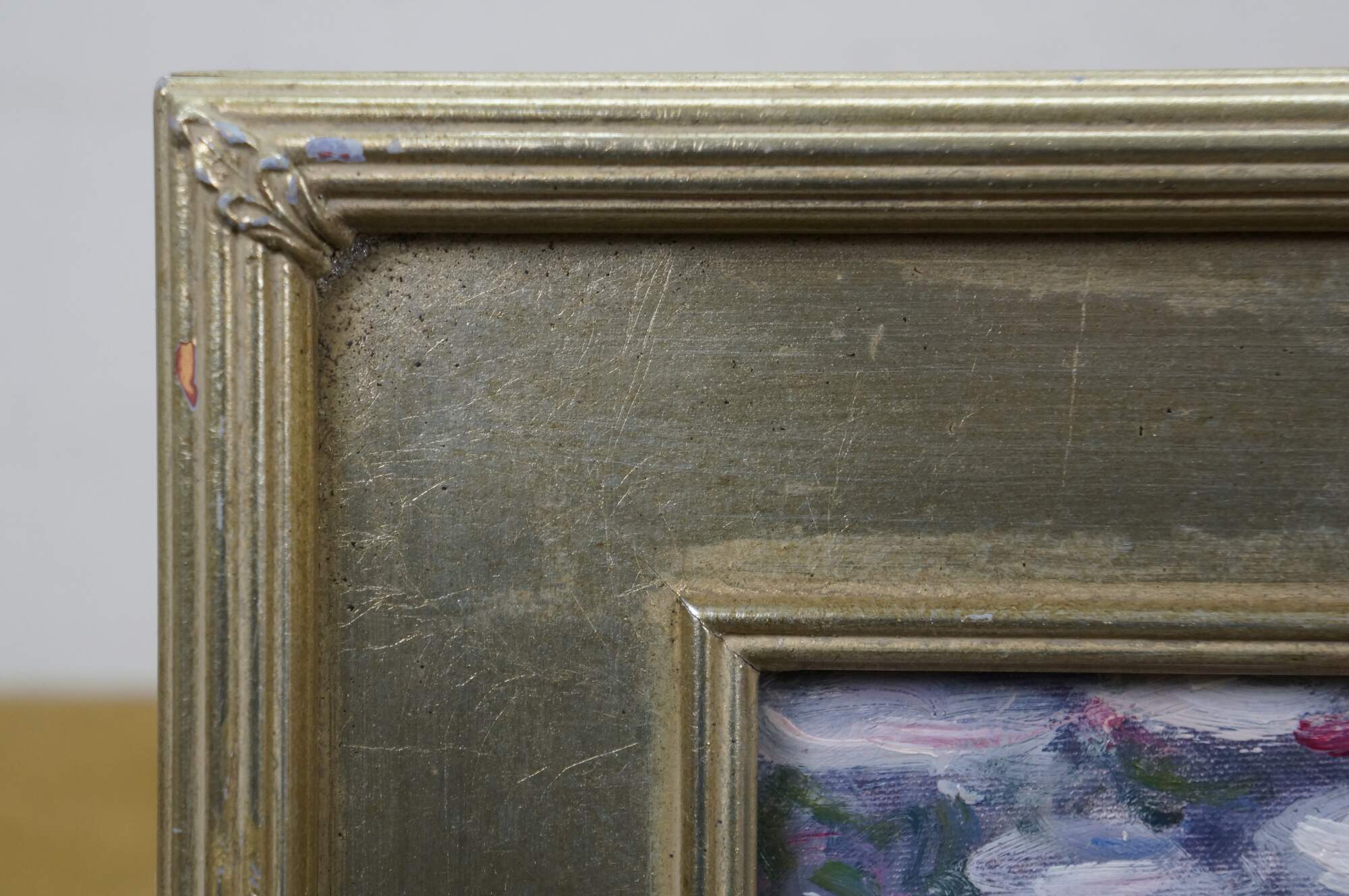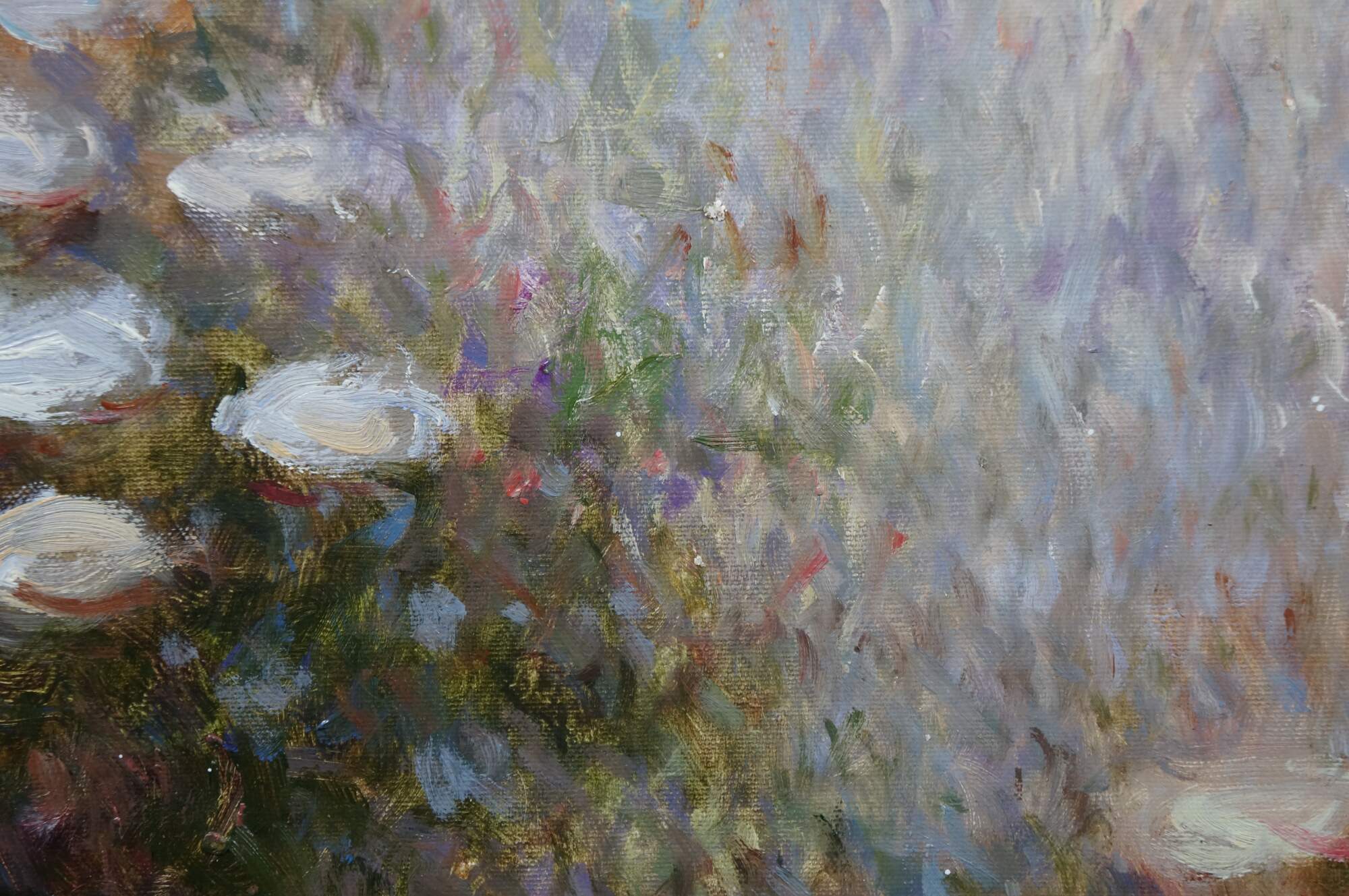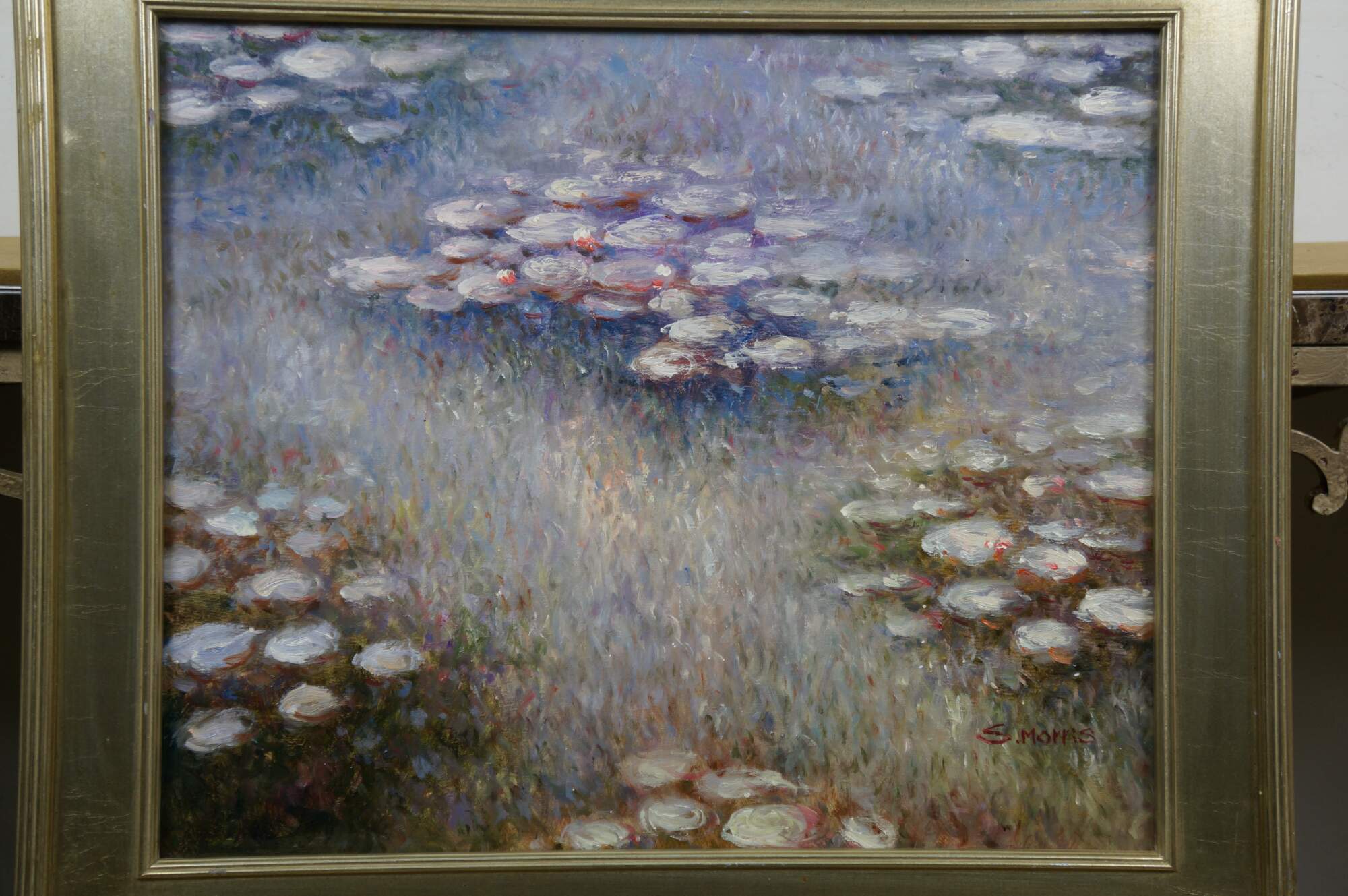 Late 20th century oil on canvas impressionist style painting after one of Claude Monet's many depictions of Water Lilies. Depicts clusters of lily pads in shades of violet, green, and blue. Signed S. Morris, lower right. Gilt composite frame.