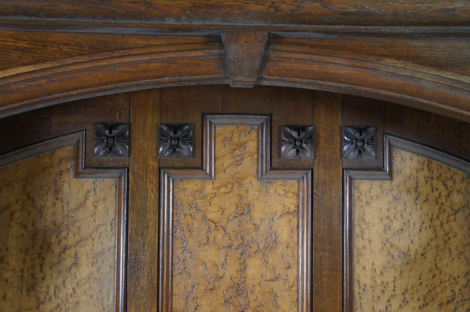 Large antique late 19th English Victorian reclaimed oak hutch. Features an arcaded front with partial turned and carved columns set around birdseye maple back panelling and 'C' scrolled spandrels along the top. Includes two shelves for display.