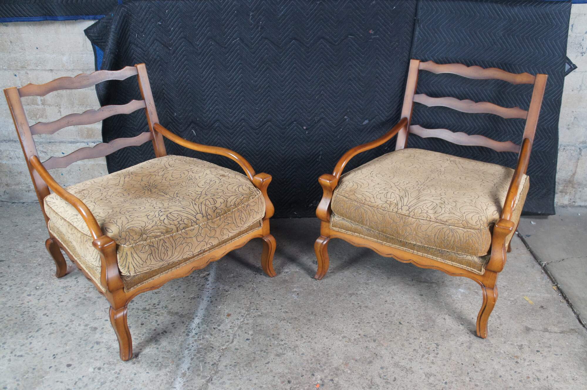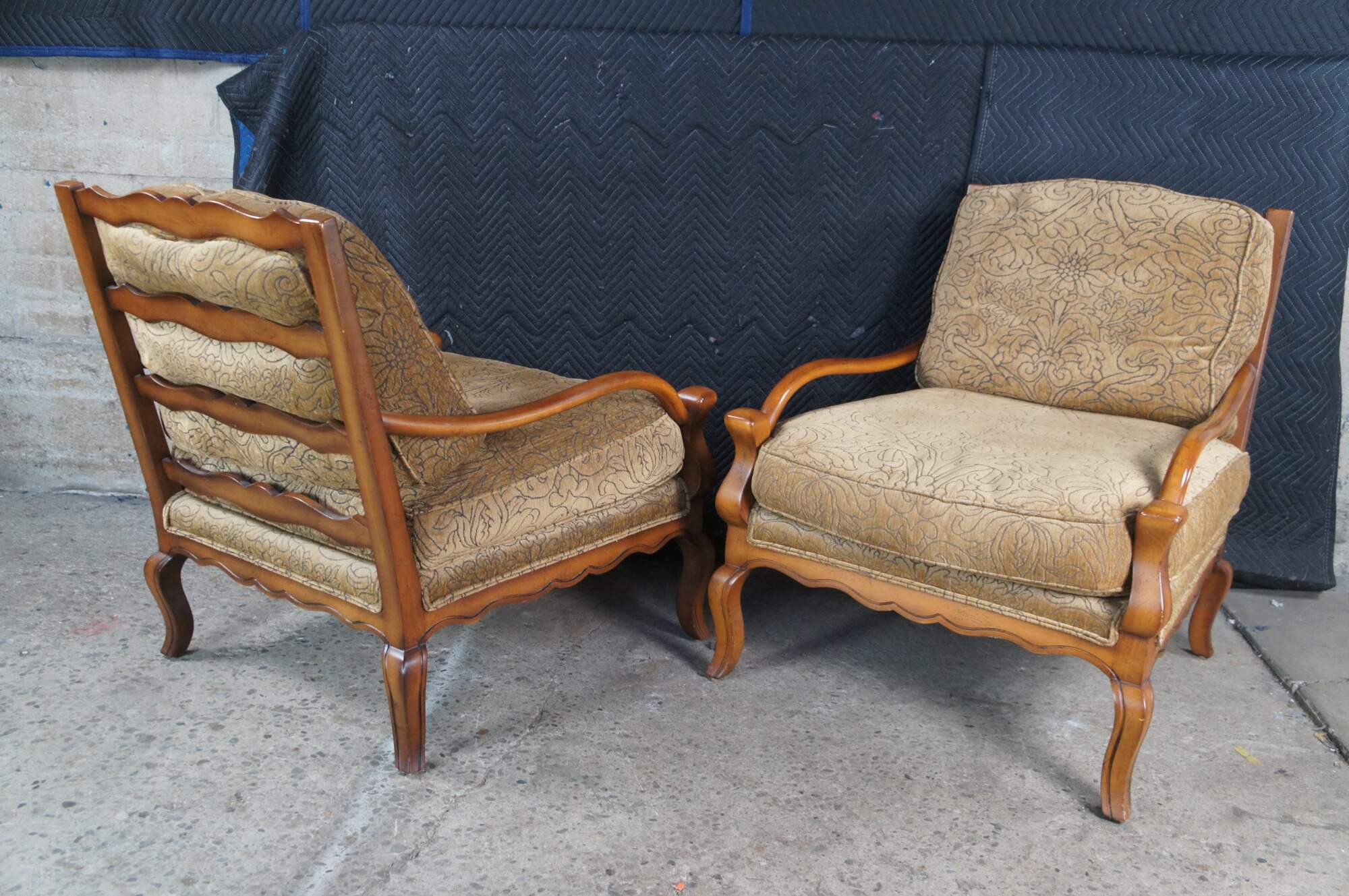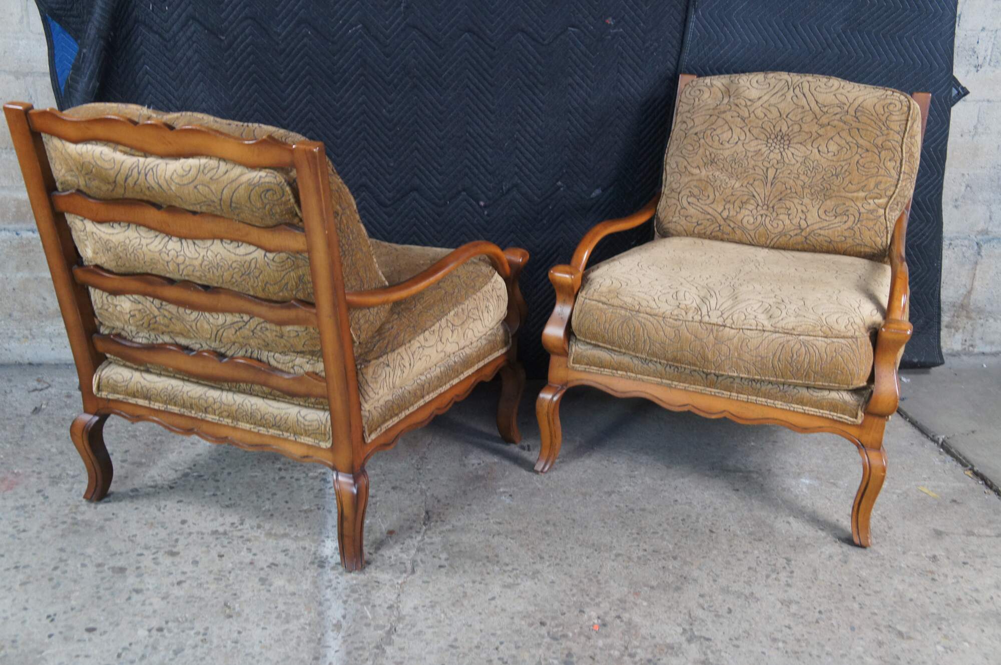 2 Late 20th Century Sherrill Oversized French Provincial Arm Chairs. Features a distressed hardwood frame with smooth sloping arms, ladderback, serpentine apron and cabriole legs. Upholstered in a gold floral brocade style fabric. Cushions are a blend of foam and down fill. A comfy addition to any setting.