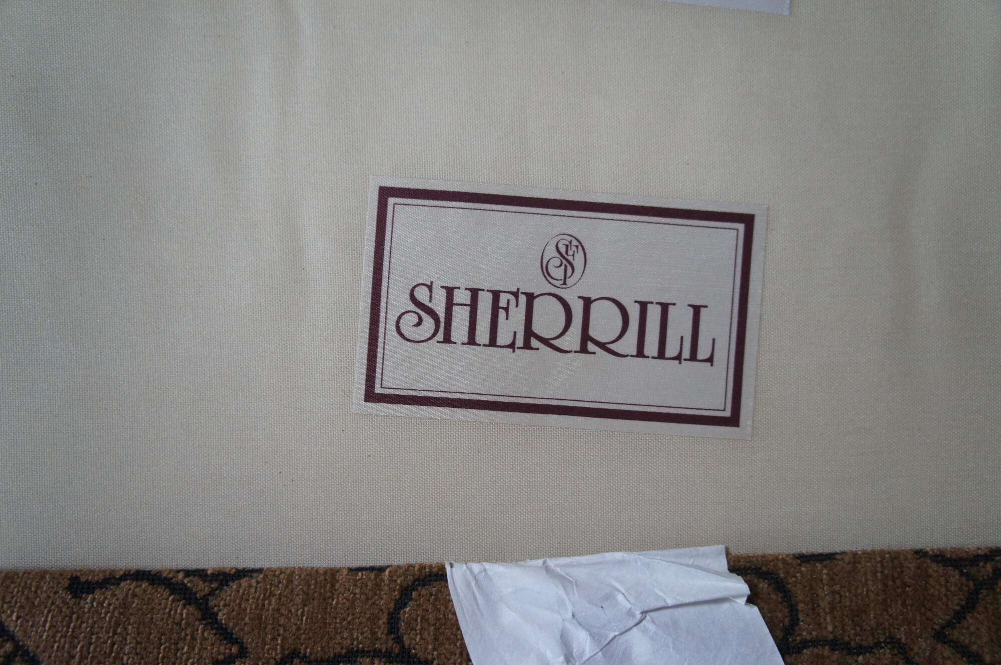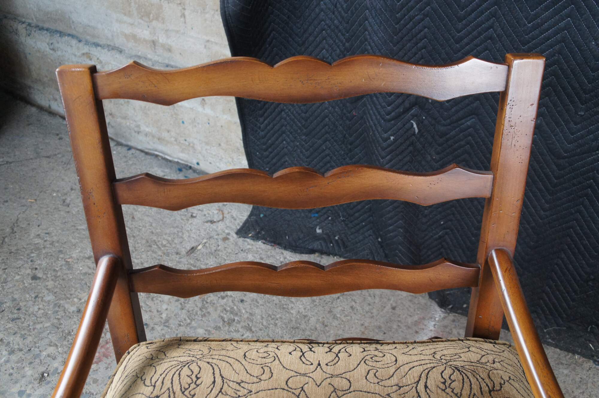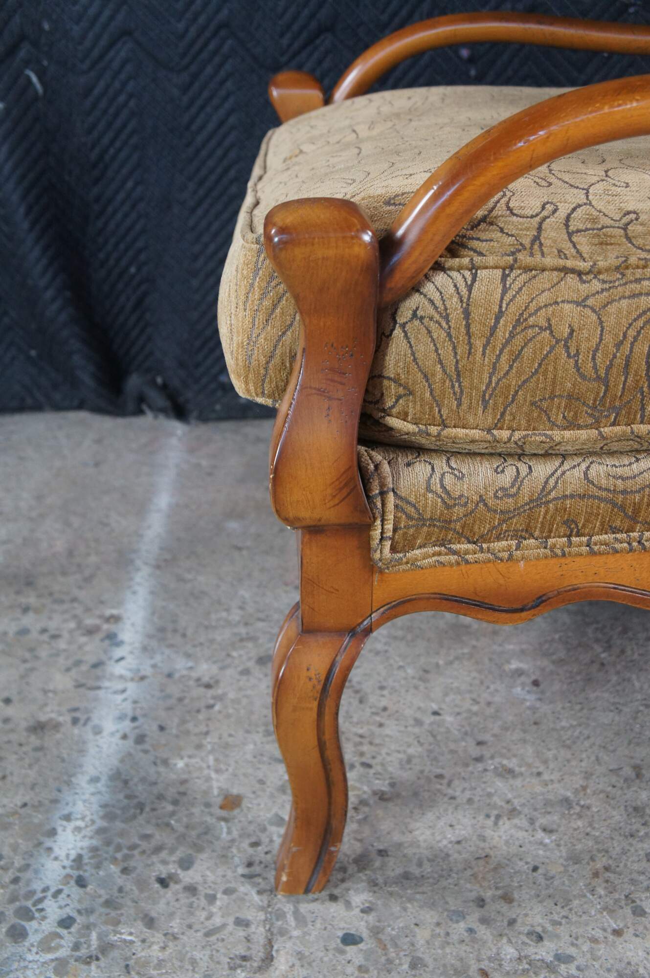 2 Late 20th Century Sherrill Oversized French Provincial Arm Chairs. Features a distressed hardwood frame with smooth sloping arms, ladderback, serpentine apron and cabriole legs. Upholstered in a gold floral brocade style fabric. Cushions are a blend of foam and down fill. A comfy addition to any setting.