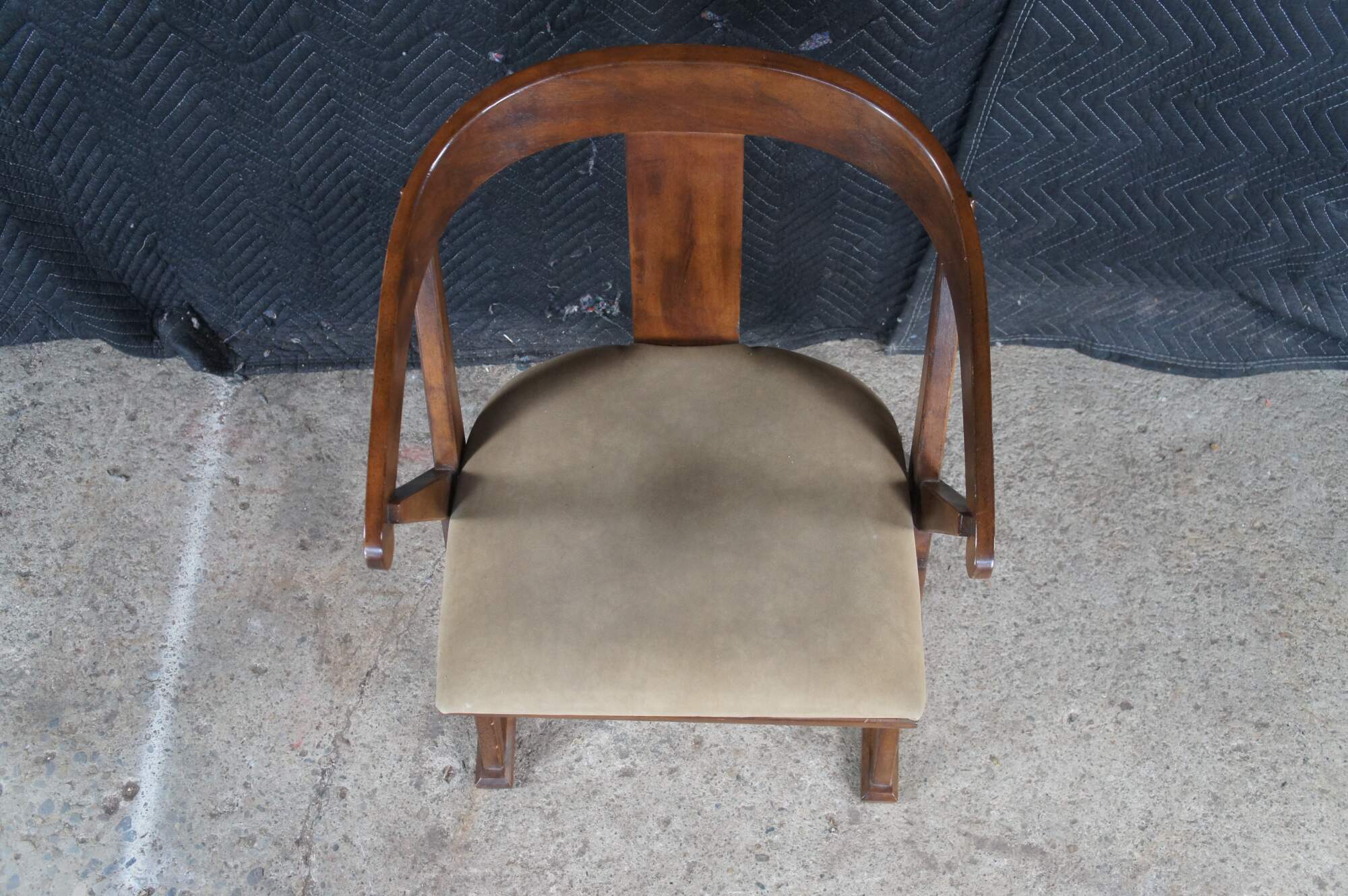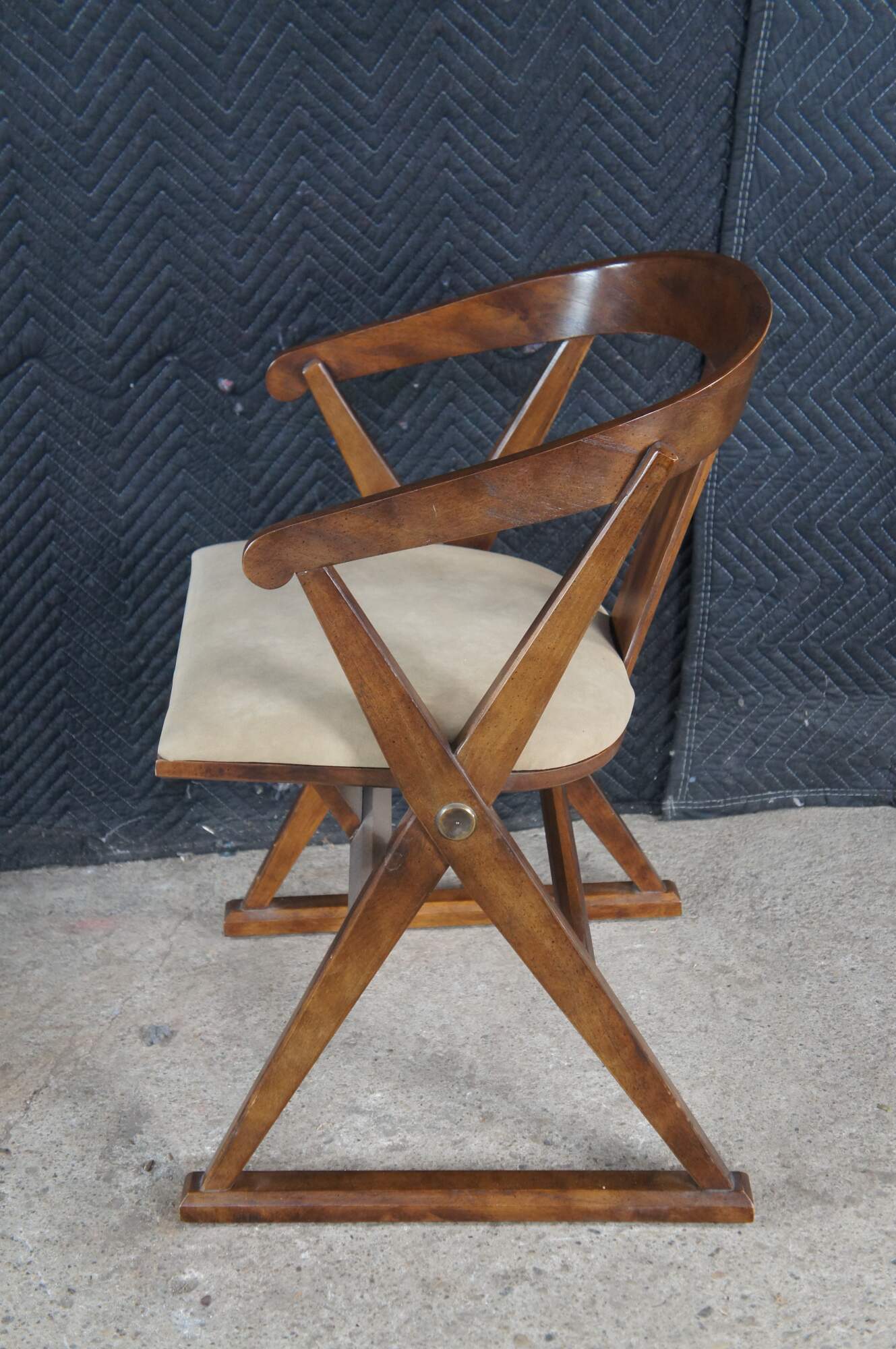 Drexel Heritage Campaign Style Arm Chair, circa 1970s. Features a distressed walnut finish with a curved back and 'x' frame with round brass medallion. Tag along underside.