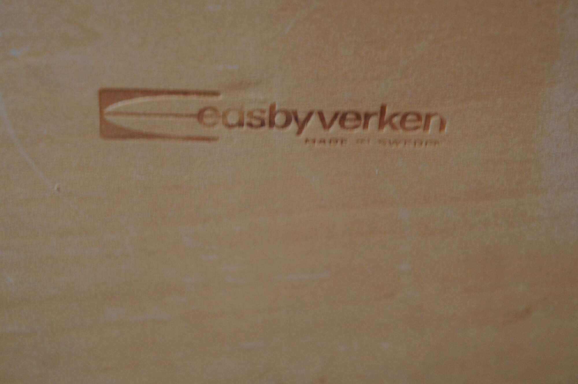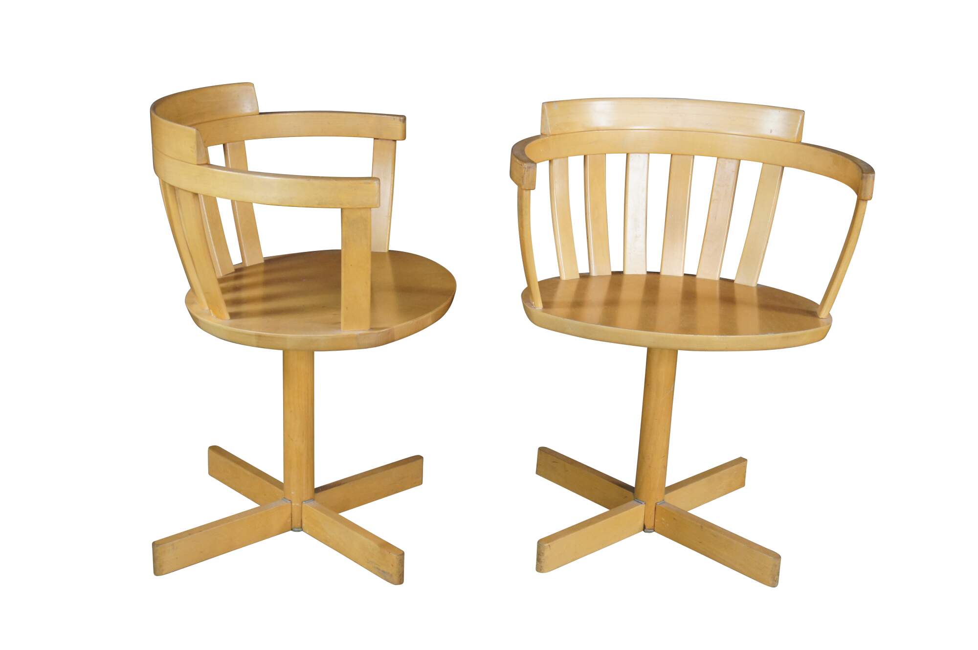 Set of 4 Swedish Modern swivel arm chairs by Sune Fromell & Jan Hallberg for Edsby Verken, circa 1960s. Features a birch frame with a barrel back and vertical slat back over an oval seat. Each chair is supported by a round column leading to an x form base. Marked along underside.
