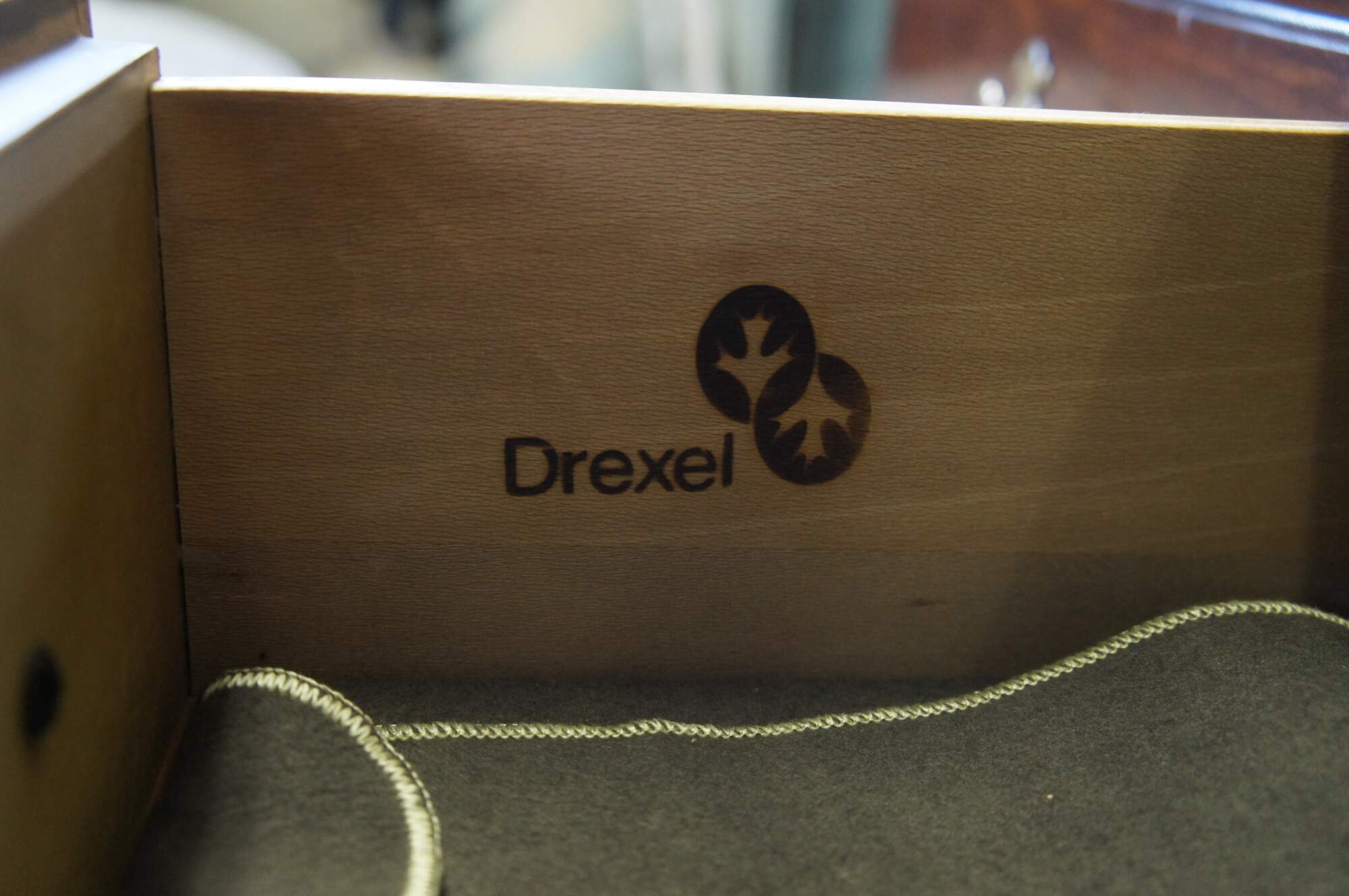 Vintage 1987 Drexel Furniture China cabinet featuring traditional styling with open pediment trophy finial over an illumined showcase, supported by a lower cabinet with large silverware drawer and additional storage.
