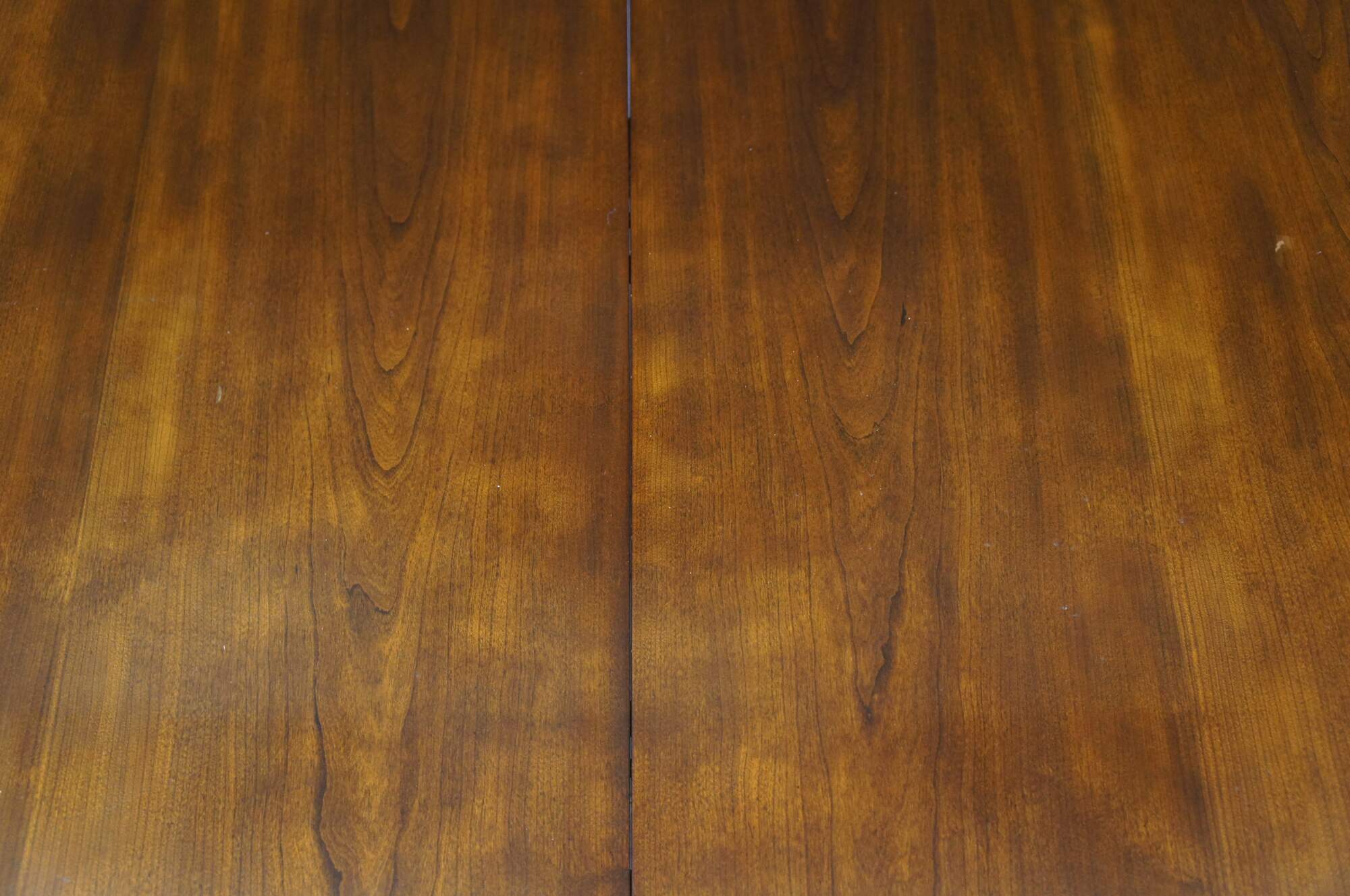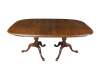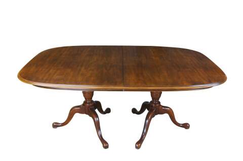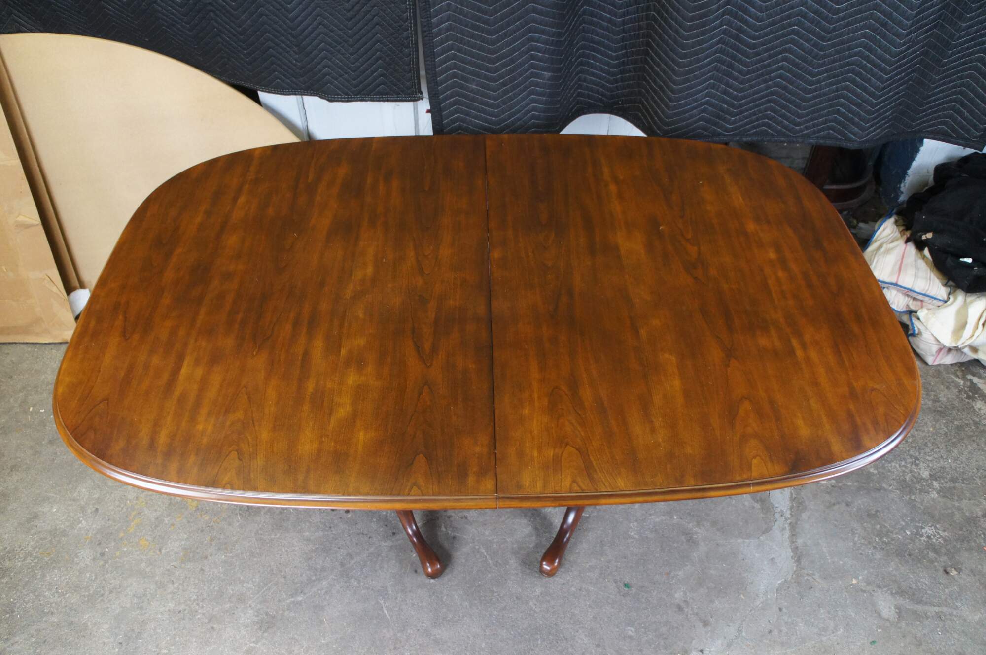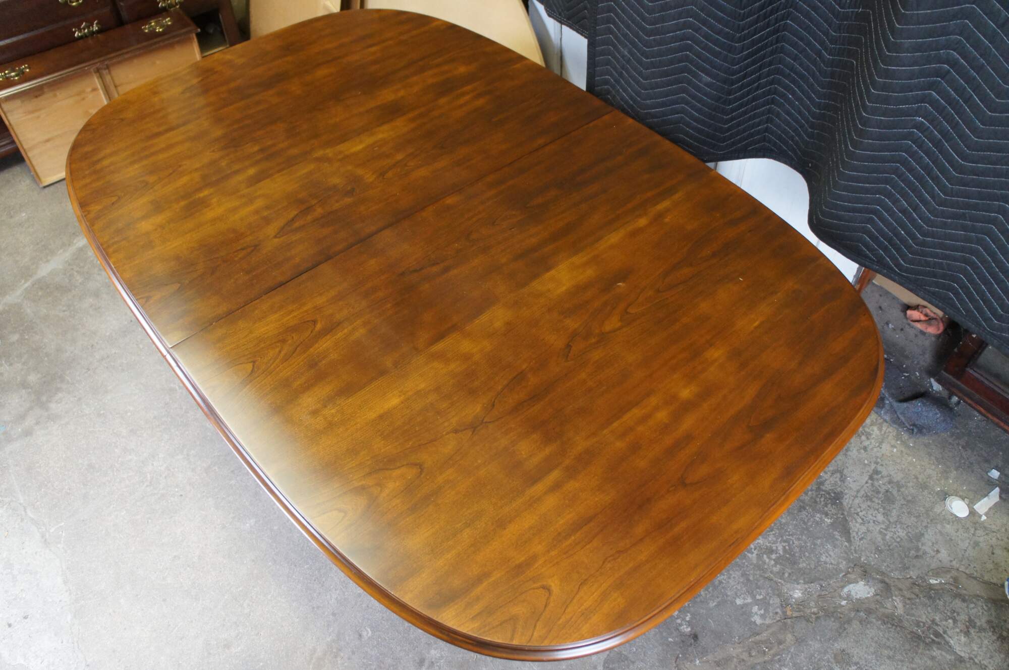 Vintage 1987 Drexel Furniture dining table featuring oval form with two extendable leaves, supported by a double pedestal base with slipper feet.