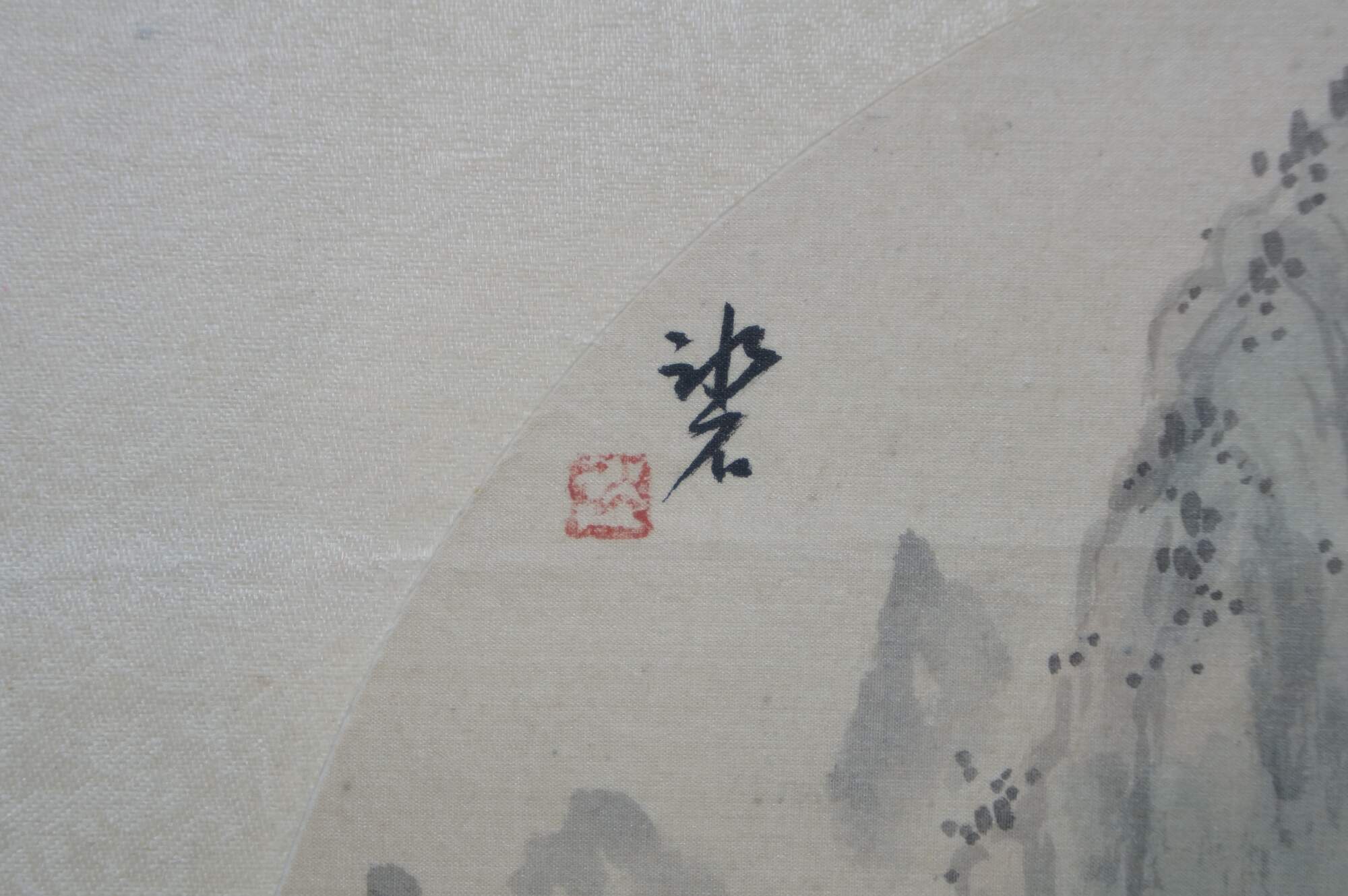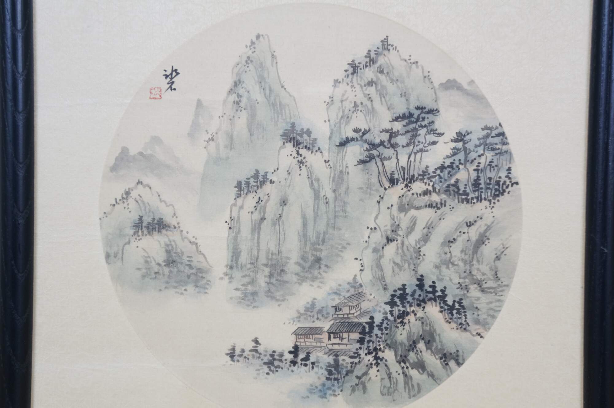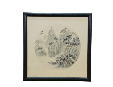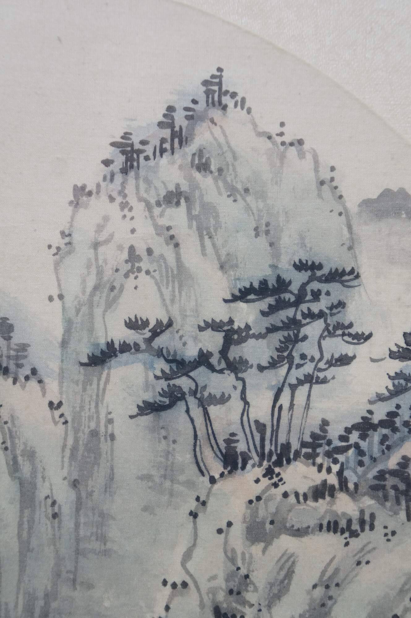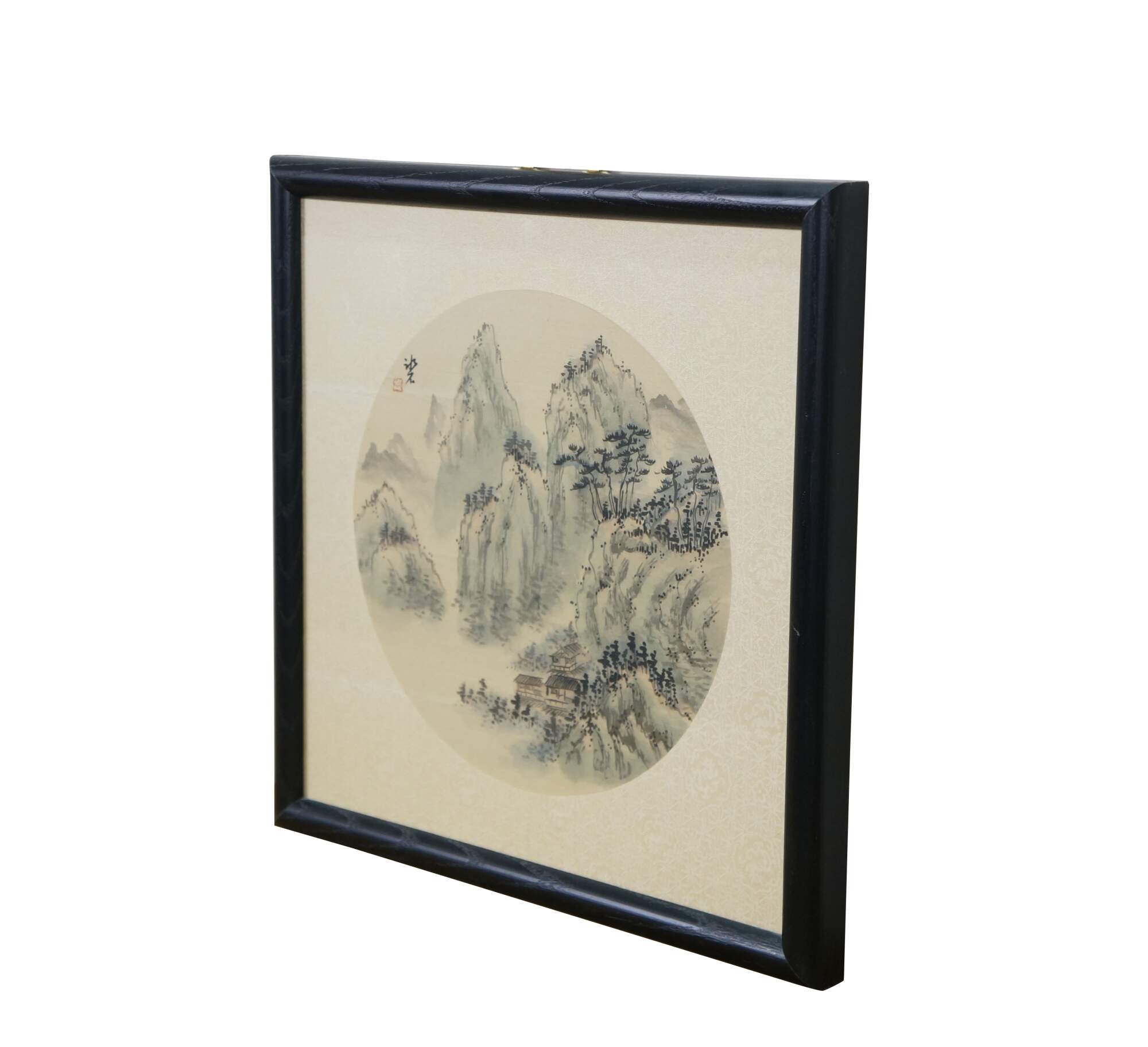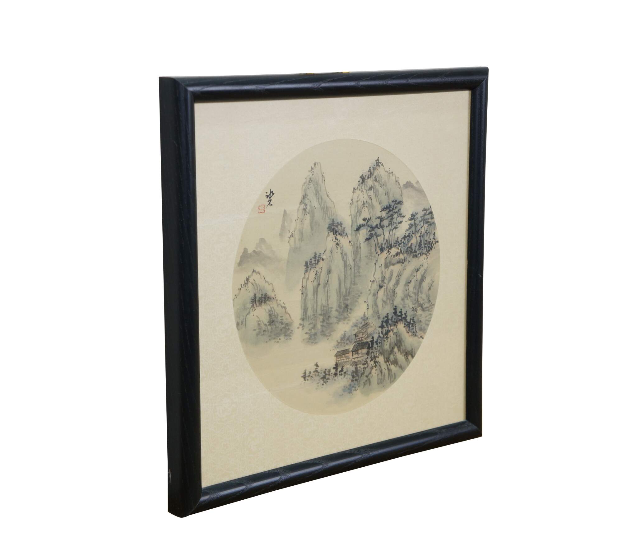 Vintage Round Chinese Shan Shui Mountain Water Landscape Painting on Silk 13"