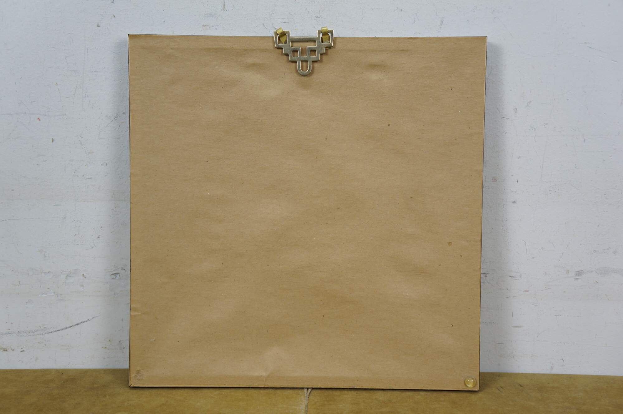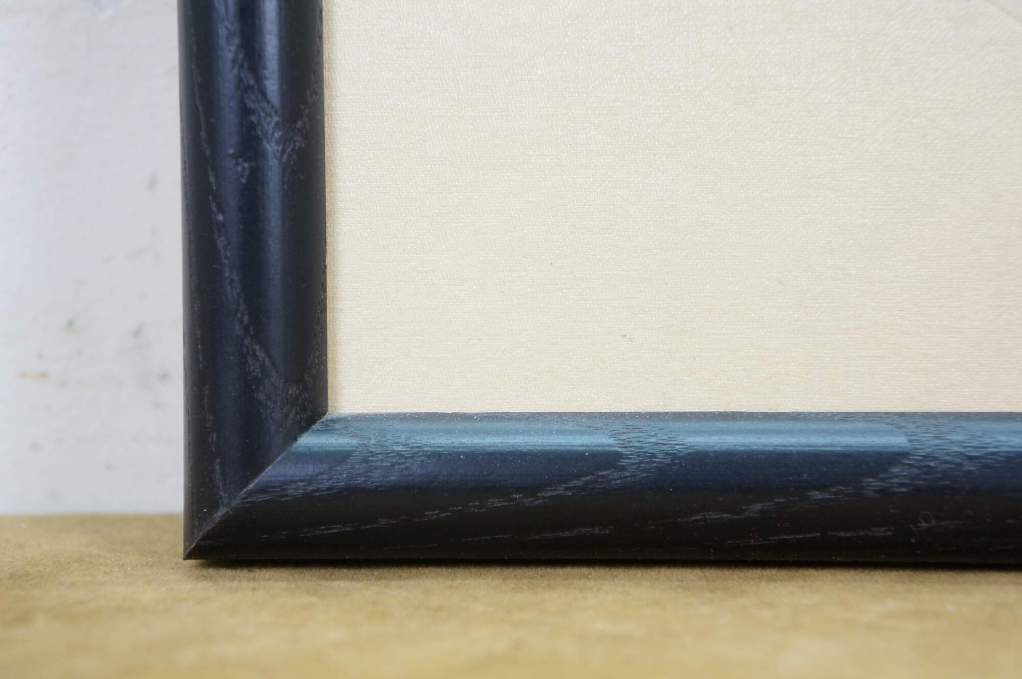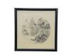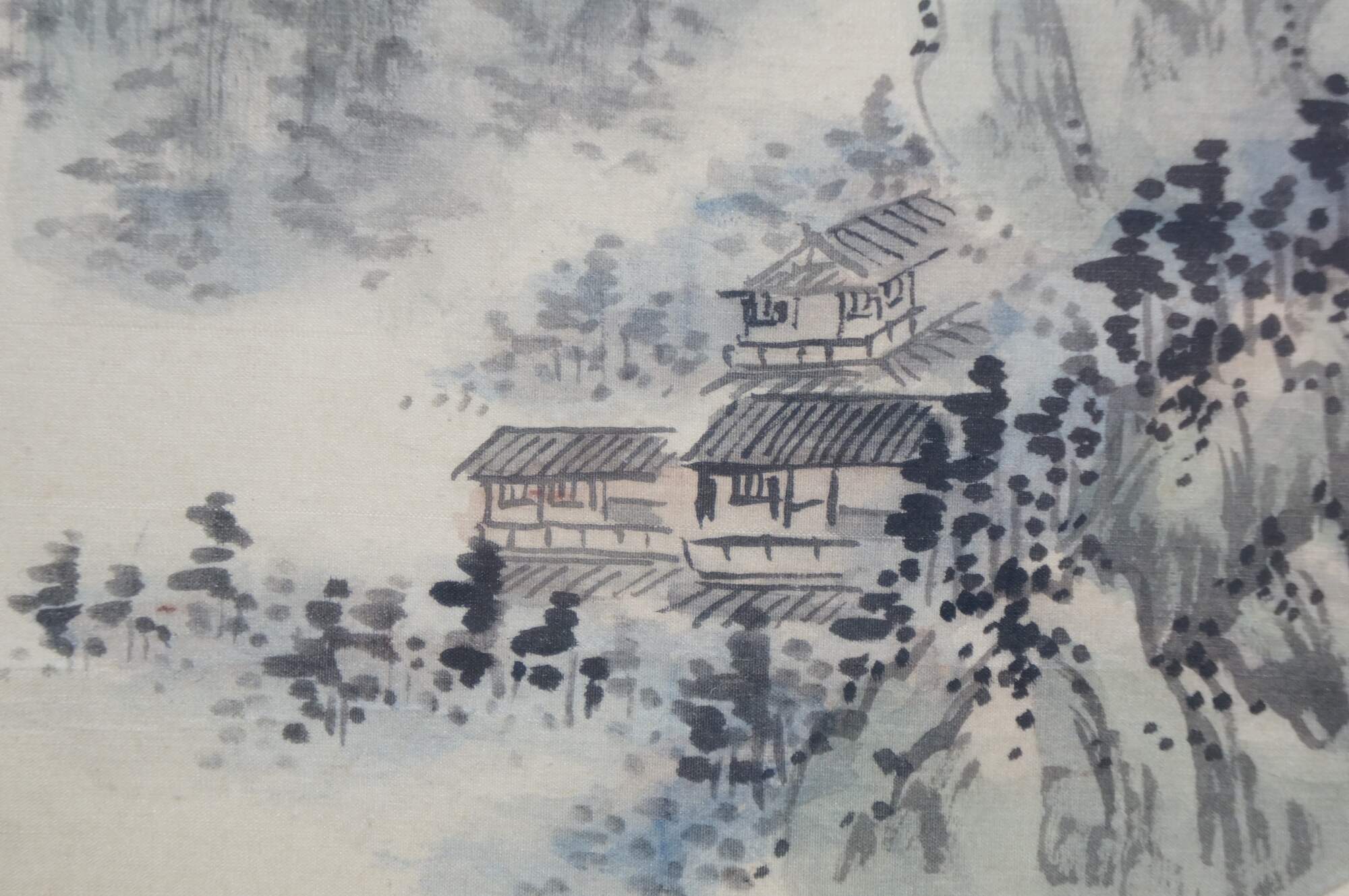 Vintage 20th century Chinese ink on silk shan shui ("mountain-water") landscape painting showing small cottages / pagodas at the foot of tall pine topped mountains in shades of gray and black. Signed / red seal, upper left. Black oak frame with decorative brass hanger; cream floral silk mat.