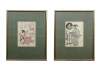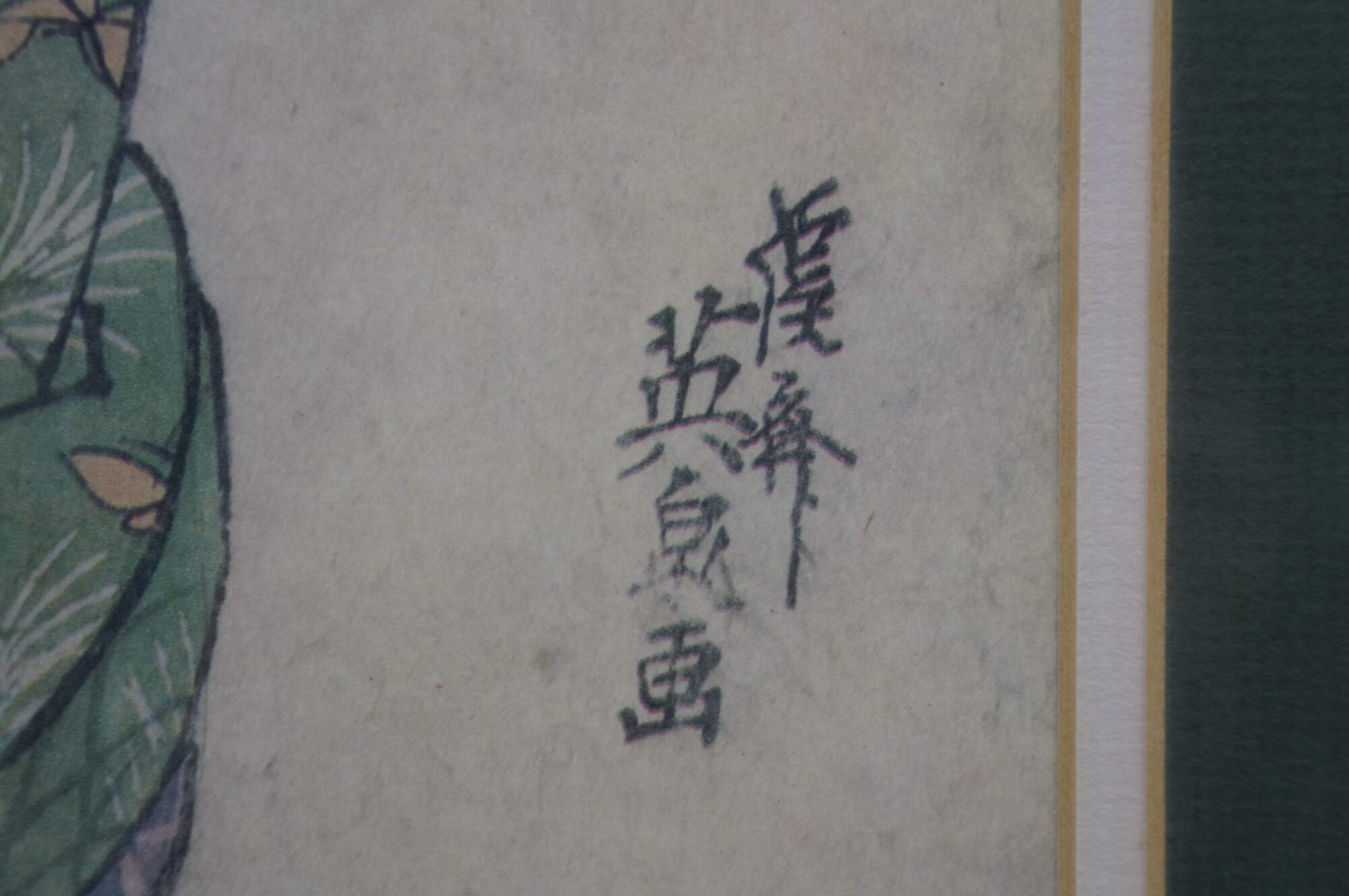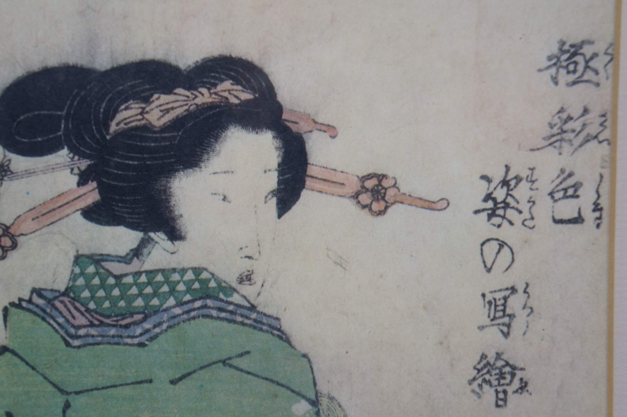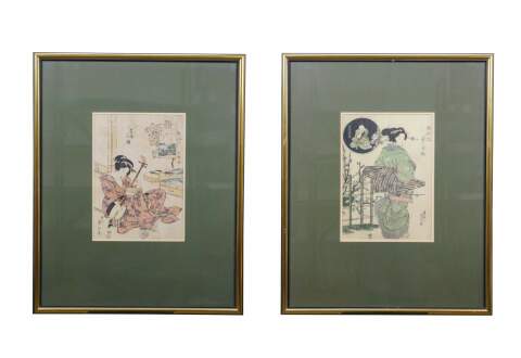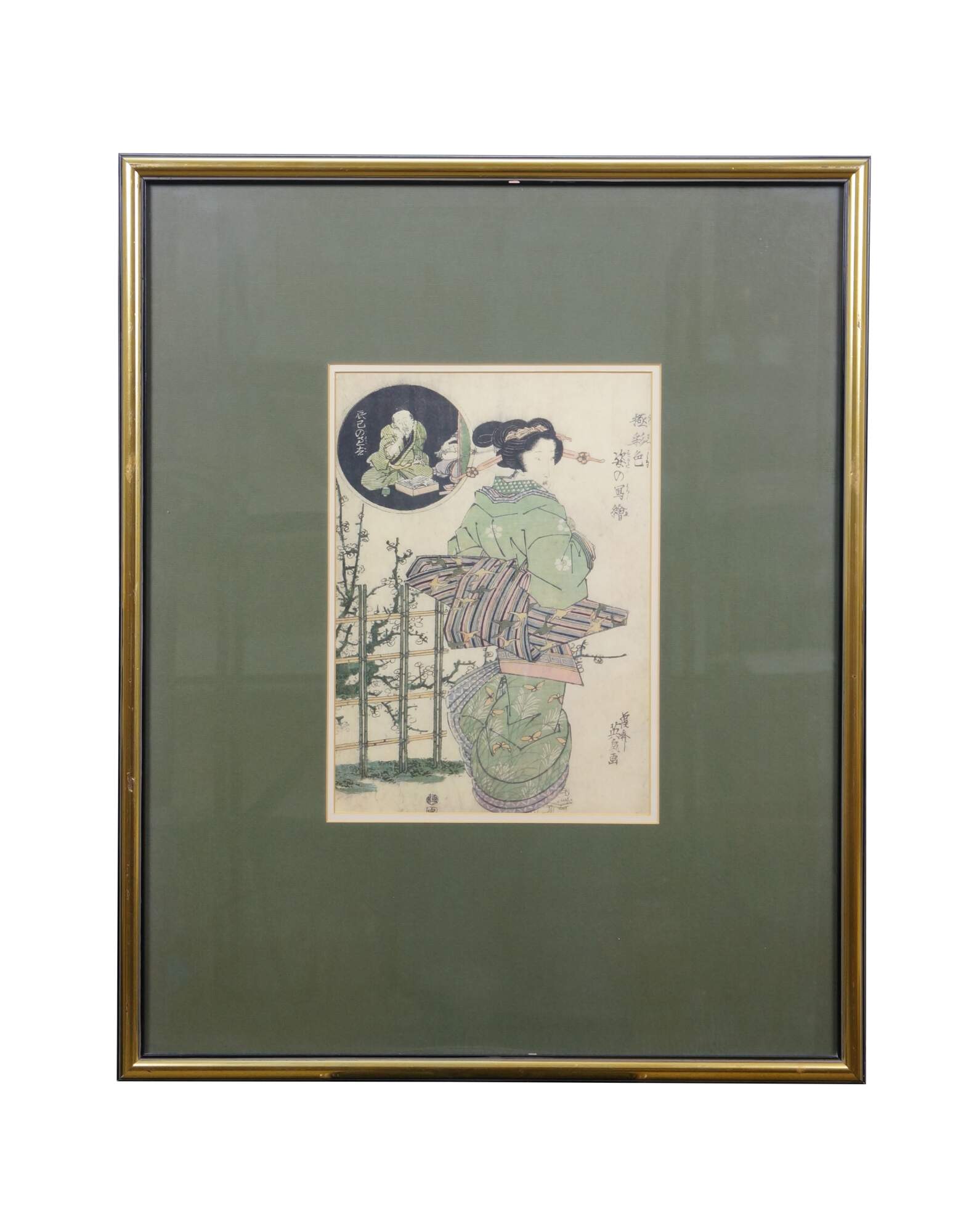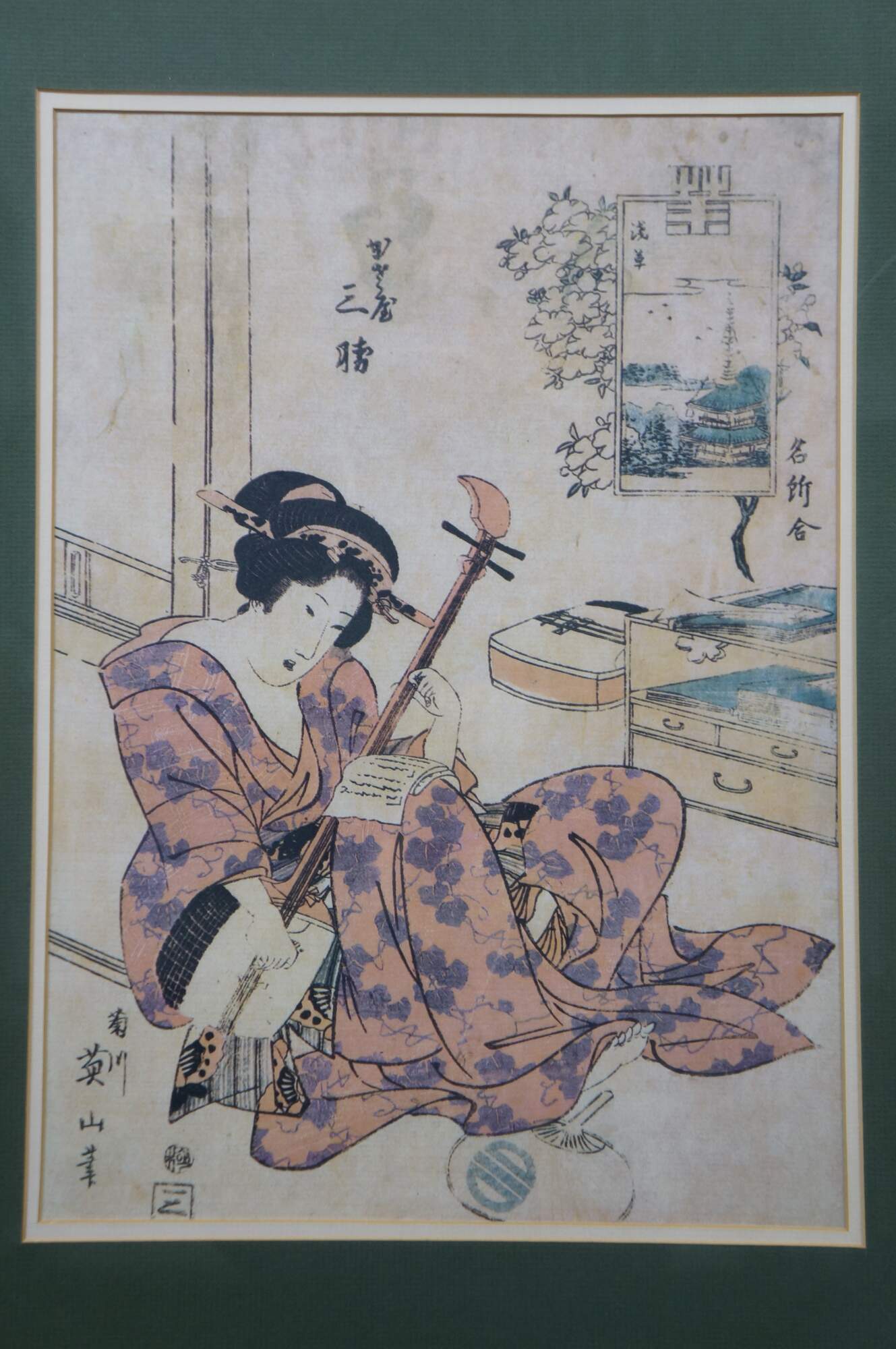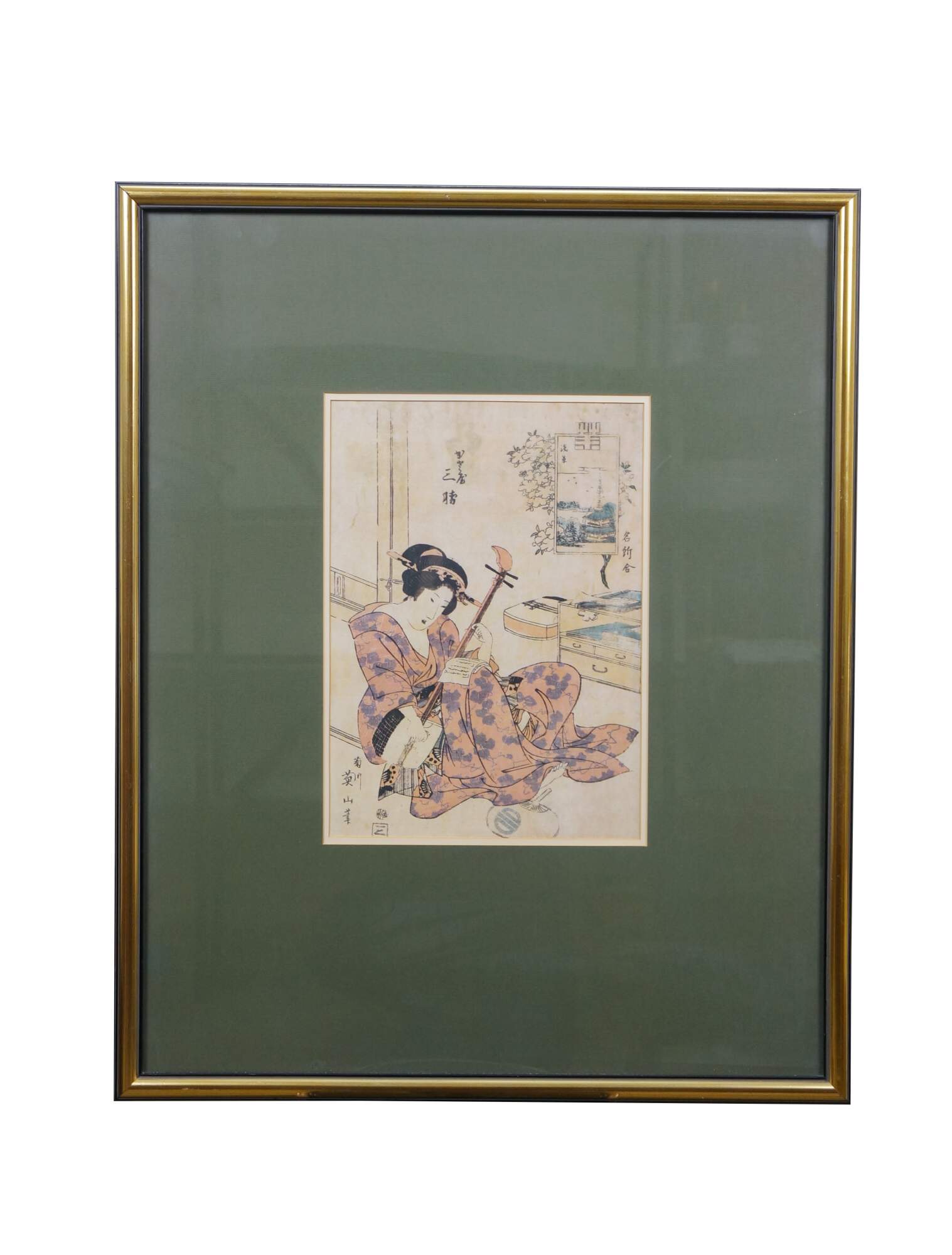 Pair of vintage 20th century Japanese woodblock prints after ukiyo-e style art of geishas / courtesans by Kikukawa Eizan. One shows a seated courtesan in a pink floral kimono playing music on a shamisen. The other shows a courtesan in green with a striped sash, walking and turning her head over her shoulder; a gentleman admirer is shown picture-in-picture in the upper corner. Black and gold composite frames; green mat.