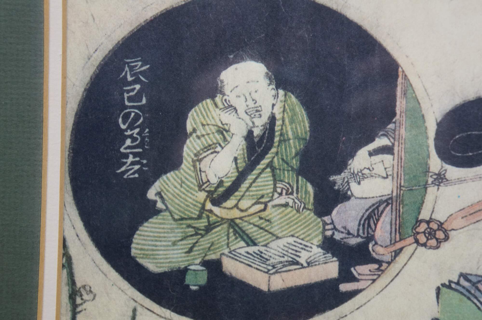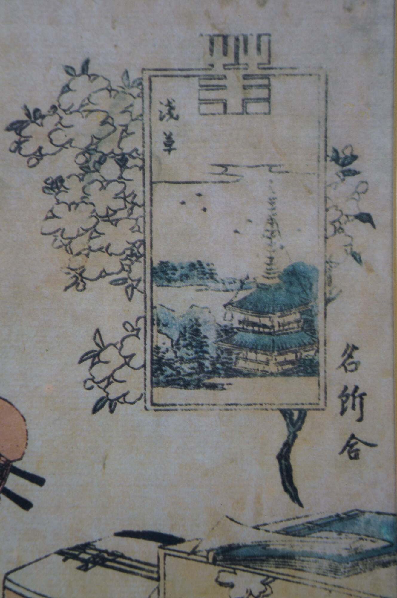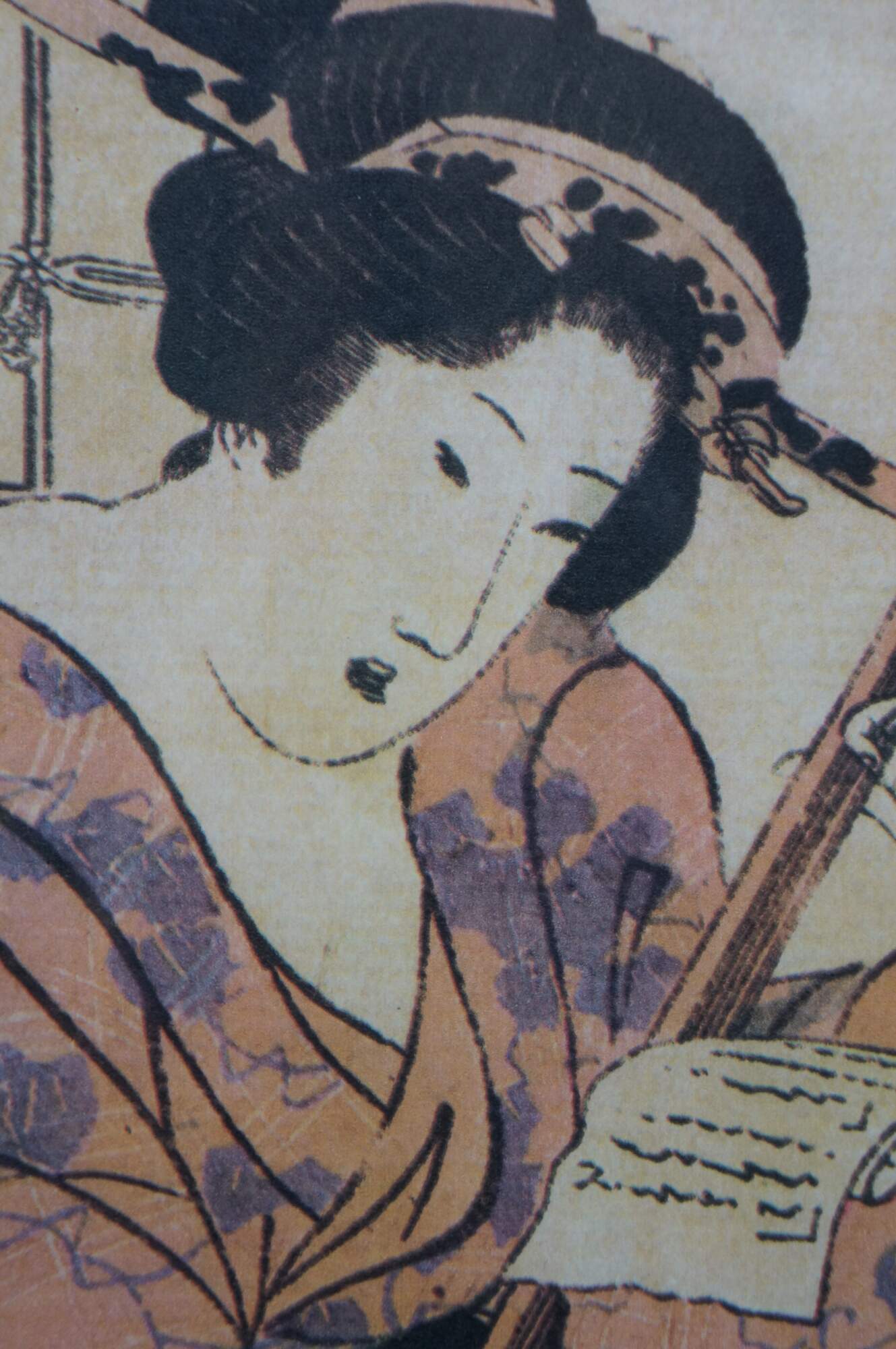 "Kikukawa Eizan (1787 – July 17, 1867) was a designer of ukiyo-e style Japanese woodblock prints. He first studied with his father, Eiji, a minor painter of the Kanō school, and subsequently with Suzuki Nanrei (1775–1844), of the Shijō school. He is believed to have also studied with ukiyo-e artist Totoya Hokkei (1790–1850). He produced numerous woodblock prints of beautiful women (bijin-ga) in the 1830s, but then abandoned printmaking in favor of painting." (Wikipedia)